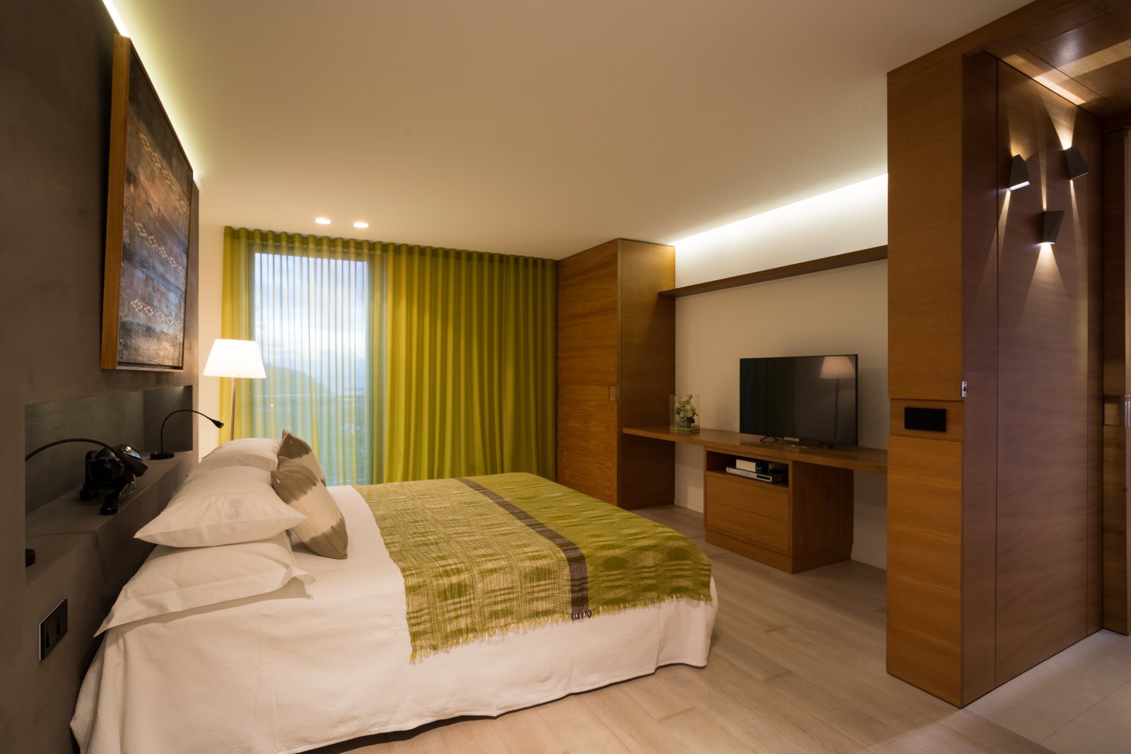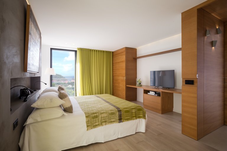 light and airy decorated room with a king-size bed facing a flat- screen TV