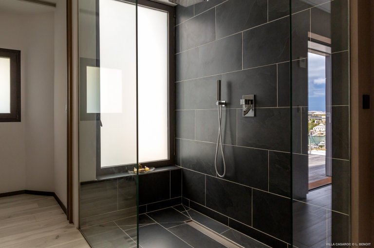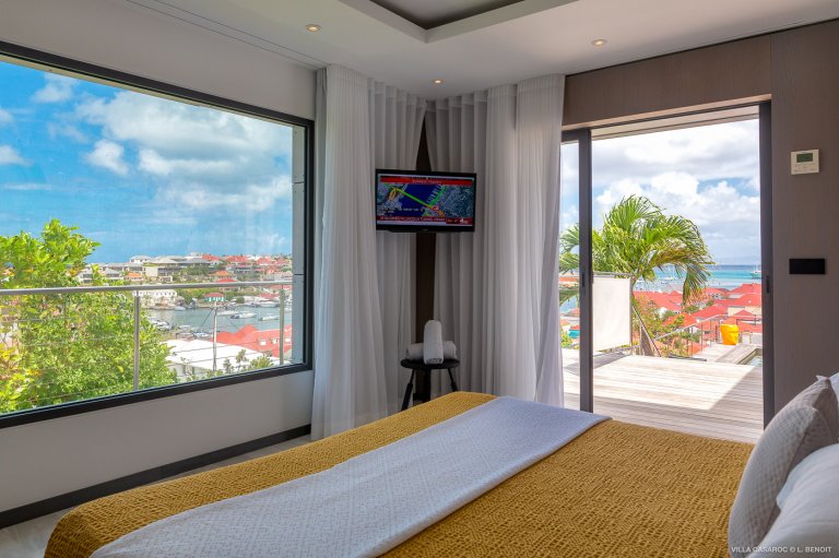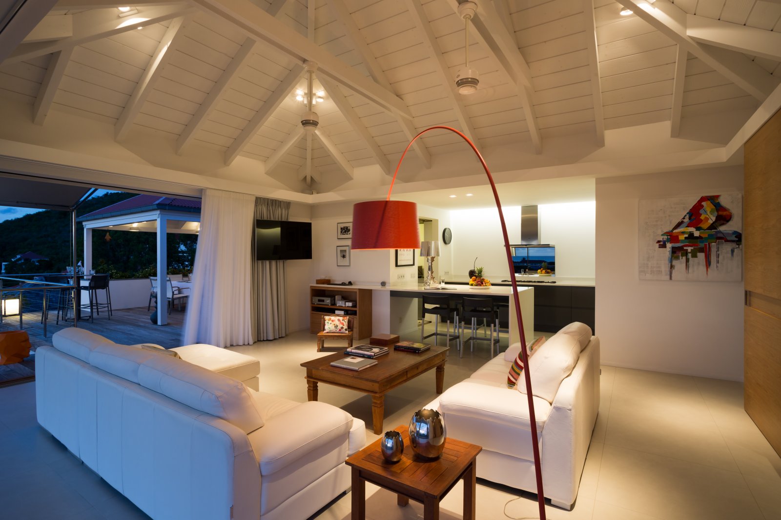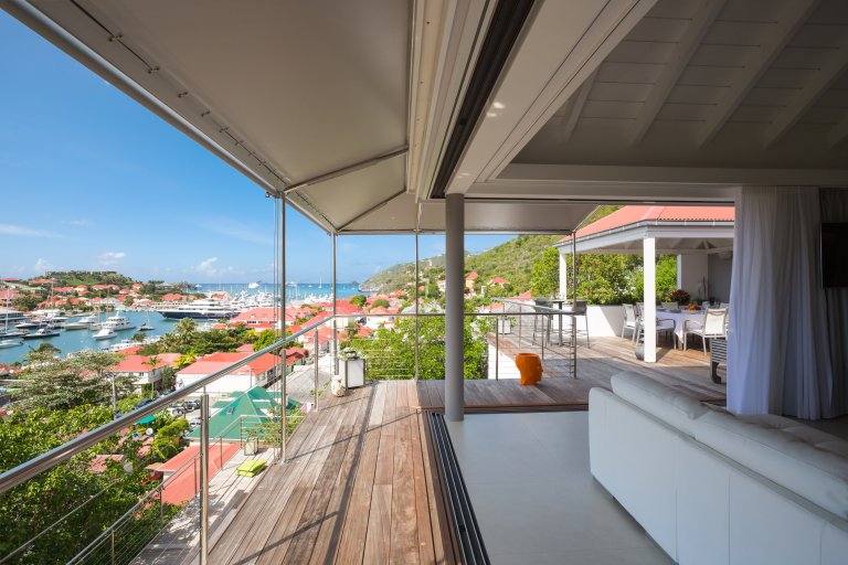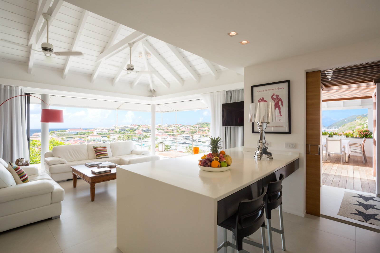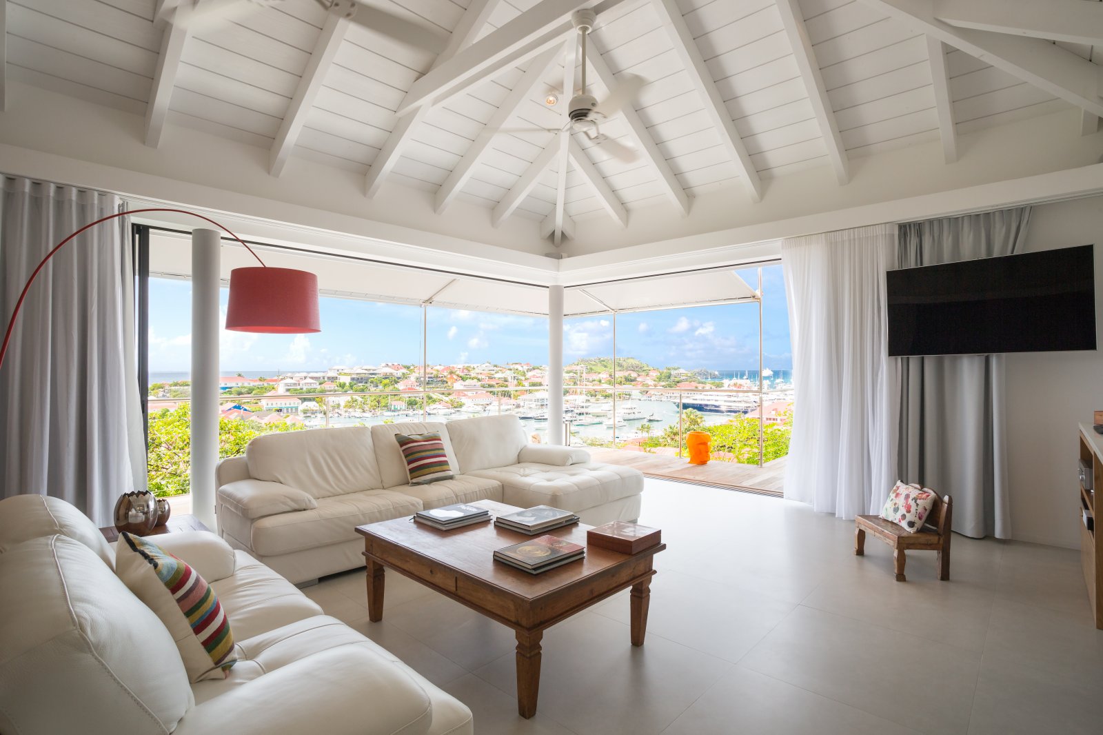 living area offers glass walls, providing you view a St. Barth’s harbor