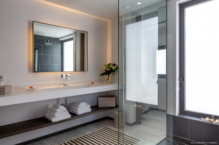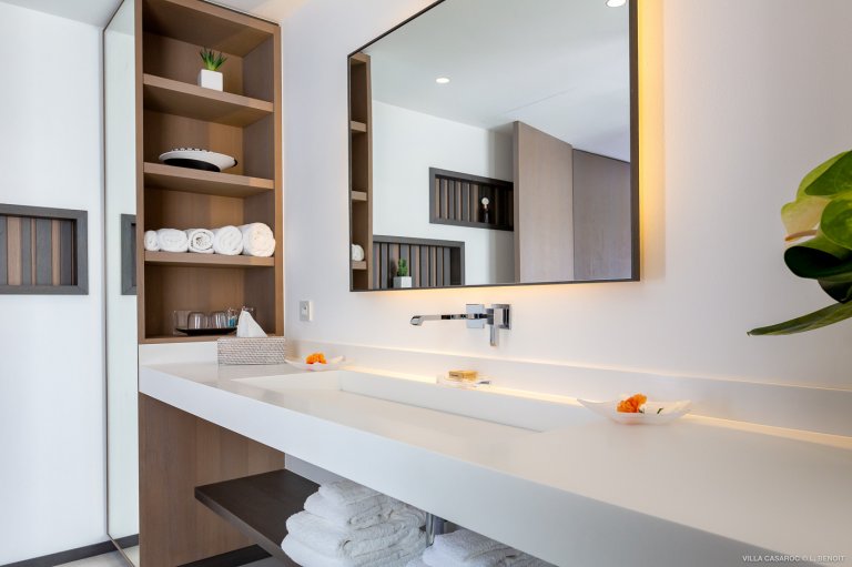plus a personalized safe for valuables. The connecting bath comes with a rain