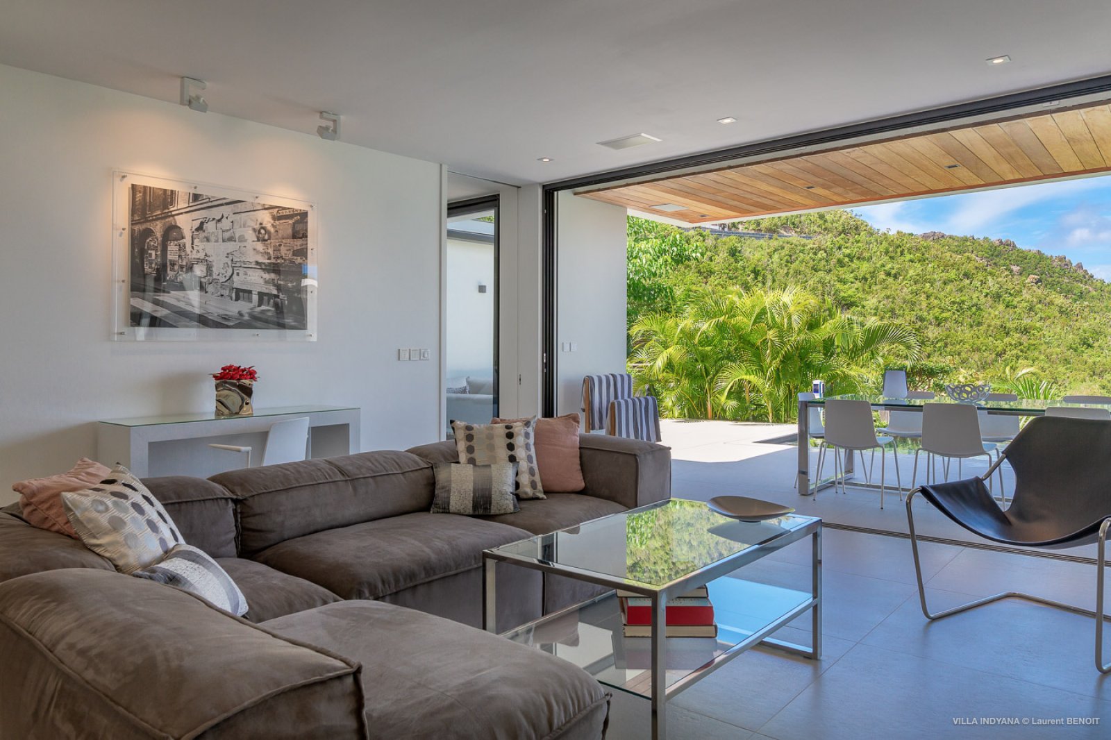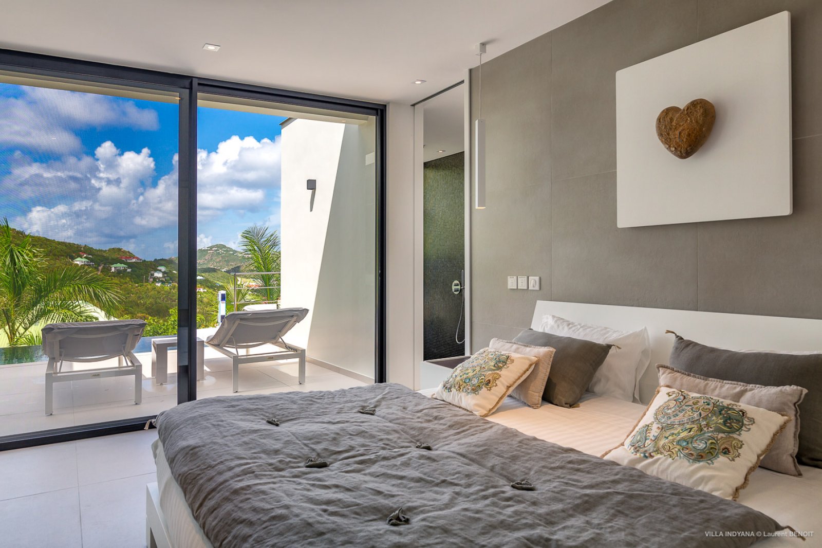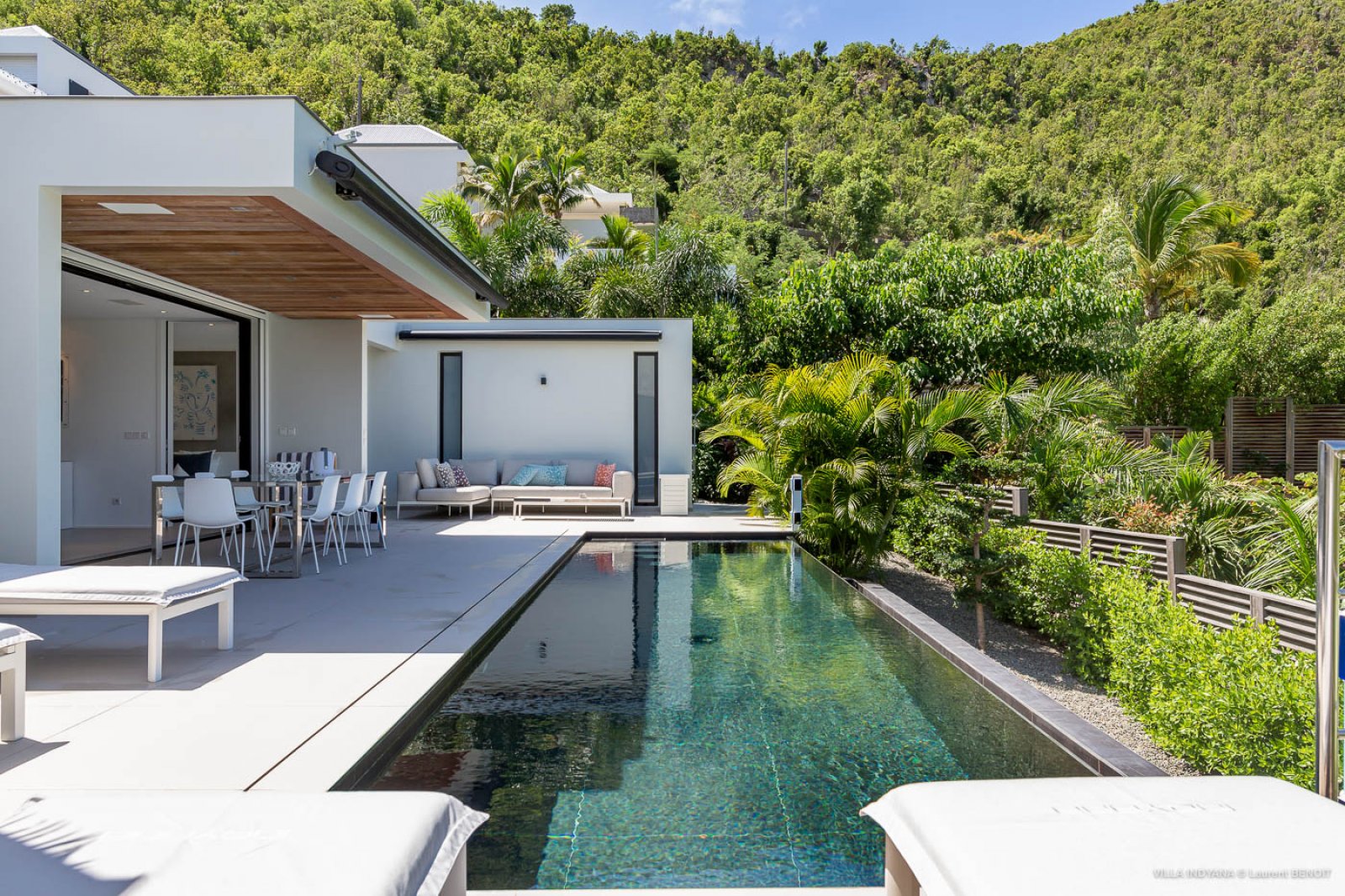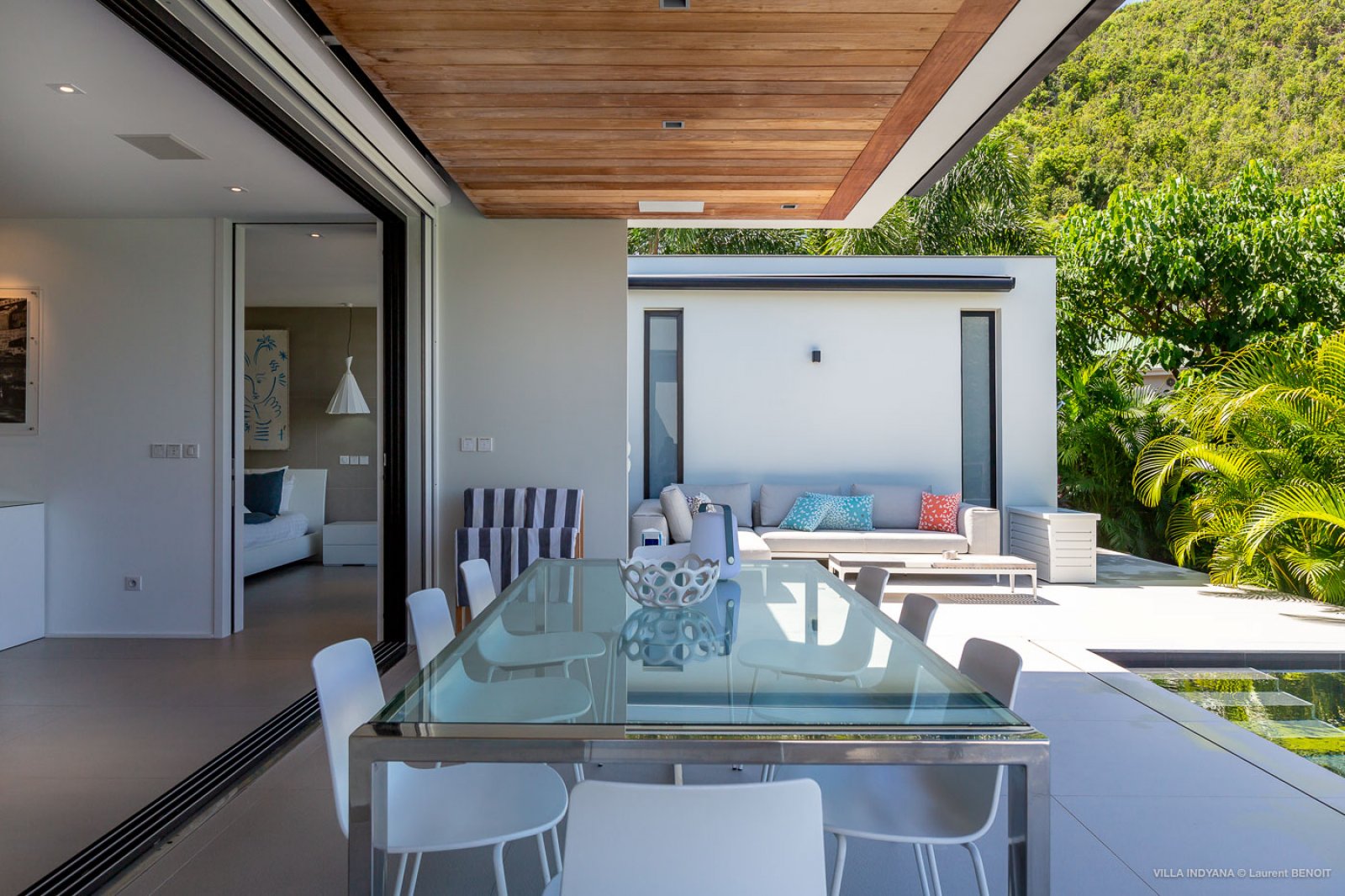 In typical St. Barth style, Villa Indyana is centered on a central great room in which a living area merges with an outdoor dining area on one side and an open kitchen on the other, separated from the seating areas by a kitchen island with a stove on one side and barstools on the other so conversation can continue to flow as dinner or breakfast is being made. The kitchen is very well equipped and has a skylight that brings more of that island sunlight into the living spaces. In addition to a dining table that comfortably seats eight, the outdoor area includes a sun-soaked conversation area with couches and a low coffee table, sunbeds that can be shaded or sunny depending on their location and the time of day, and an enticing infinity pool lined in dark slate gray.