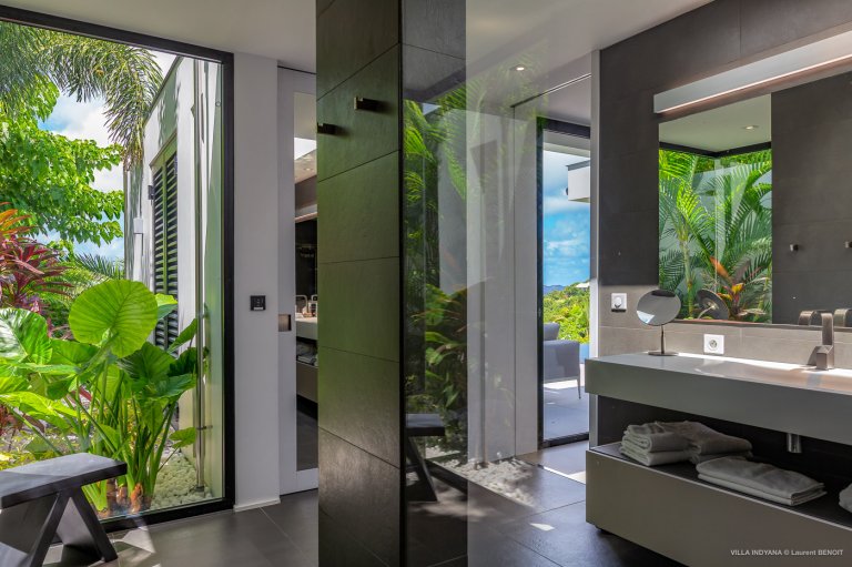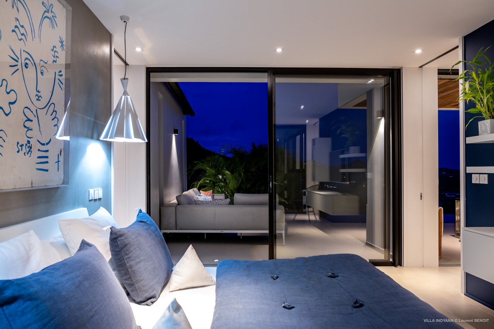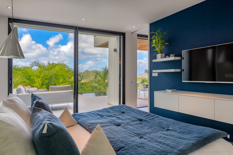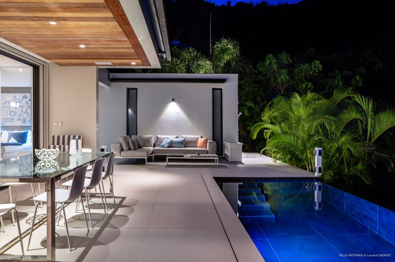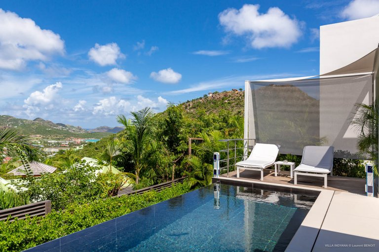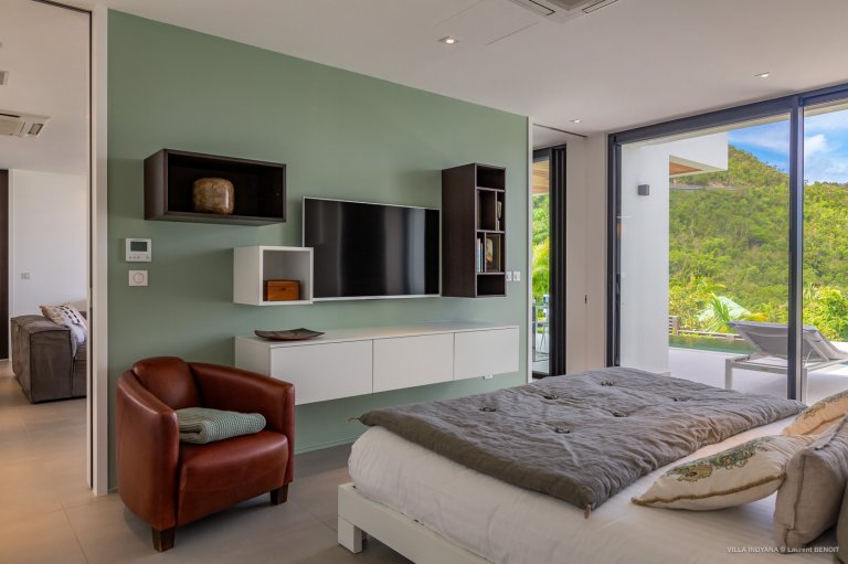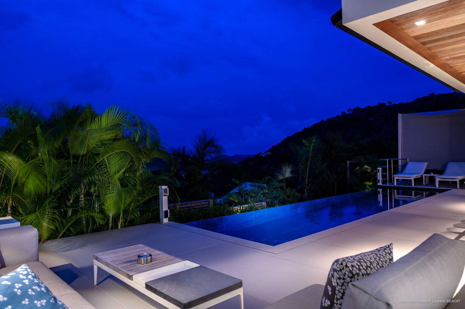 In typical St. Barth style, Villa Indyana is centered on a central great room in which a living area merges with an outdoor dining area on one side and an open kitchen on the other, separated from the seating areas by a kitchen island with a stove on one side and barstools on the other so conversation can continue to flow as dinner or breakfast is being made. The kitchen is very well equipped and has a skylight that brings more of that island sunlight into the living spaces. In addition to a dining table that comfortably seats eight, the outdoor area includes a sun-soaked conversation area with couches and a low coffee table, sunbeds that can be shaded or sunny depending on their location and the time of day, and an enticing infinity pool lined in dark slate gray.