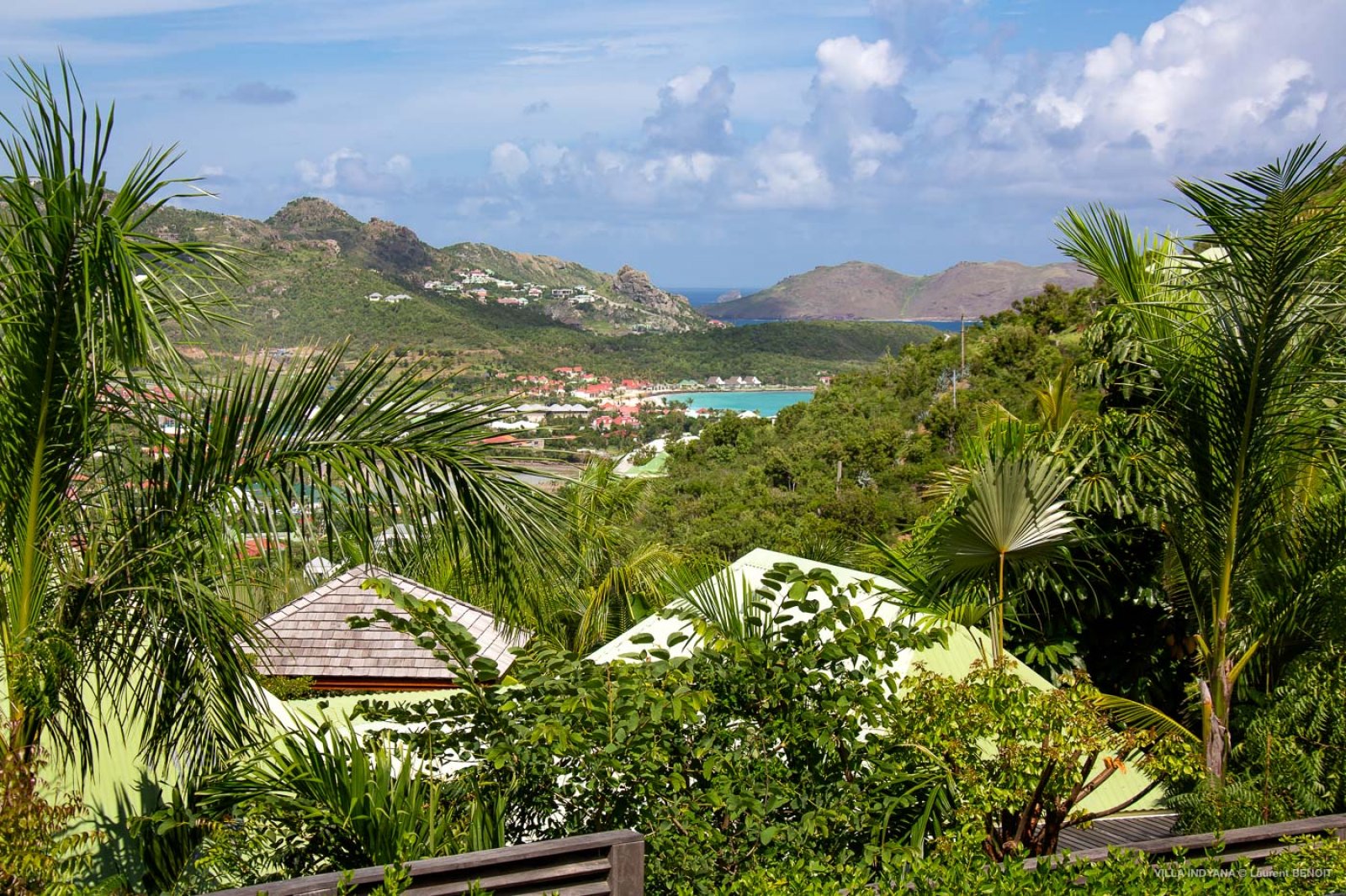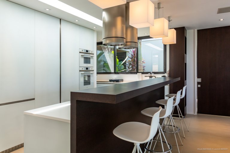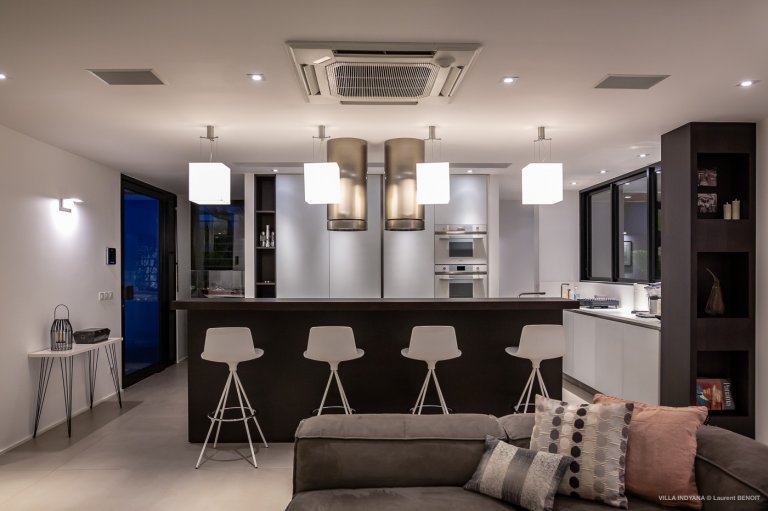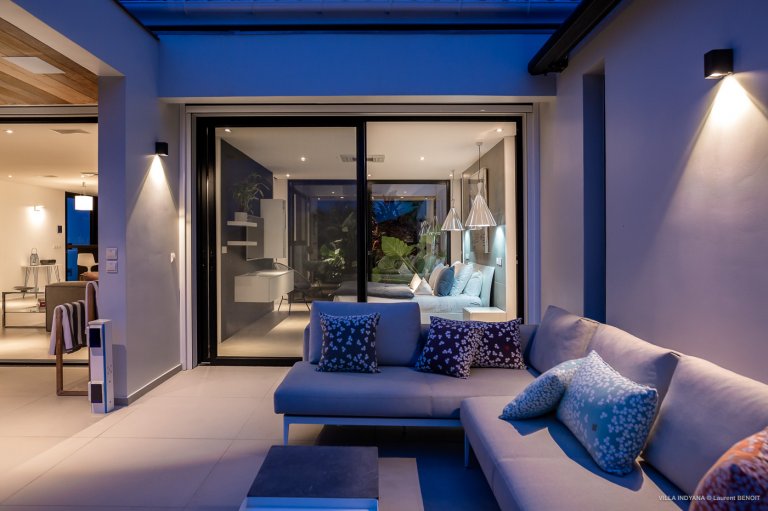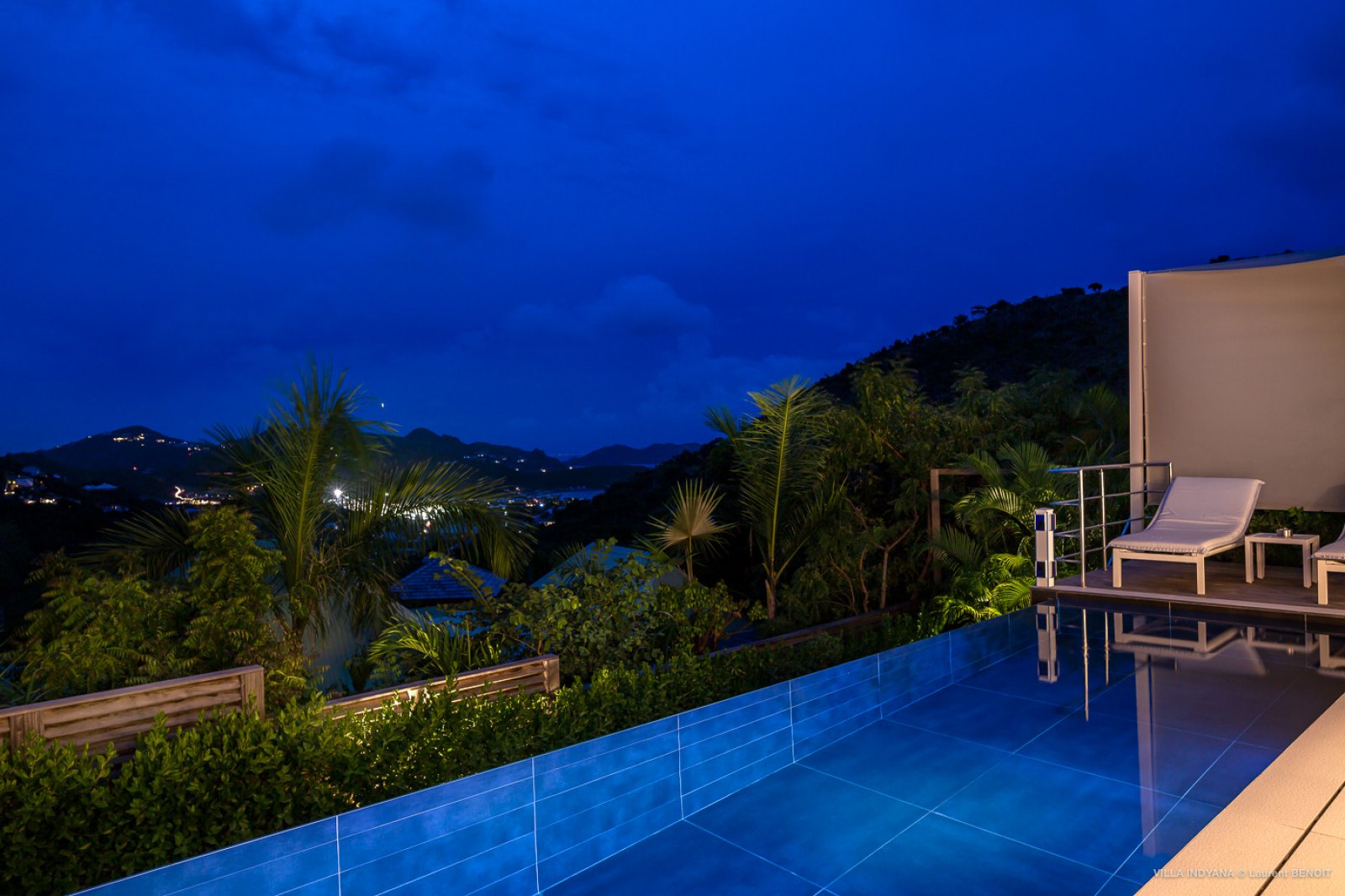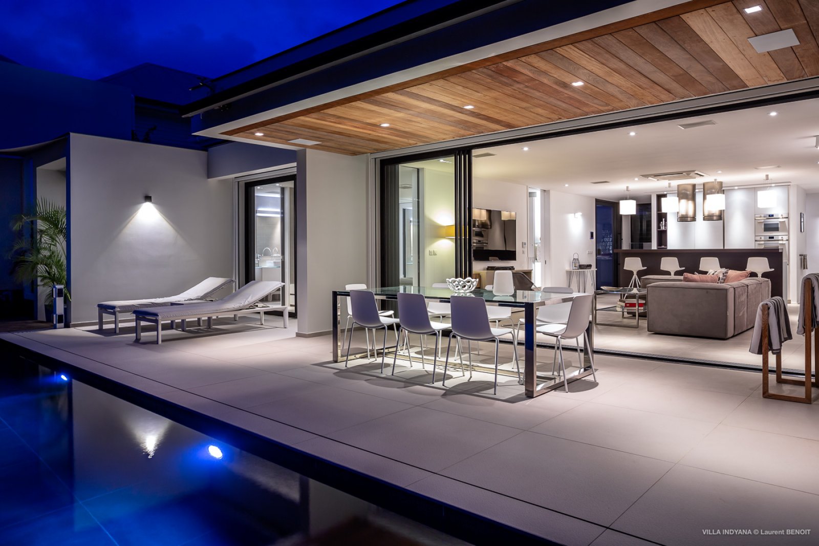 In typical St. Barth style, Villa Indyana is centered on a central great room in which a living area merges with an outdoor dining area on one side and an open kitchen on the other, separated from the seating areas by a kitchen island with a stove on one side and barstools on the other so conversation can continue to flow as dinner or breakfast is being made. The kitchen is very well equipped and has a skylight that brings more of that island sunlight into the living spaces. In addition to a dining table that comfortably seats eight, the outdoor area includes a sun-soaked conversation area with couches and a low coffee table, sunbeds that can be shaded or sunny depending on their location and the time of day, and an enticing infinity pool lined in dark slate gray.