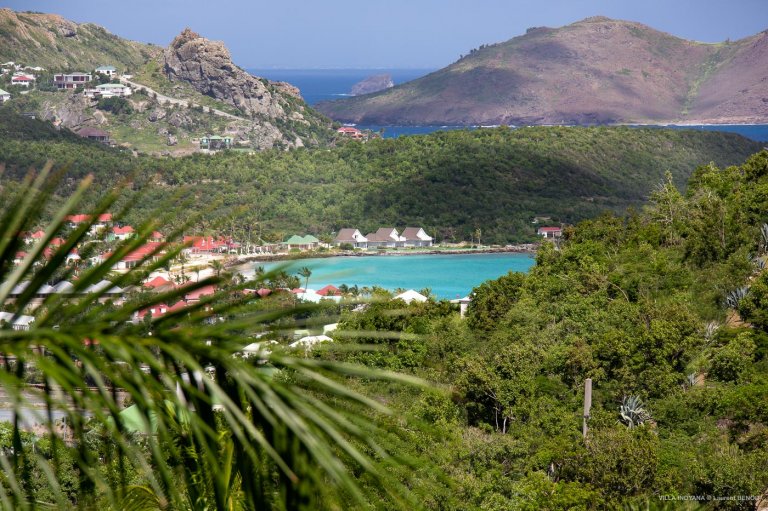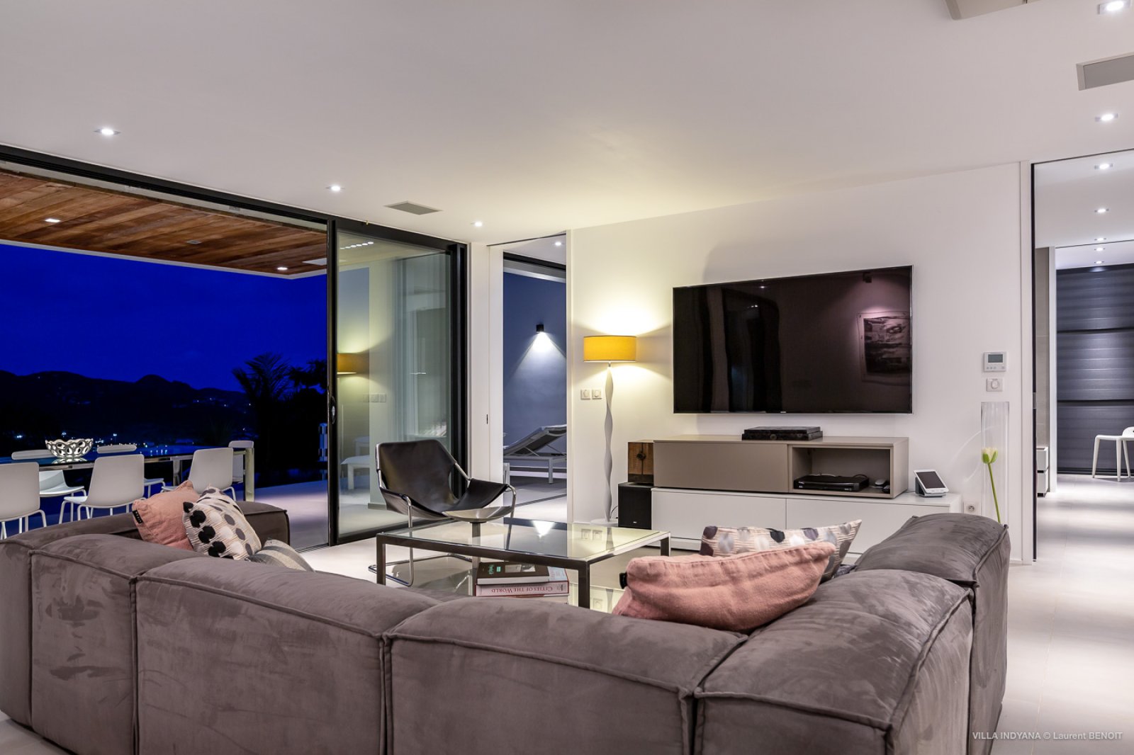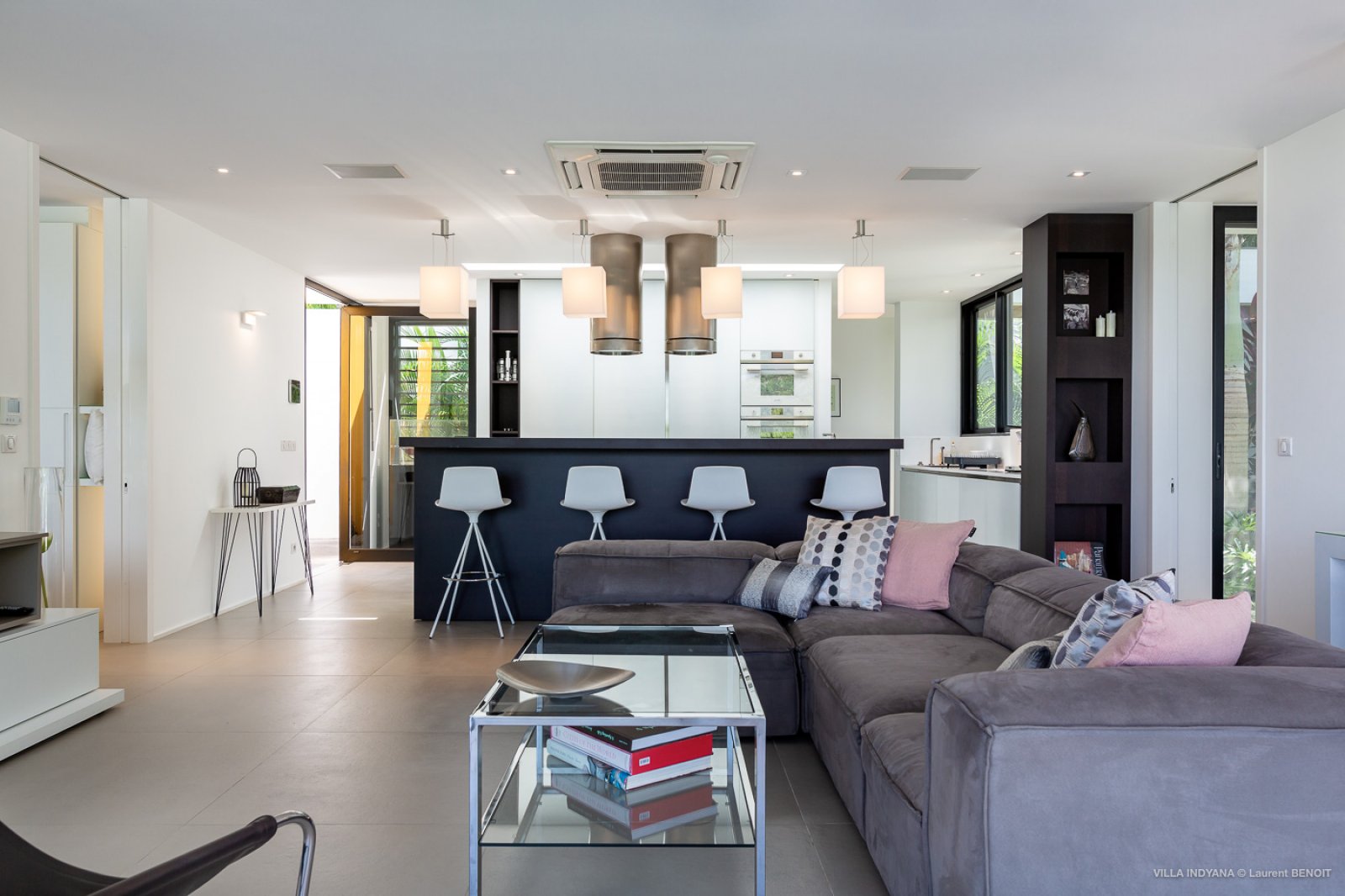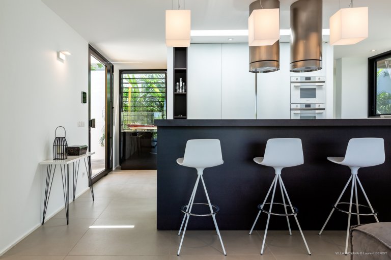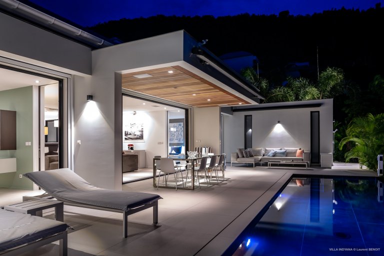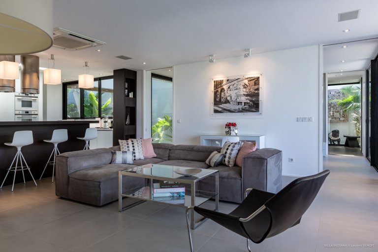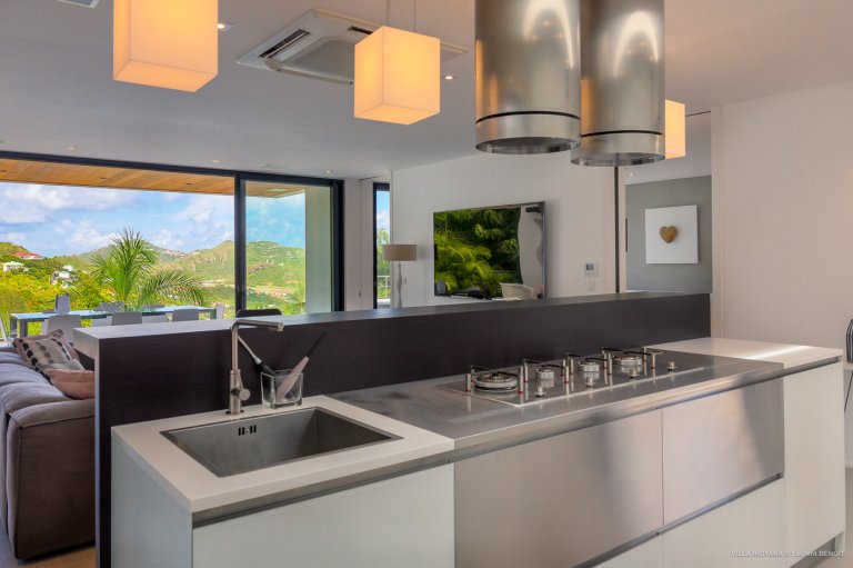 Clean-lined and artfully designed in a palette of cool, soothing slate and charcoal grays, white and a few carefully deployed pops of color, the newly built Villa Indyana overlooks a landscape of green rolling hills, palms, orange flamboyant trees and open blue skies. The luxury rental home is well suited to small families who want to live simply but comfortably. It is a place where feeling Caribbean-carefree comes naturally, especially if you have let the detail-oriented concierge handle the logistics for you.