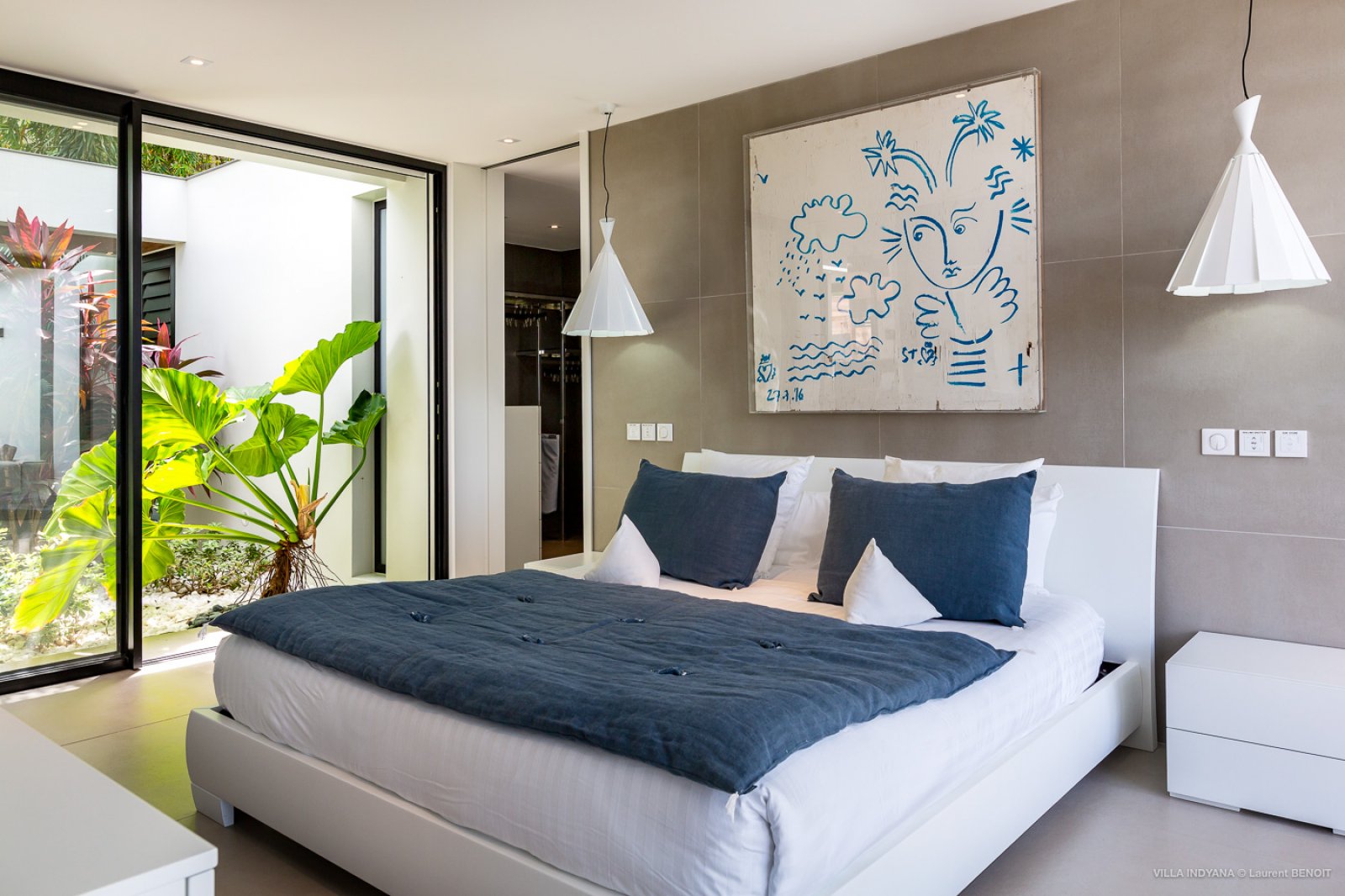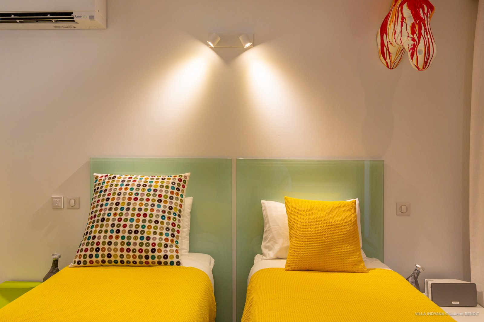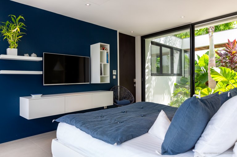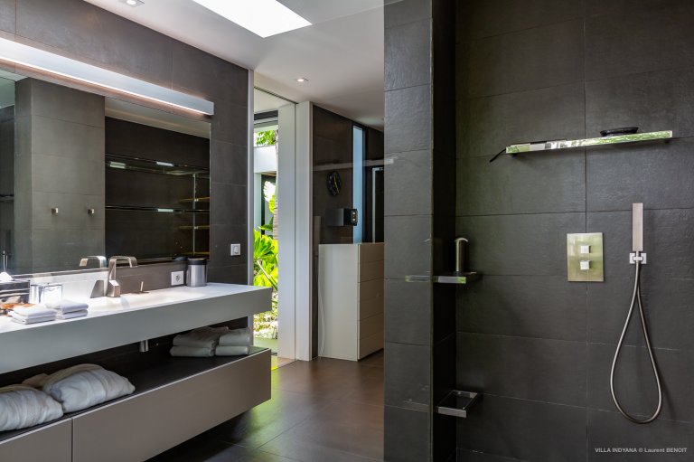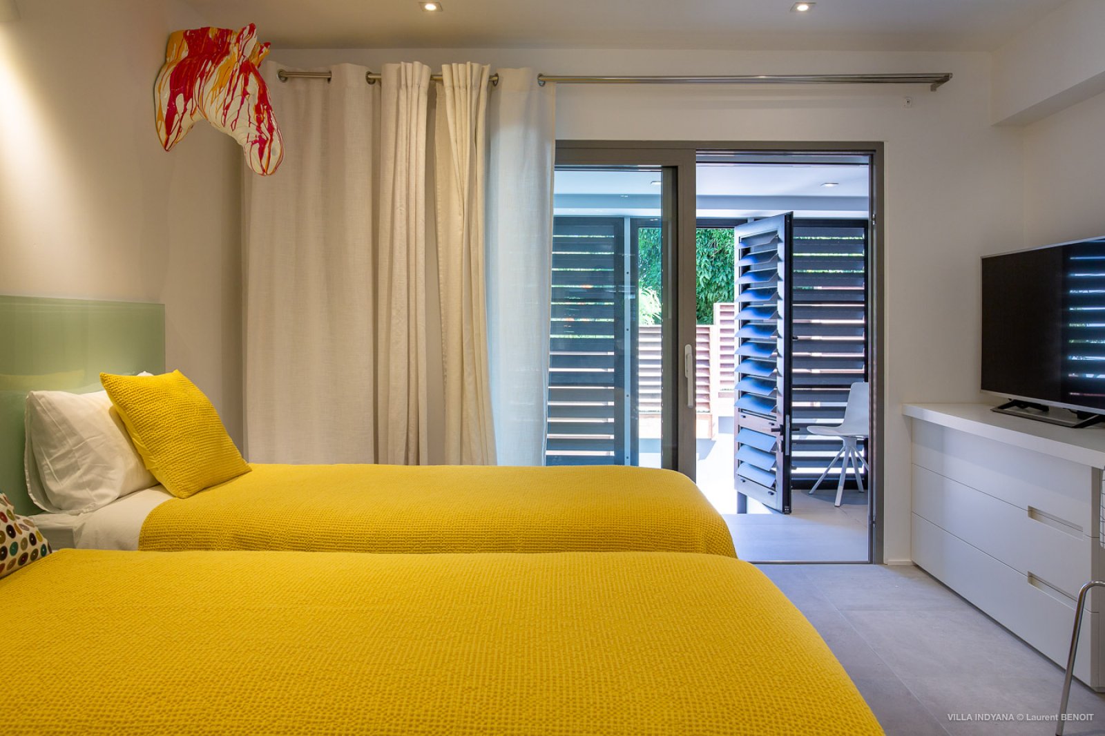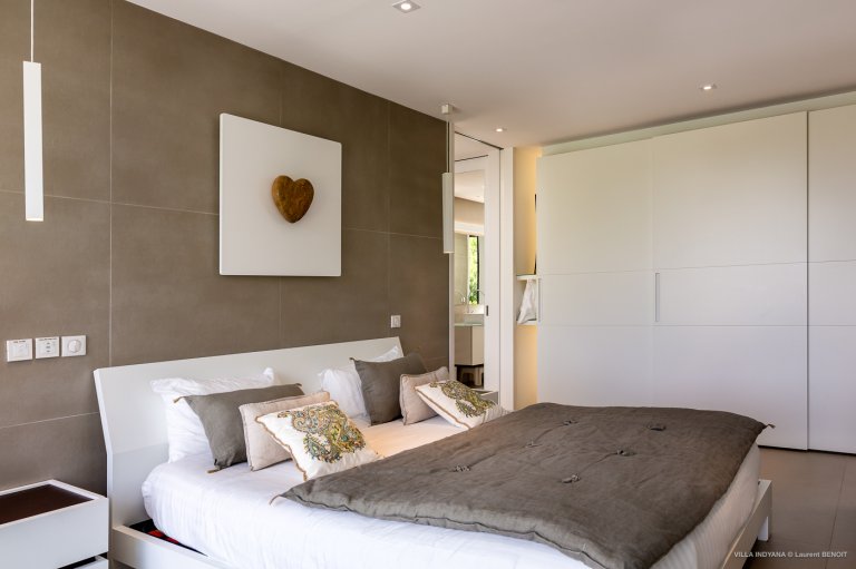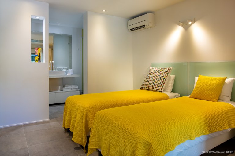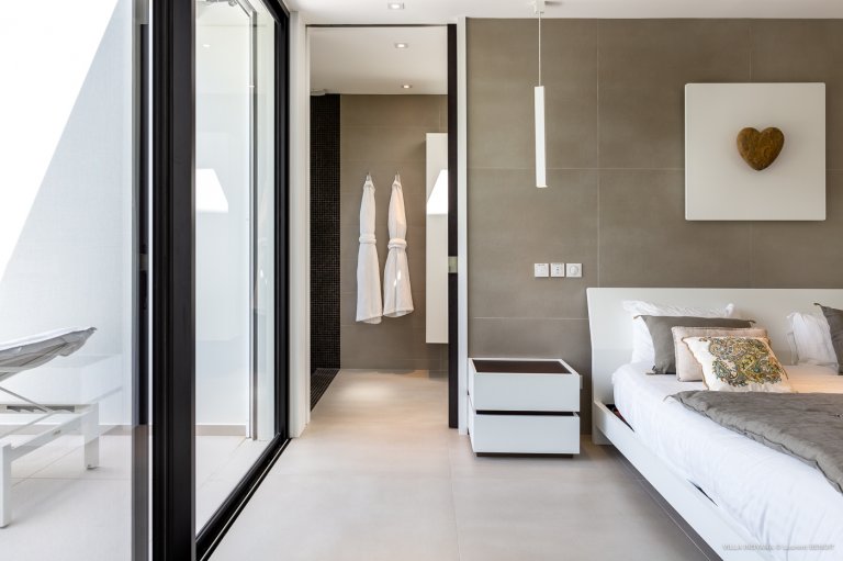 The two bedrooms lie on opposite sides of the living area. Both have king beds, direct access to the terrace through sliding glass doors, and large ensuite bathrooms. One of them also has a separate dressing area, and the other has double vanities and a skylight. An independent studio has recently been built which allows the villa to be rented in 3 bedrooms.