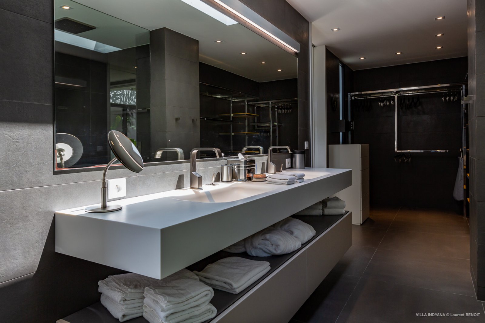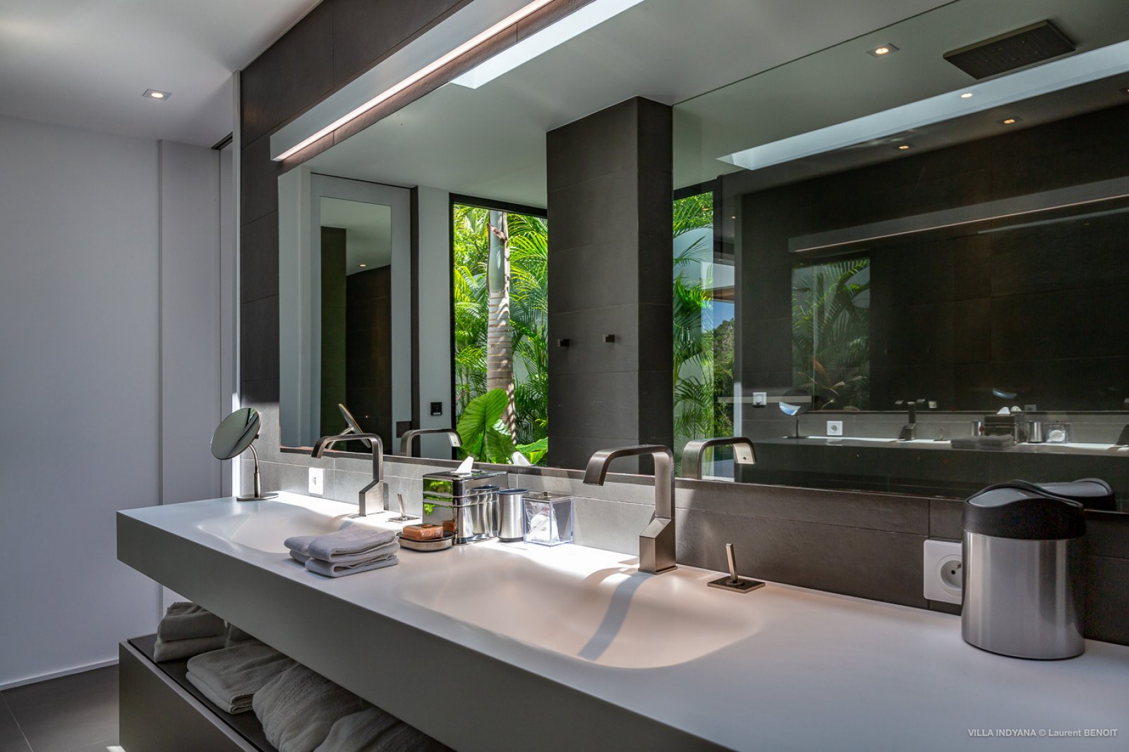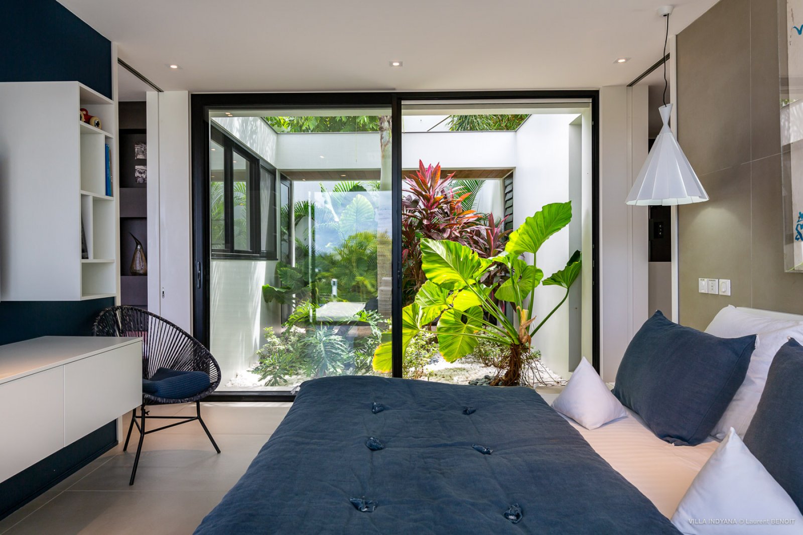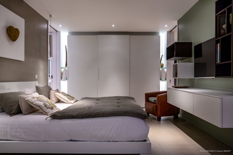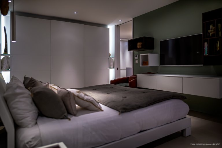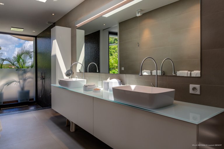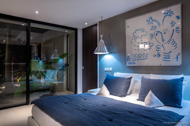 The two bedrooms lie on opposite sides of the living area. Both have king beds, direct access to the terrace through sliding glass doors, and large ensuite bathrooms. One of them also has a separate dressing area, and the other has double vanities and a skylight. An independent studio has recently been built which allows the villa to be rented in 3 bedrooms.