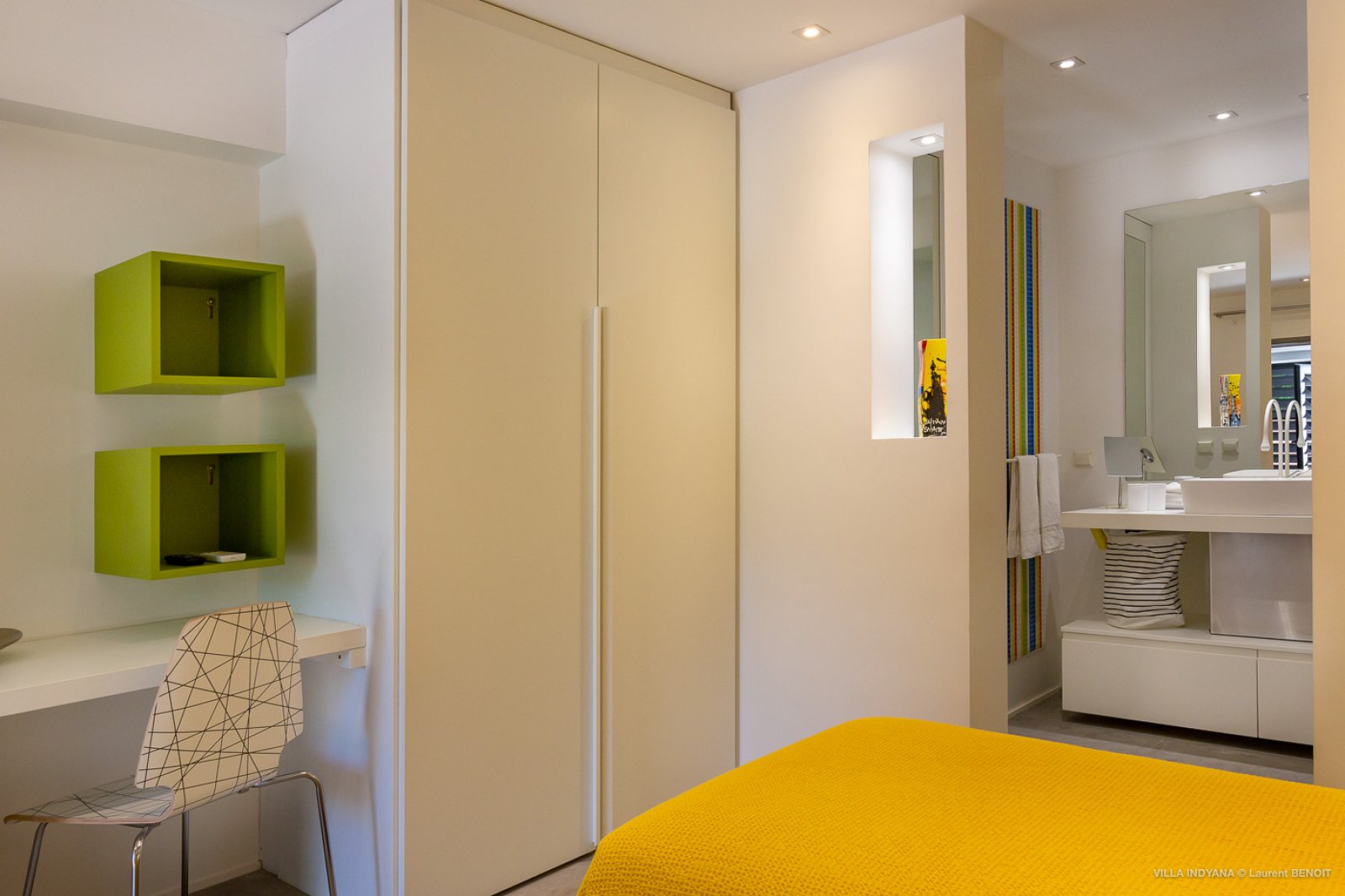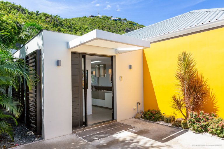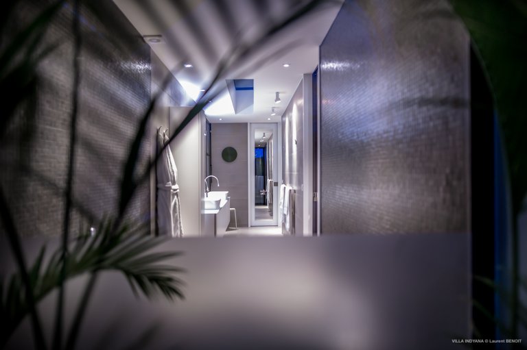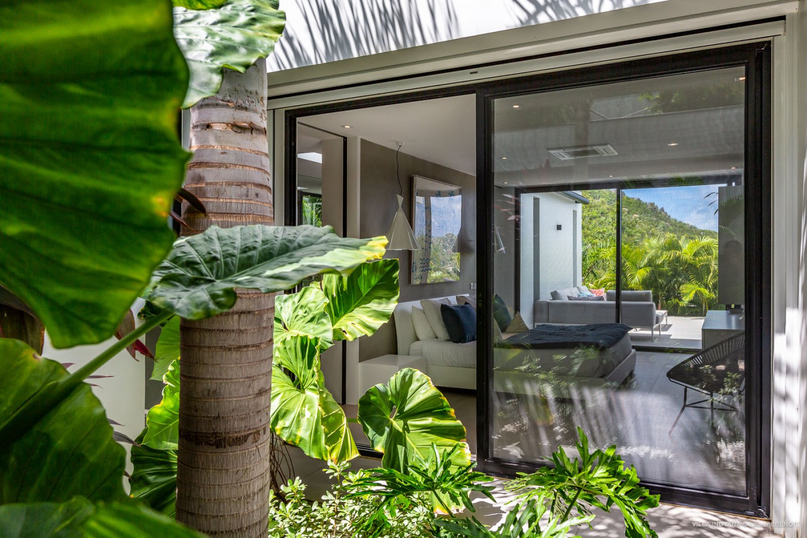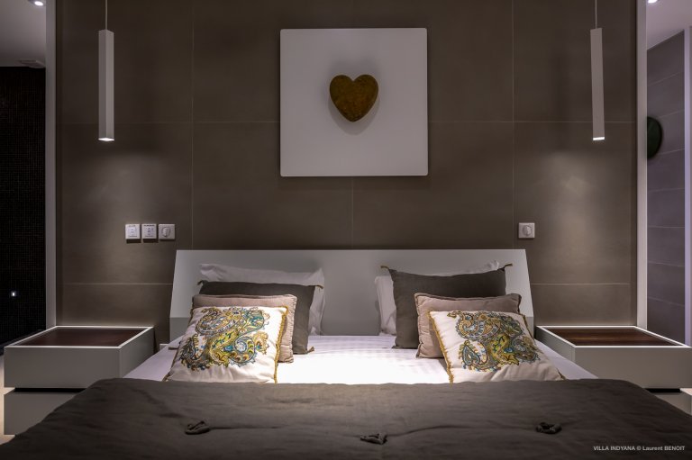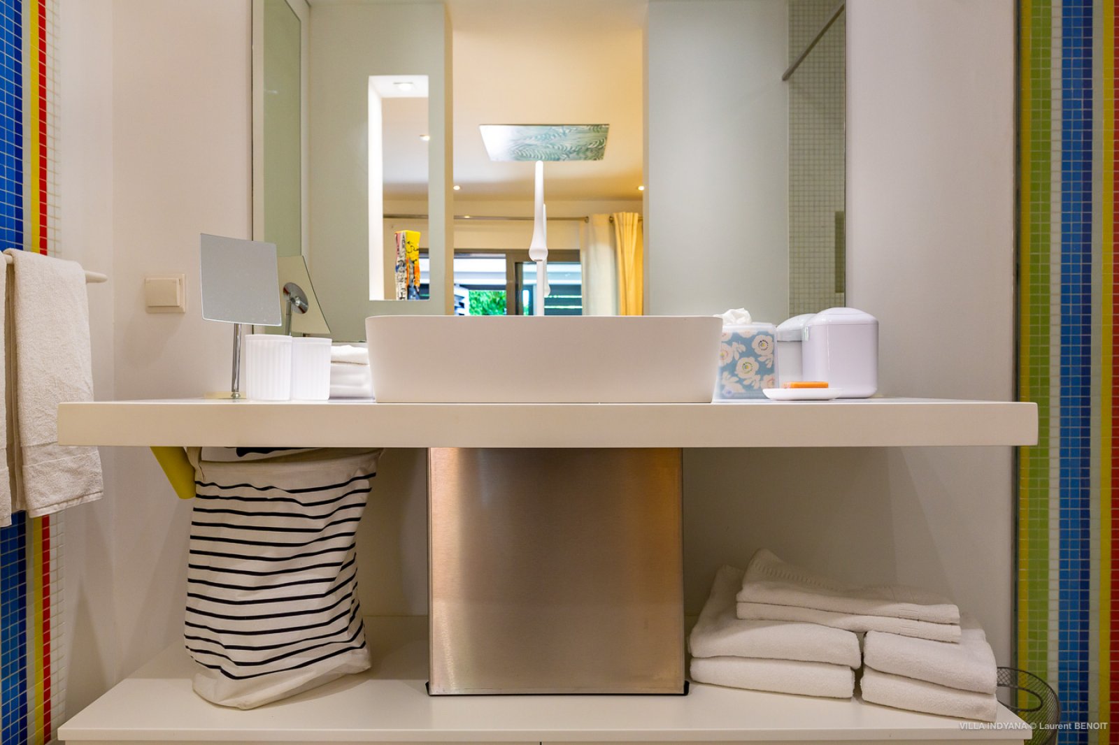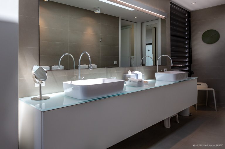 The two bedrooms lie on opposite sides of the living area. Both have king beds, direct access to the terrace through sliding glass doors, and large ensuite bathrooms. One of them also has a separate dressing area, and the other has double vanities and a skylight. An independent studio has recently been built which allows the villa to be rented in 3 bedrooms.
