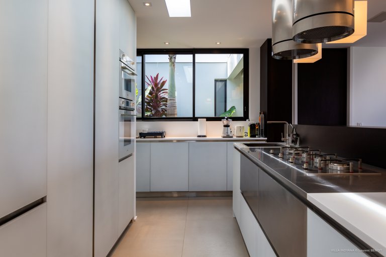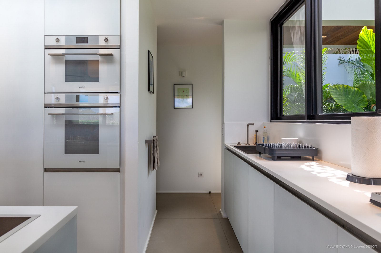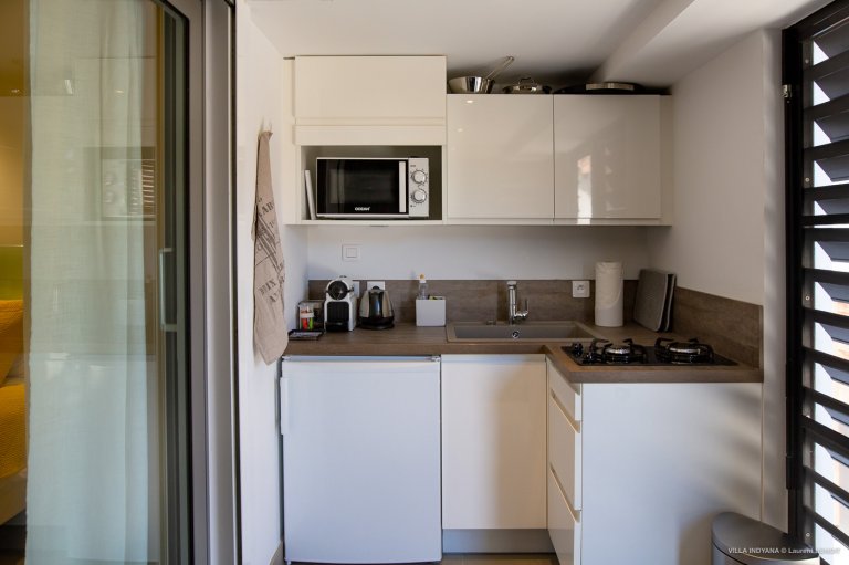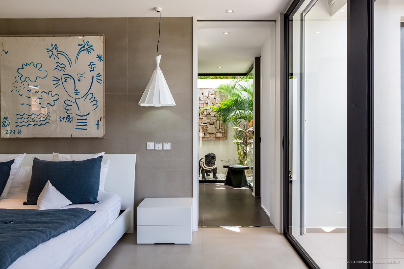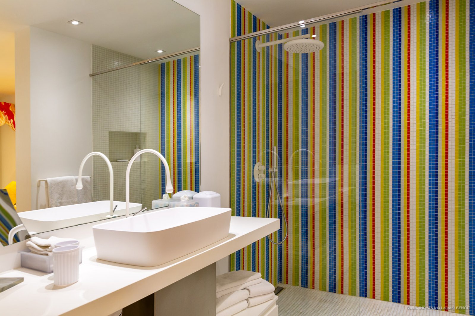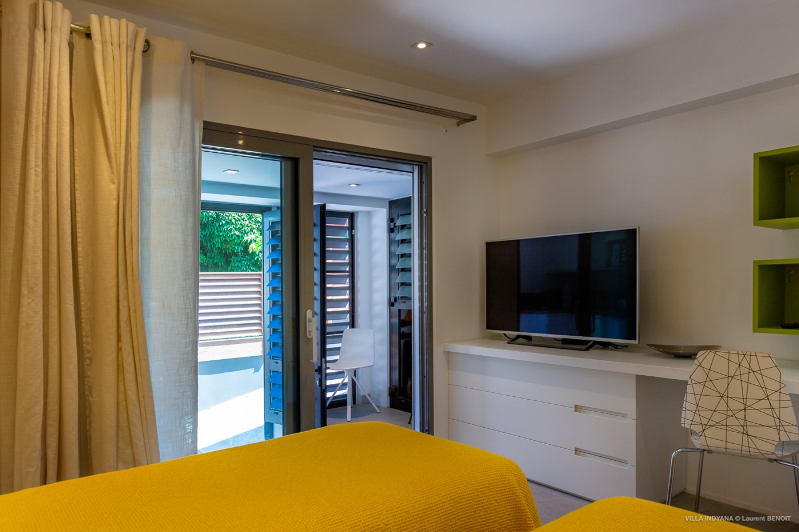 The two bedrooms lie on opposite sides of the living area. Both have king beds, direct access to the terrace through sliding glass doors, and large ensuite bathrooms. One of them also has a separate dressing area, and the other has double vanities and a skylight. An independent studio has recently been built which allows the villa to be rented in 3 bedrooms.