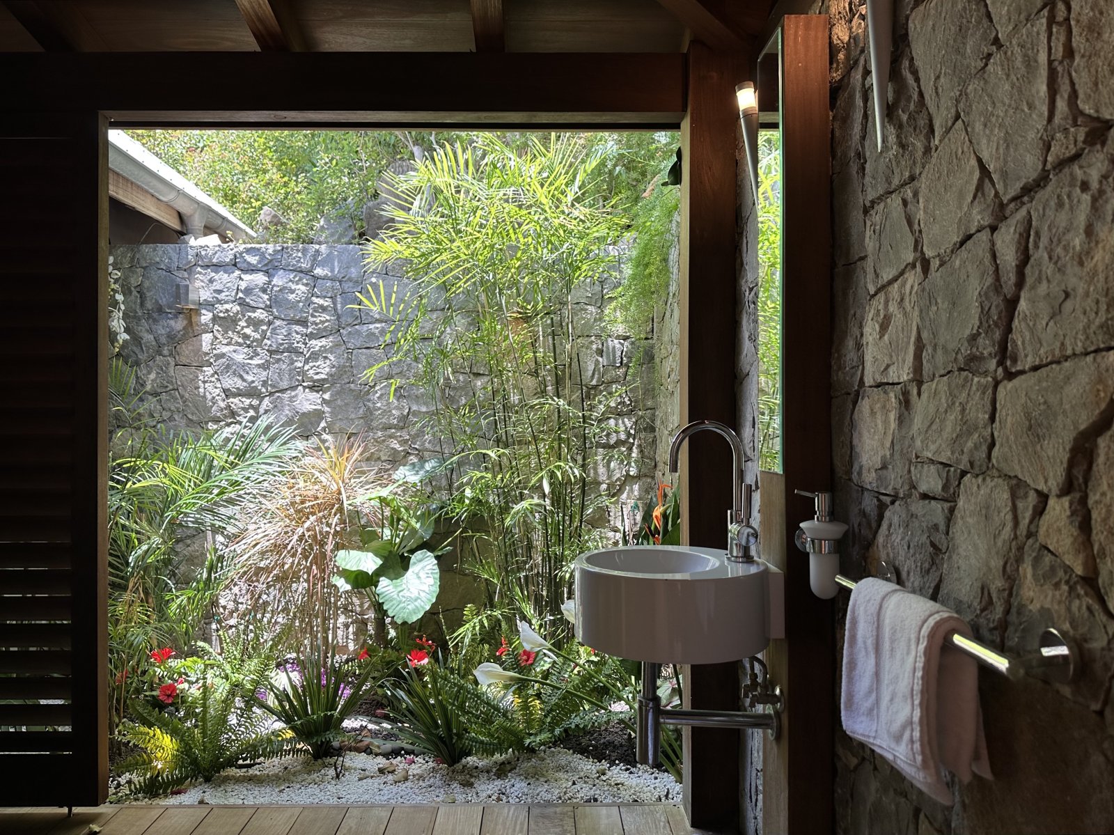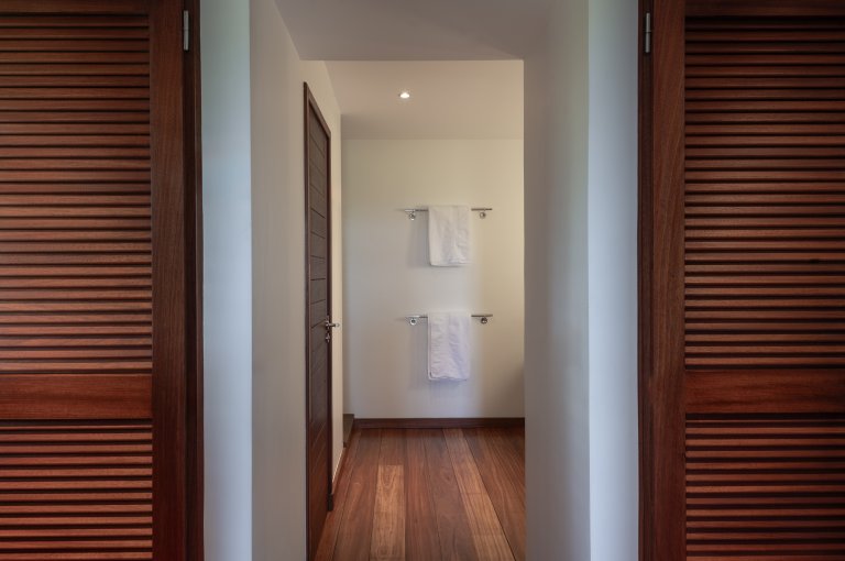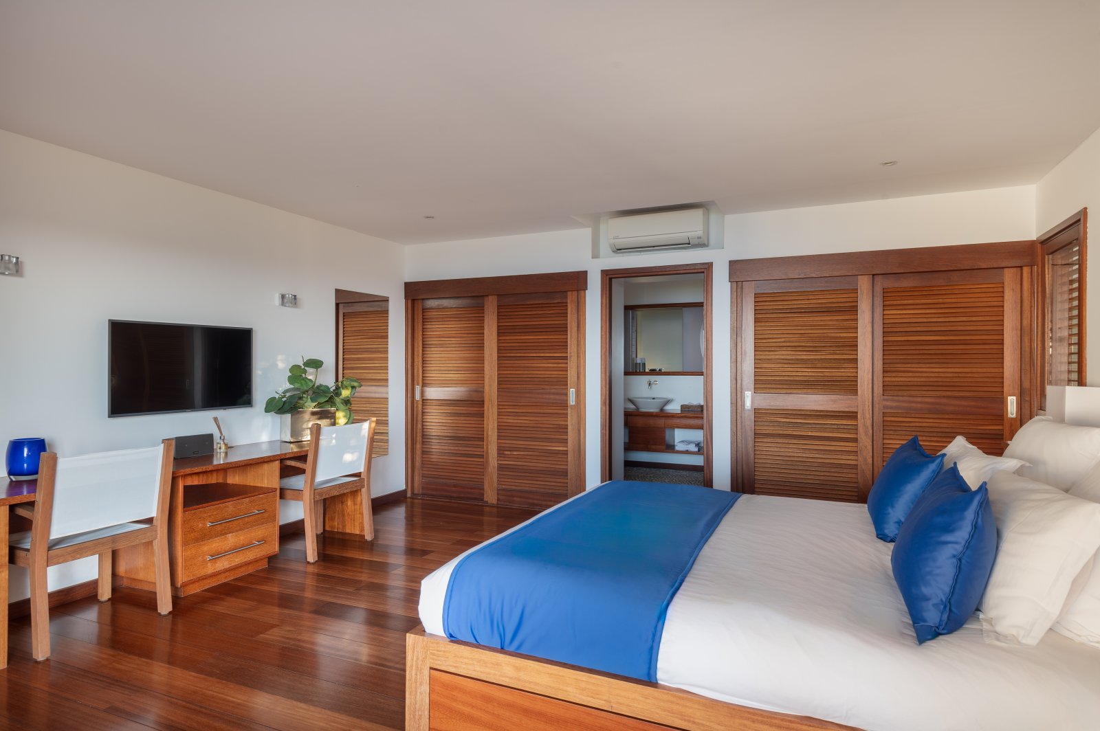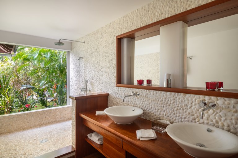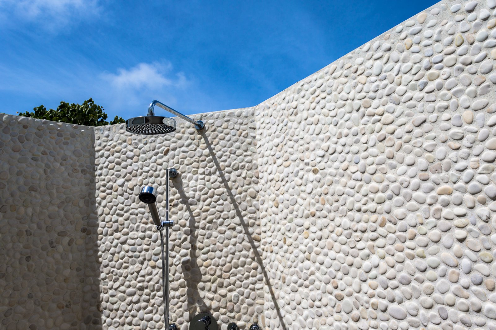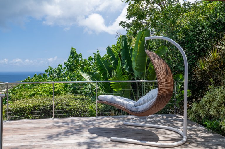 The thoughtfulness of Villa KYR's design does not stop at decorations and furnishings. The architectural layout provides privacy without sacrificing convenience. Two of the villa's four bedrooms, each with its own ensuite bath, are located on either side of the main living area, and open directly onto the terrace and magnificent ocean view. The third and fourth bedroom are on a lower level, each with its own bath and private deck.