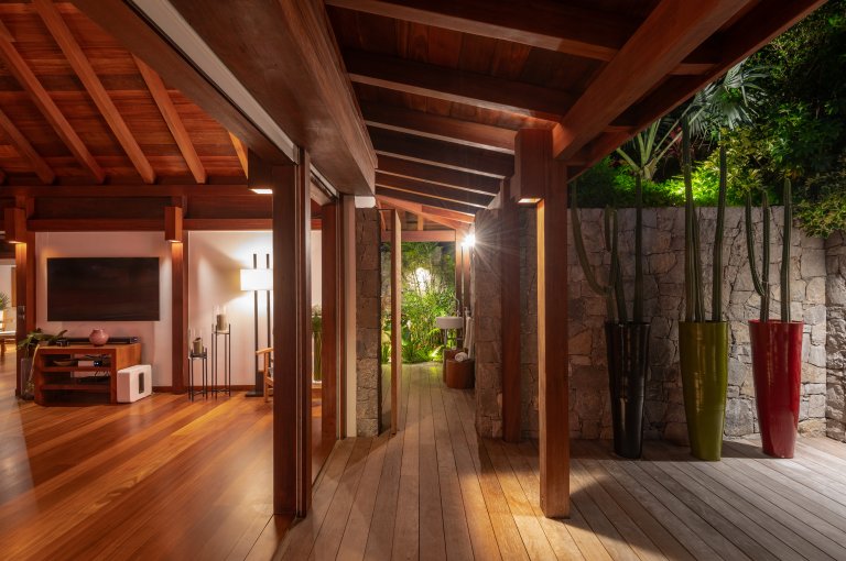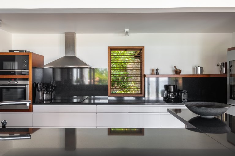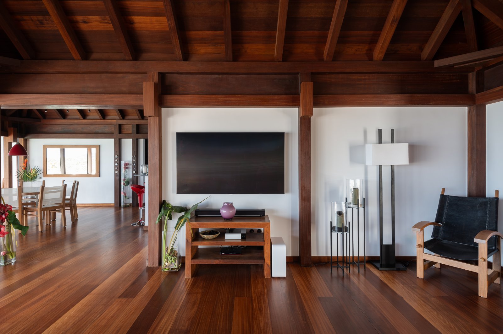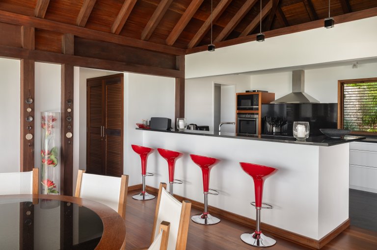 As you peruse the rooms of Villa Kyreve, you discover details that reveal a home in which the owners have chosen carefully, with love, each decorative touch and flourish. A painting in deep red adorns the wall by the stairs, and the same red is repeated in three smaller works not far away, and then again by the kitchen in the barstools. Stalks of bamboo, artworks of dried philodendron, and cacti in glass vases bring the serenity of the natural world outside into the home's interior spaces.