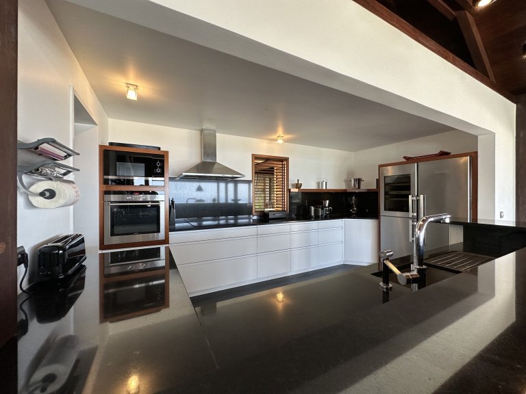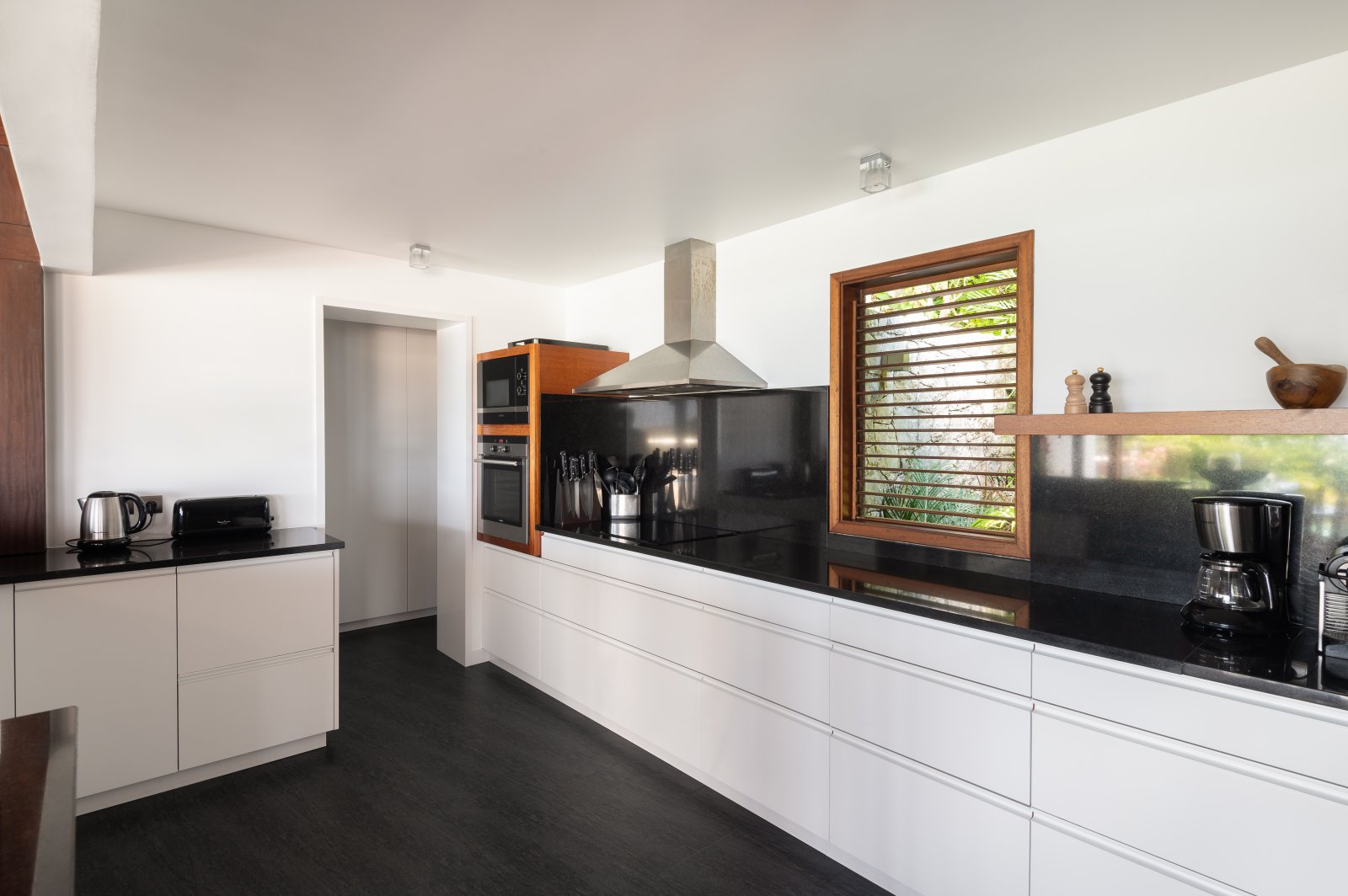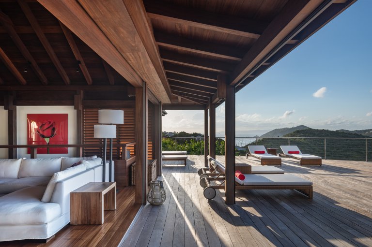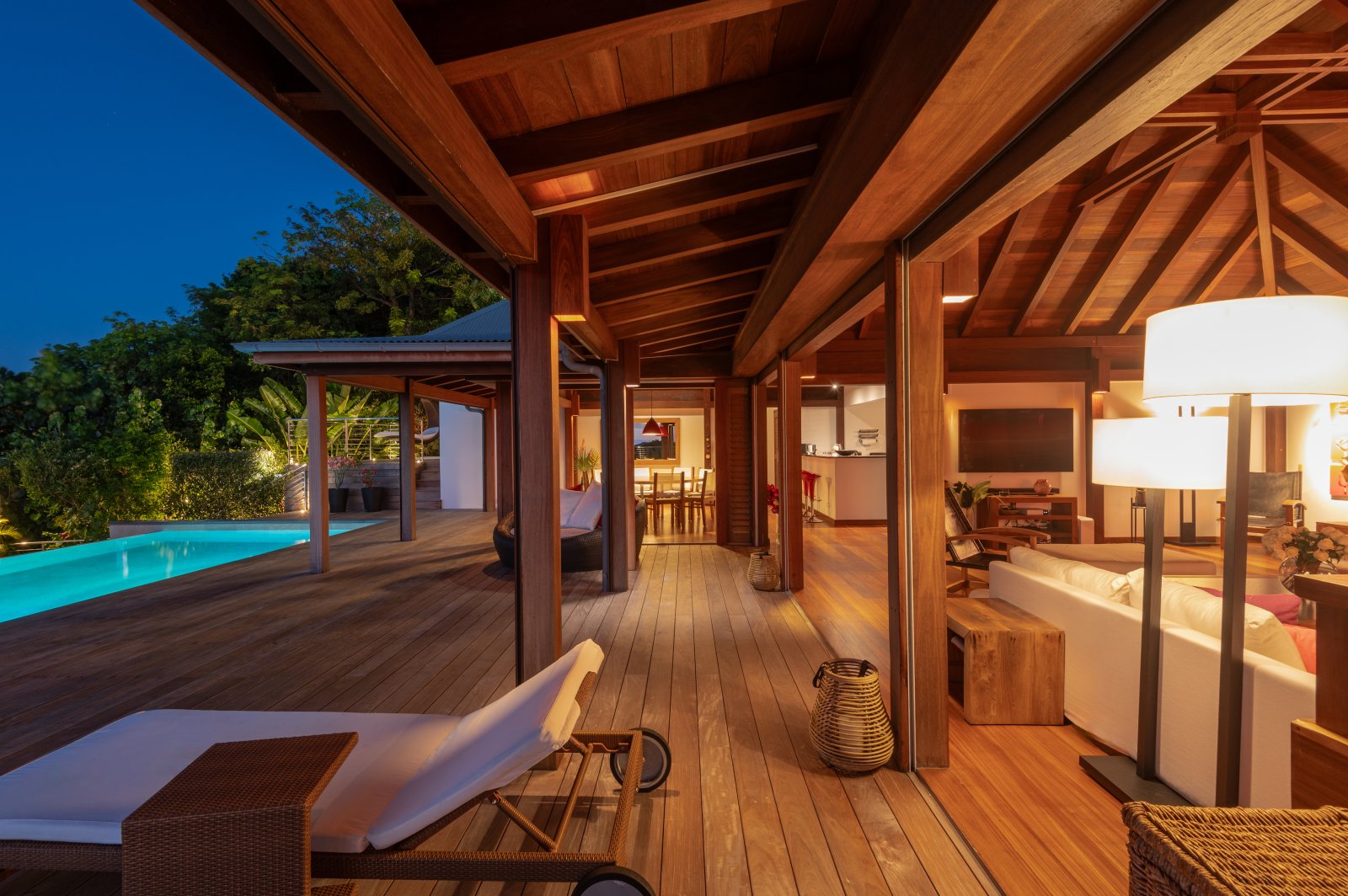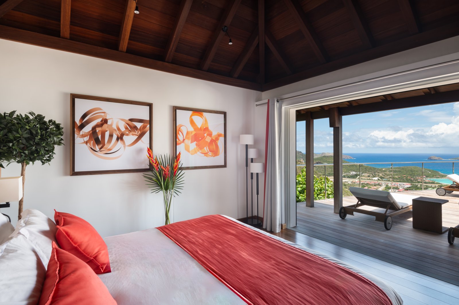 Located in the hilltop community of Lurin overlooking St. Jean, Villa Kyreve (KYR) invites its guests to retreat into a relaxing atmosphere of Asian-inspired simplicity and the kind of comfort that comes from thoughtful consideration in every aspect of design. A gurgling water-wall fountain sets the tone as you enter the villa, and before you stretches a broad vista of St. Jean Bay and the blue sea beyond. Fully open to the wide teak deck and glistening pool is the loft-like main living area, with comfortable white-upholstered sofas and a sheltered dining table for eight. The adjacent, open kitchen offers the aspiring chef the luxury of top-quality appliances and the pleasure of still being part of the party while preparing a meal.