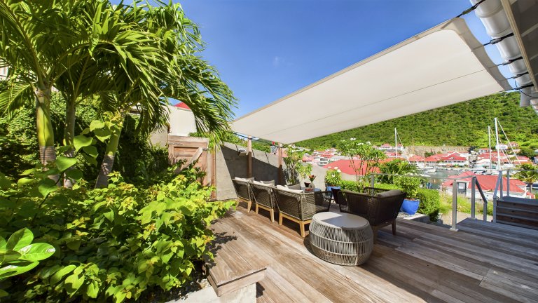 Fully air-conditioned, the apartment is designed for comfort and ease. The main bedroom overlooks the harbor and includes an ensuite bathroom, while Bedrooms 2 and 3 are situated toward the back and share a bathroom. The layout is ideal for a family or friends wanting to enjoy the bustle of Gustavia while having their own comfortable base.