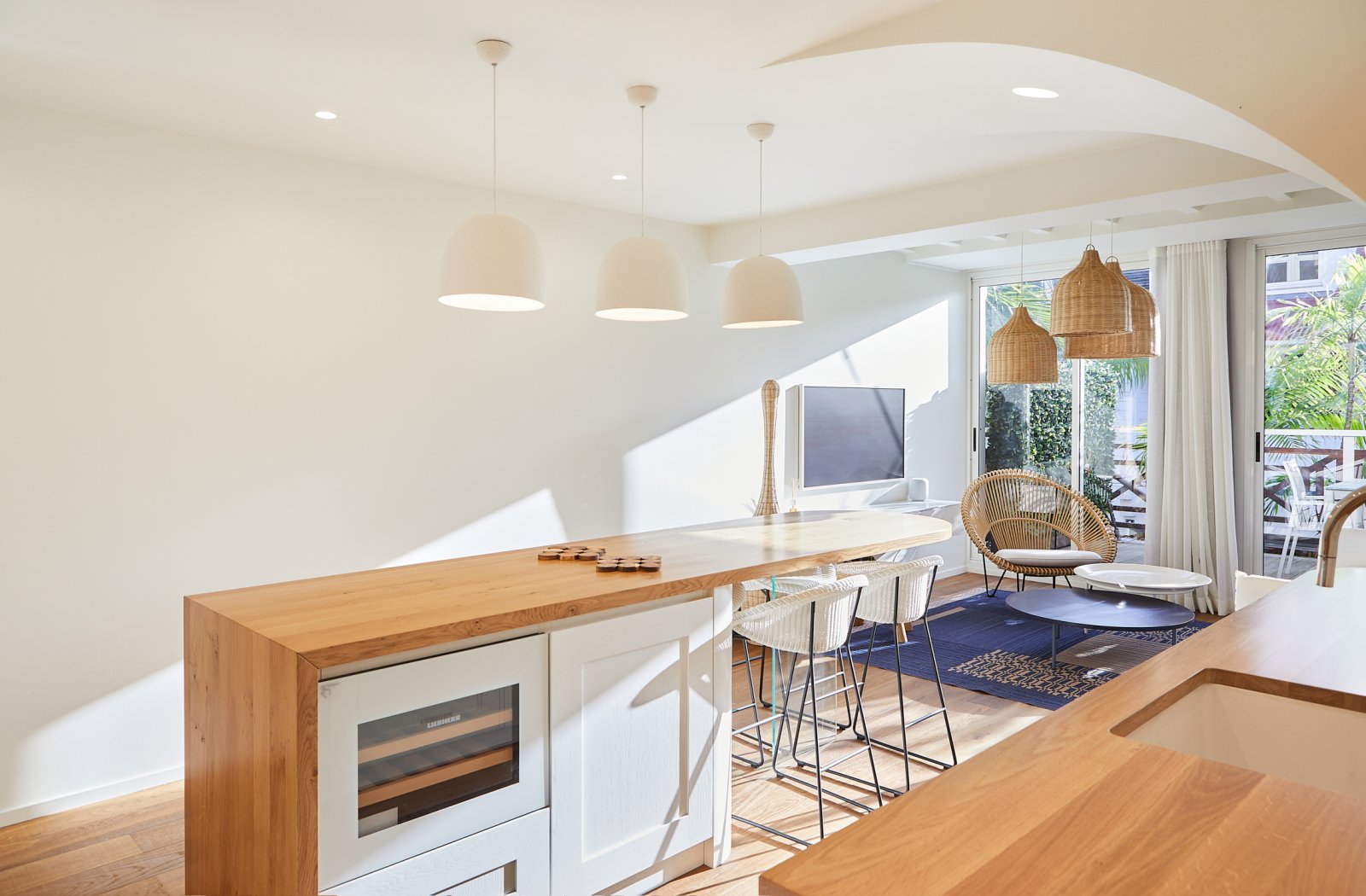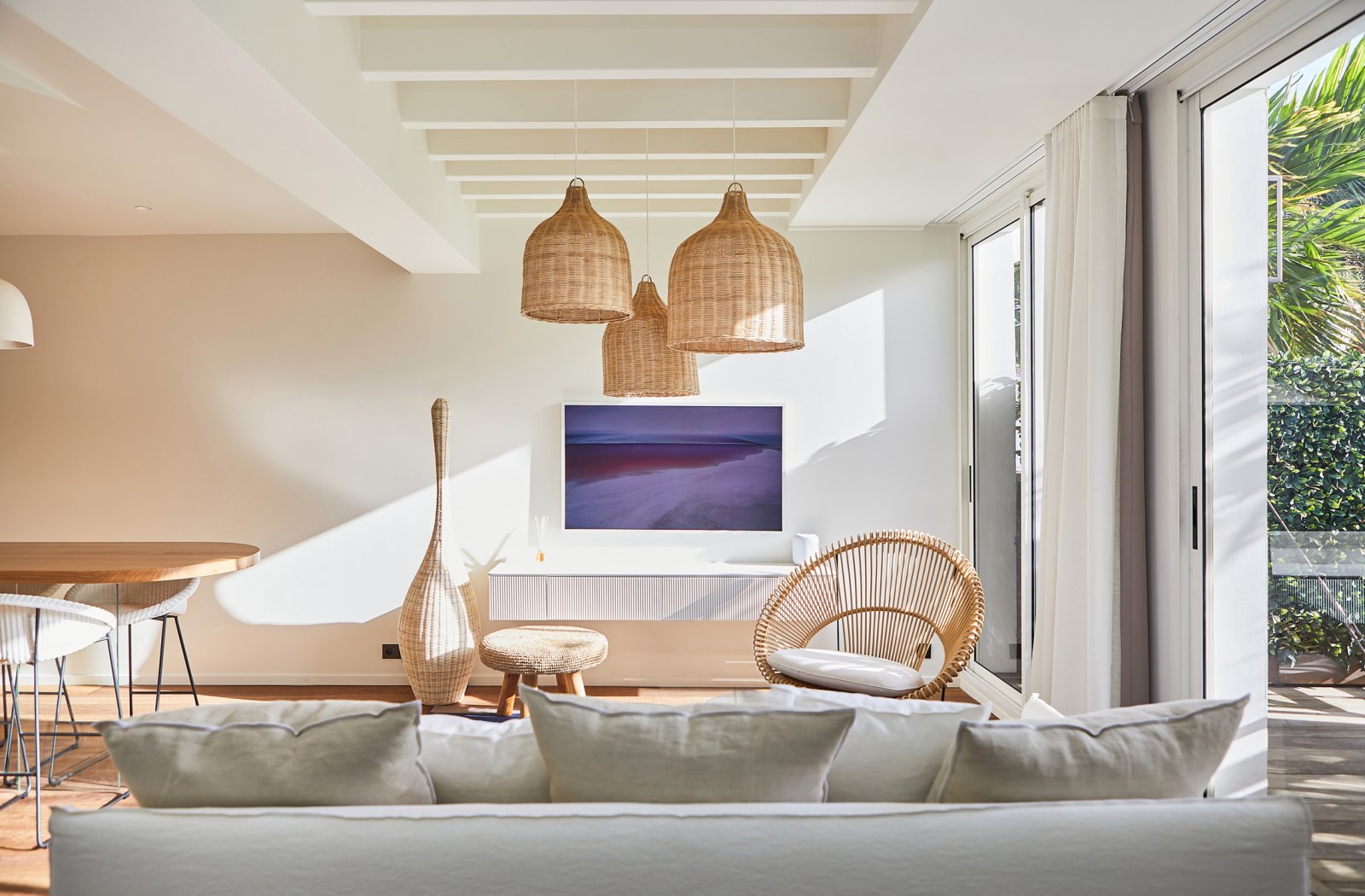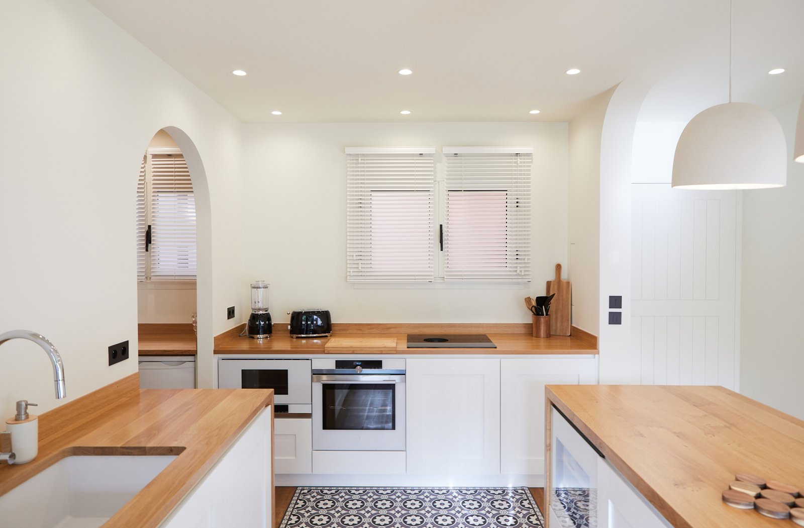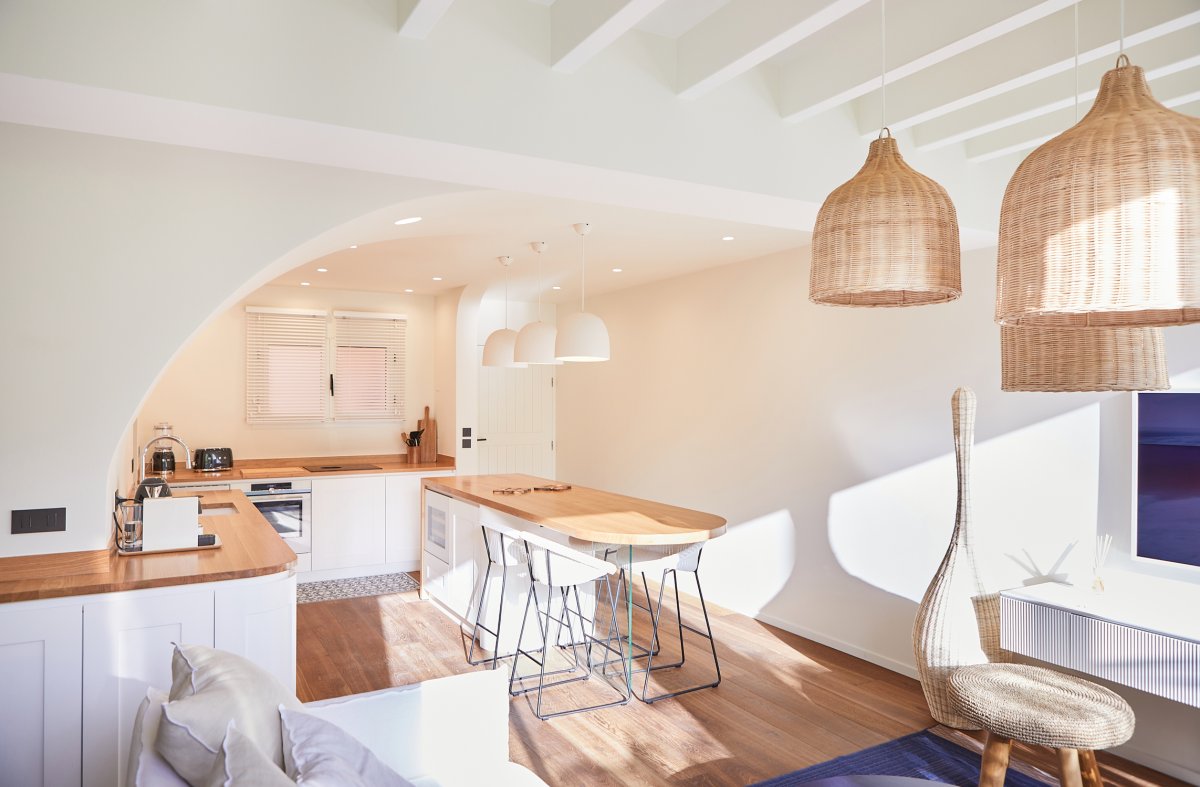 The living space and kitchen share a comfortable open-plan layout, with a breakfast bar in between and all the necessary appliances. A small terrace allows for fresh air, and the television is camouflaged in a frame. This whole area has plentiful sunlight.