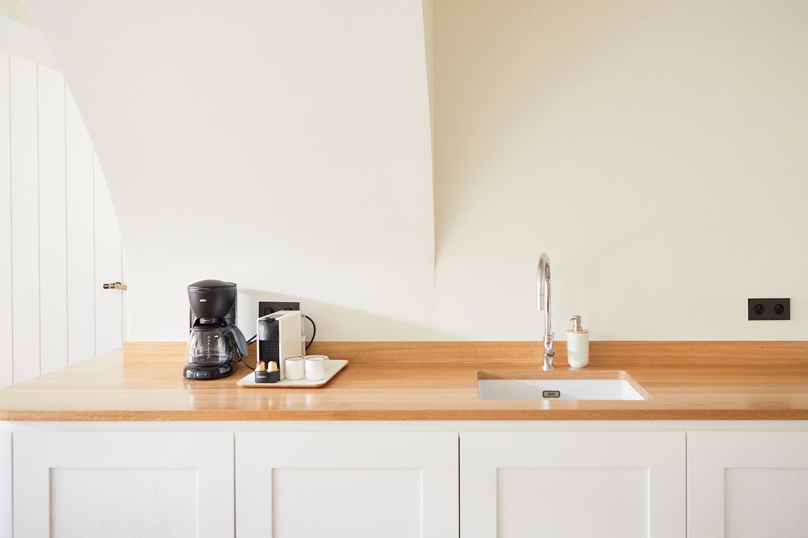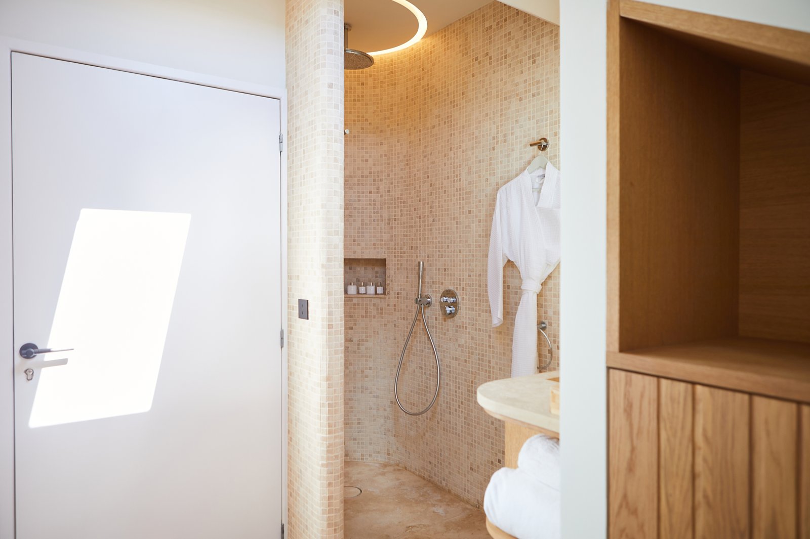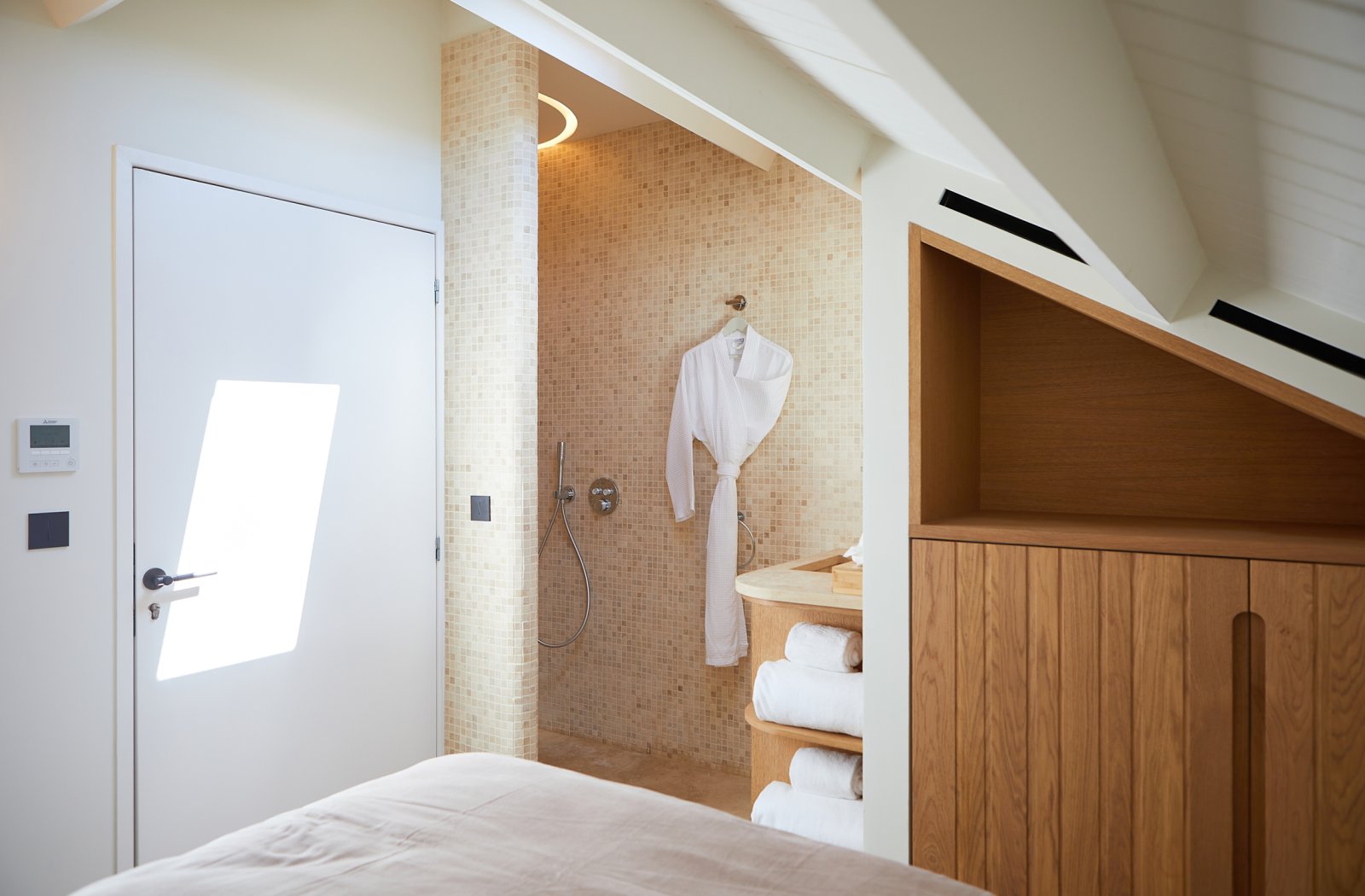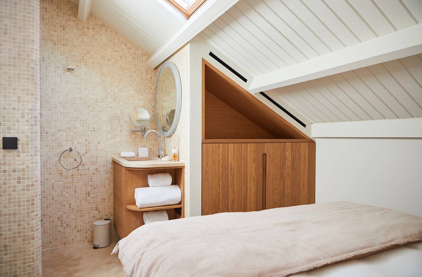 The two bedrooms are upstairs, accessible via an internal staircase. While they are compact and have slanted ceilings, their skylights give them a feeling of spaciousness. Each one has a luxurious ensuite shower and vanity with mosaic tiles, and they share a WC. Even so, they give you a feeling that you are in a private world of your own.