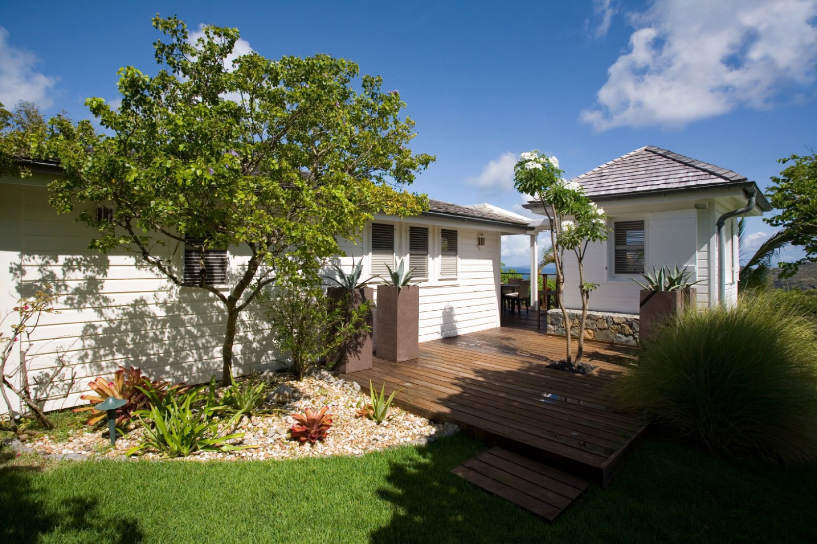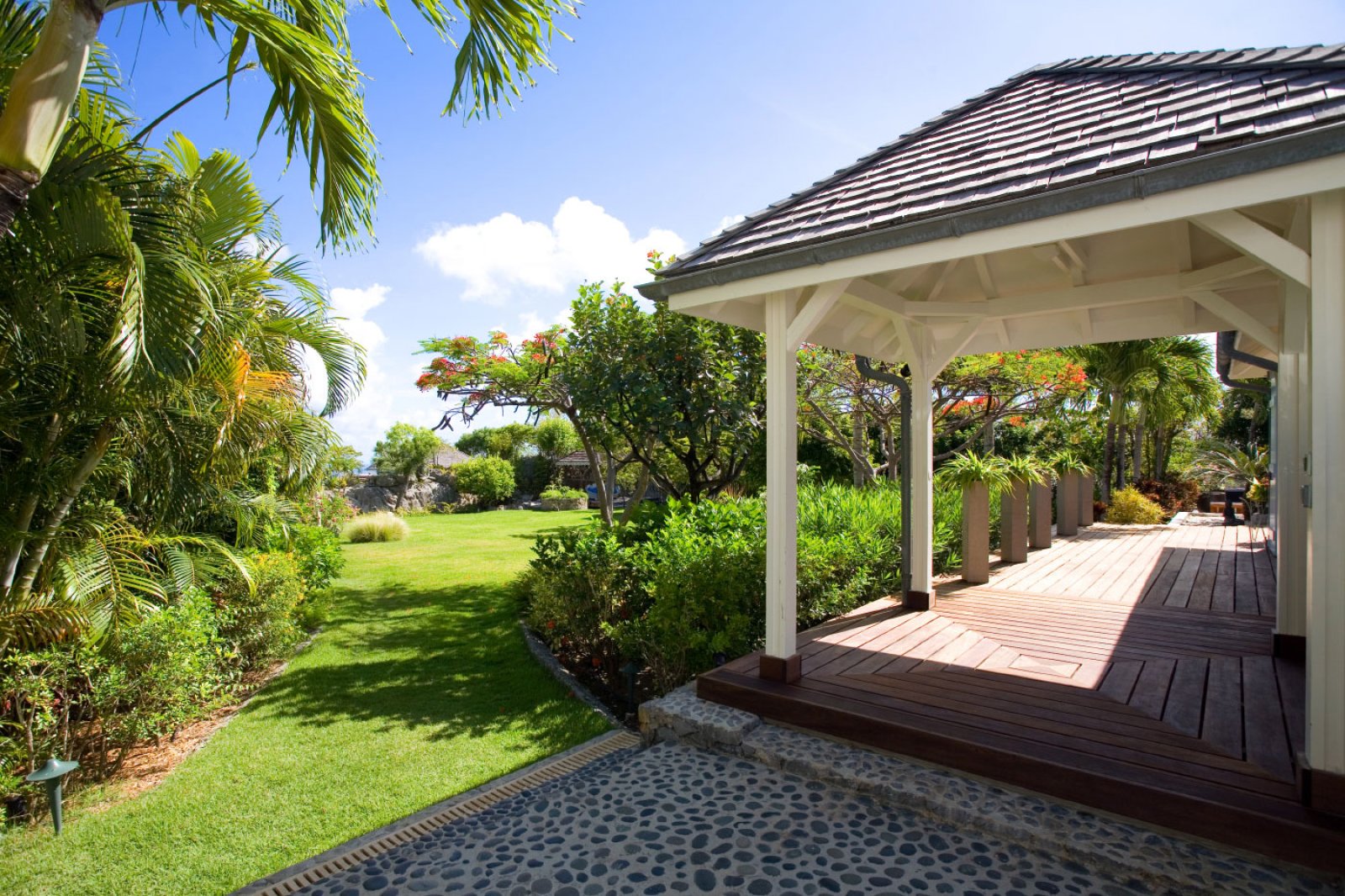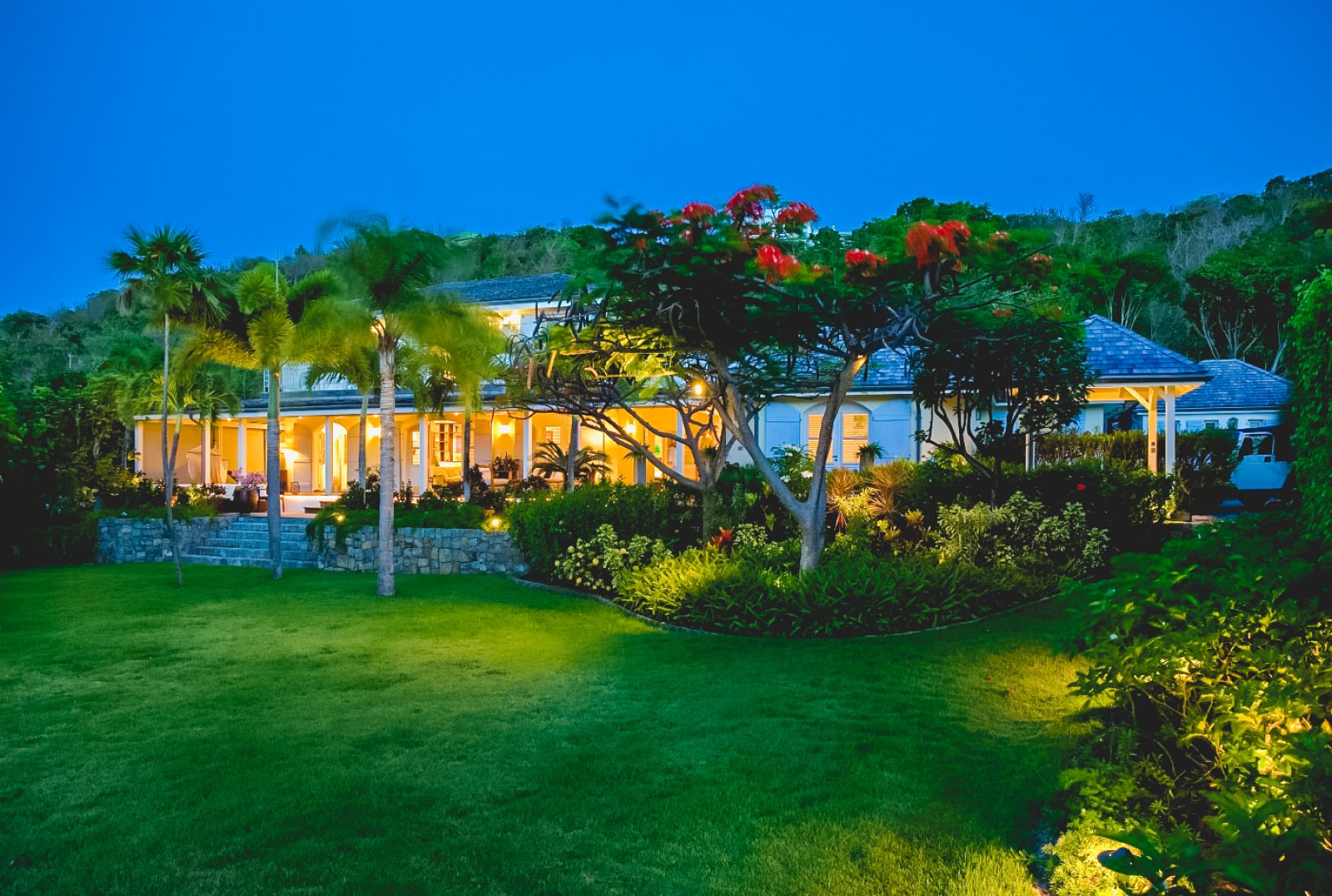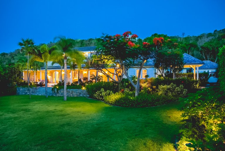 High up on a hillside overlooking the sea and embraced in a profusion of tropical flora, Le Manoir de Lurin (Villa MDL) evokes the gentility of the West Indies' colonial past, combining traditional decor and architecture with a 21st century sensibility of quiet refinement and meditative relaxation. When passing the gate into the property for the first time, visitors are taken aback by the vast, verdant lawn and landscaped gardens bordering it. Villa MDL's gardens are a veritable Eden of flowering plants, fruit trees, palms and orchids. Multicolored bougainvillea compete for attention with the vivid red of a flambouyant tree. A row of royal palms rustle in the breeze and cast shifting shadows on the plush, green grass.