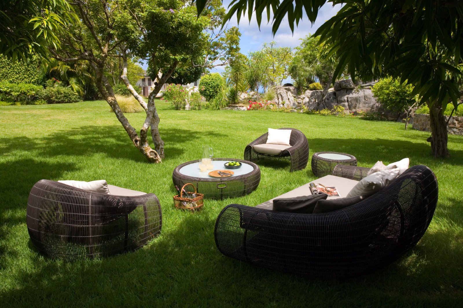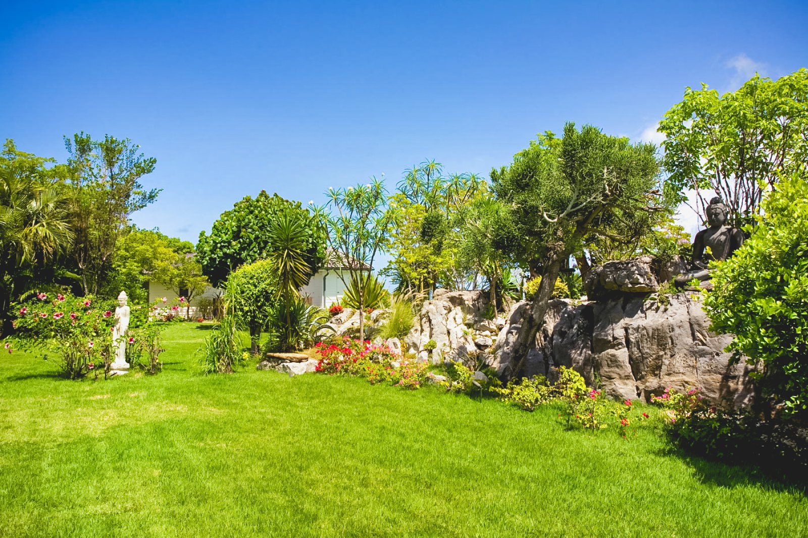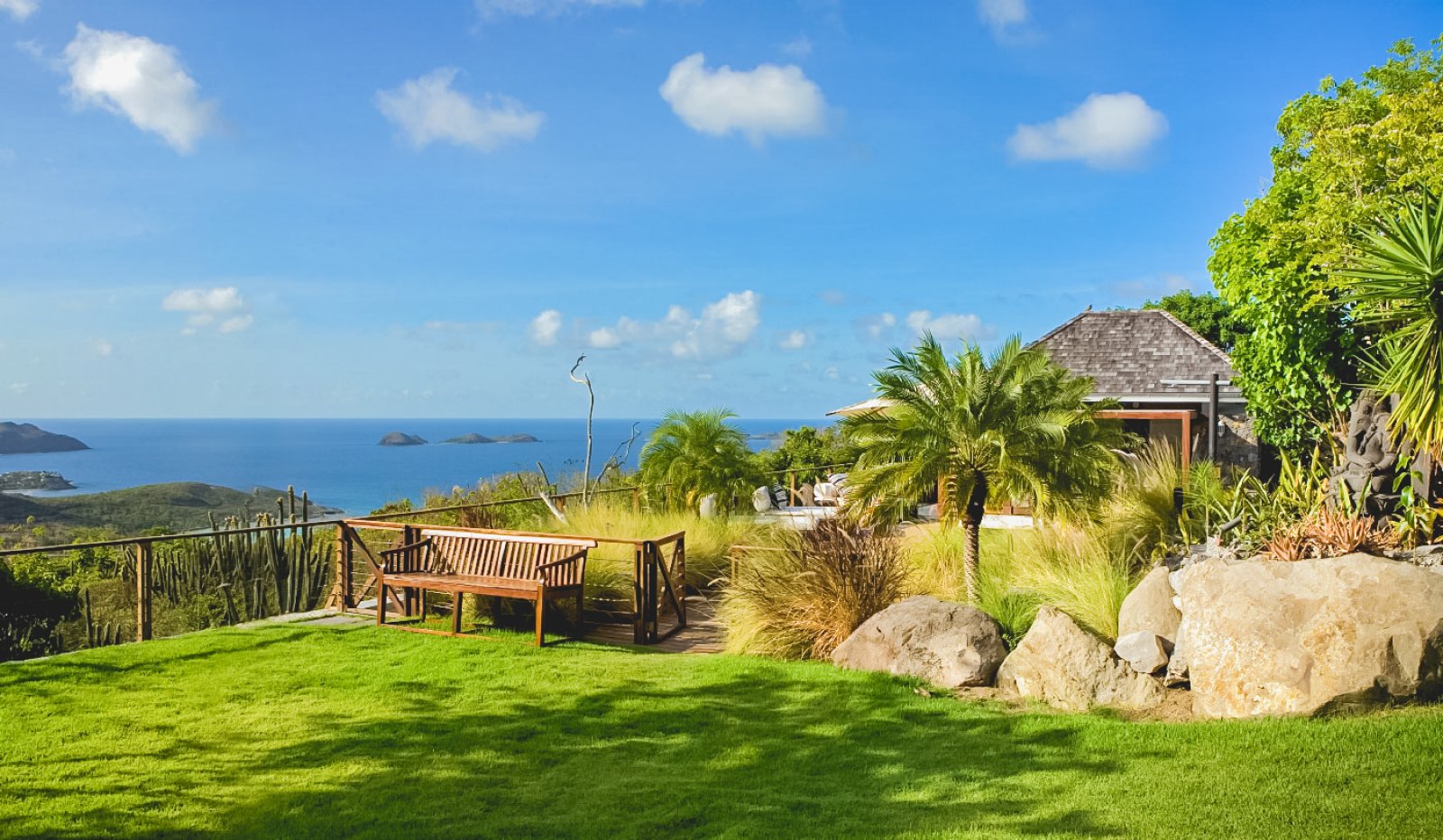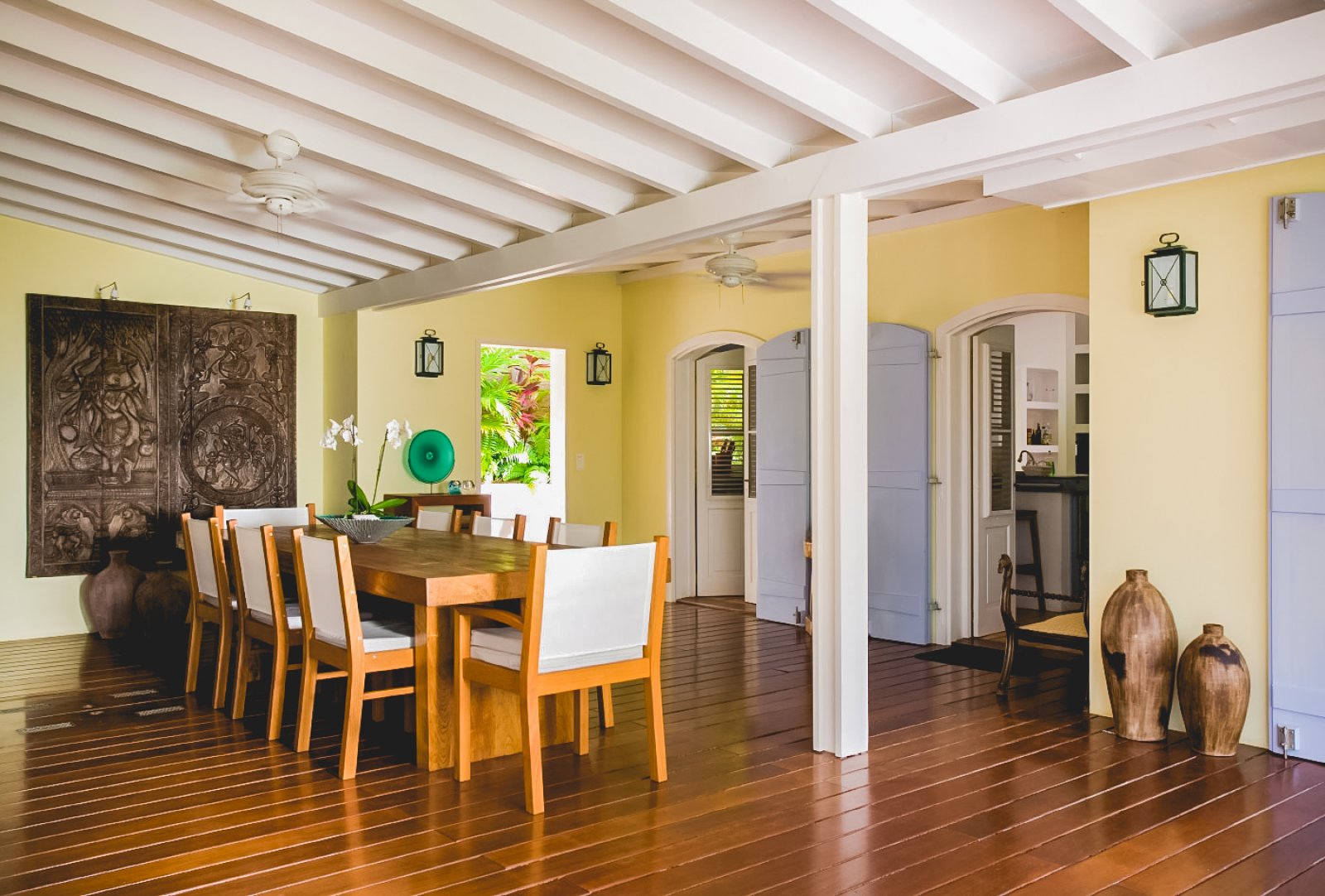 High up on a hillside overlooking the sea and embraced in a profusion of tropical flora, Le Manoir de Lurin (Villa MDL) evokes the gentility of the West Indies' colonial past, combining traditional decor and architecture with a 21st century sensibility of quiet refinement and meditative relaxation. When passing the gate into the property for the first time, visitors are taken aback by the vast, verdant lawn and landscaped gardens bordering it. Villa MDL's gardens are a veritable Eden of flowering plants, fruit trees, palms and orchids. Multicolored bougainvillea compete for attention with the vivid red of a flambouyant tree. A row of royal palms rustle in the breeze and cast shifting shadows on the plush, green grass.