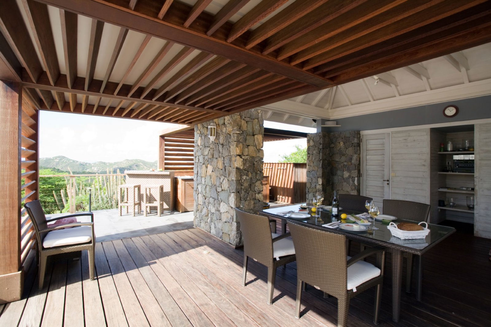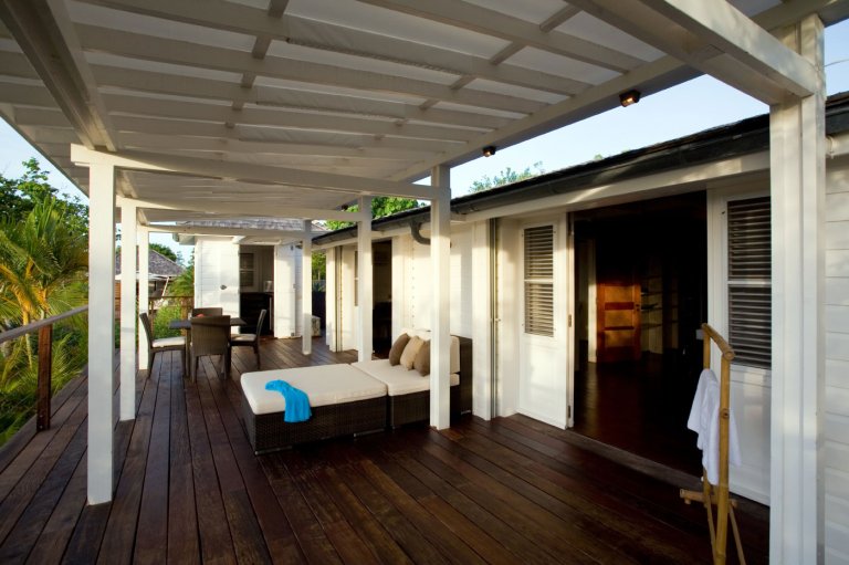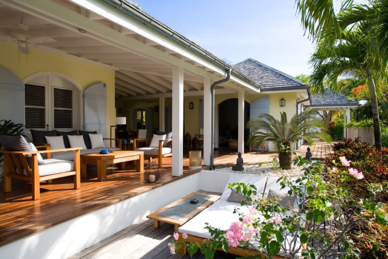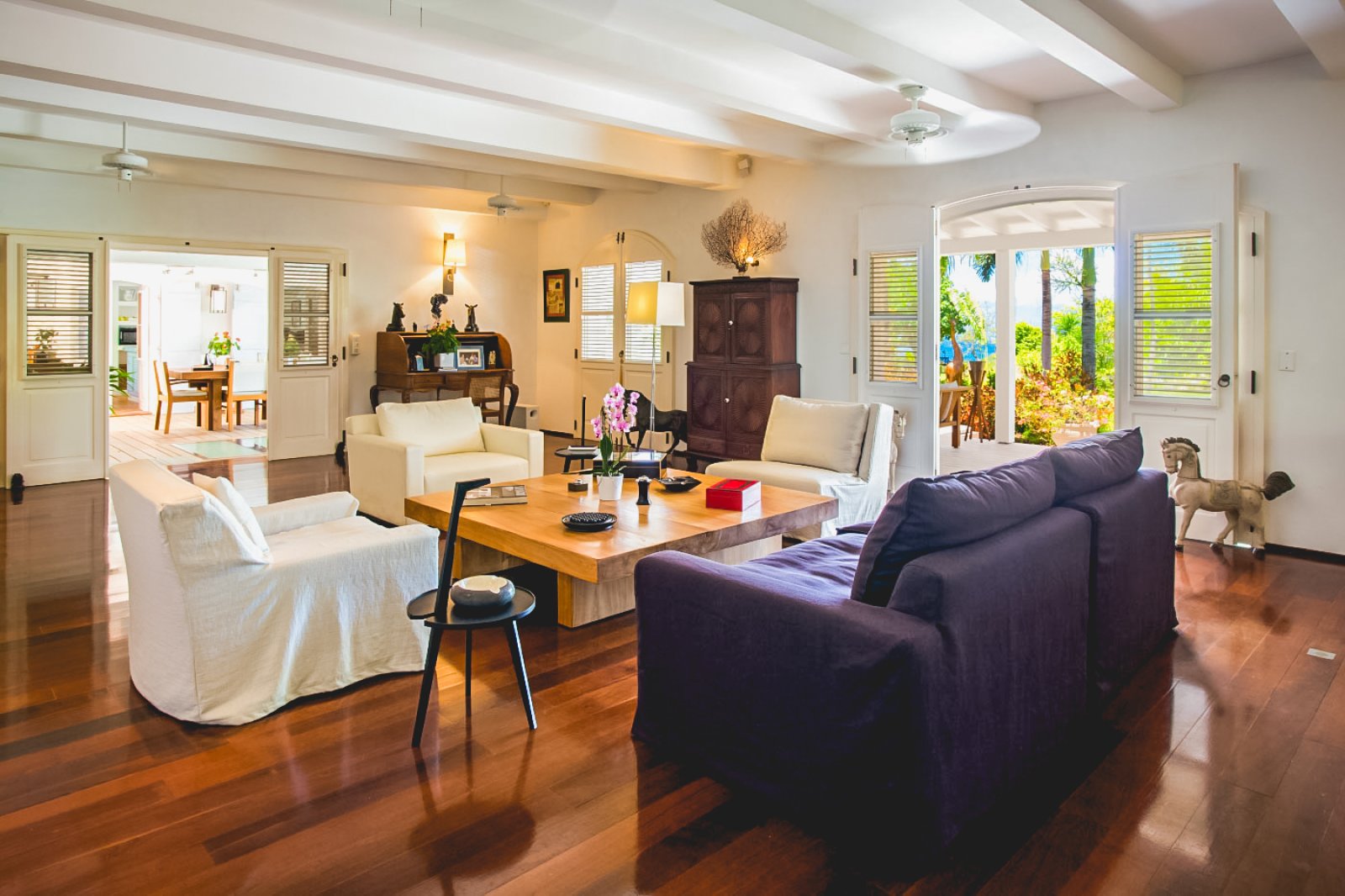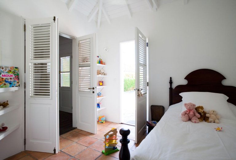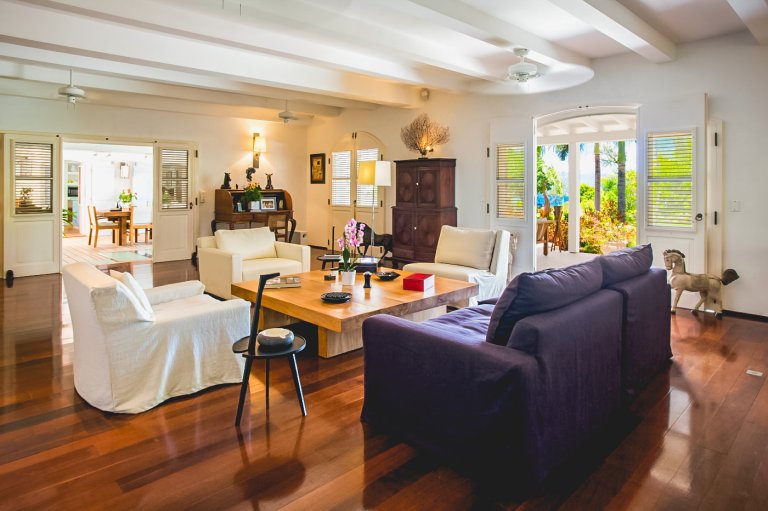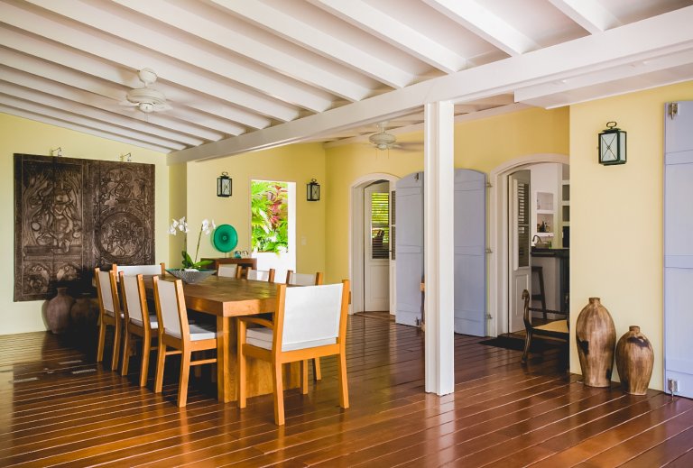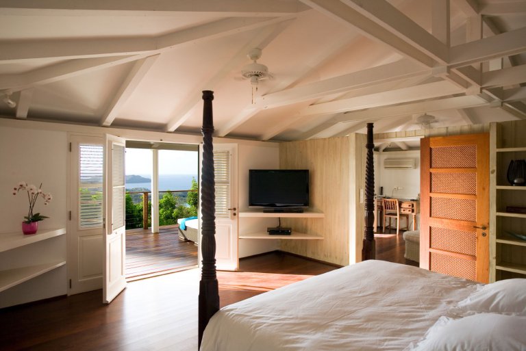 In true colonial style, Villa MDL's master bedroom suite occupies the second story of the main house, striking a balance that provides privacy without sacrificing convenience. The other three bedrooms are in independent bungalows opening onto the garden and lawn. The living and dining areas are centrally located on the first floor, and offer a mix of traditional style, such as beamed ceilings, and modern touches, such as a comfortable and chic Christian Liaigre sofa. The bedrooms are furnished with mahogany four-poster beds, old-fashioned writings desks, and Caribbean decorative accents like wood-louvered windows and doors. Each bedroom has a private ensuite bath and access to the terrace overlooking the gardens and the magnificent ocean view. A short distance across the gardens from the main house, guests will find a second terrace for sunning, swimming laps in the refreshing water of the pool, or relaxing with a book in the shade of the gazebo. A barbecue, refrigerator and ice machine make the gazebo perfect for any meal from a quiet, starlit dinner to a Sunday afternoon barbecue.