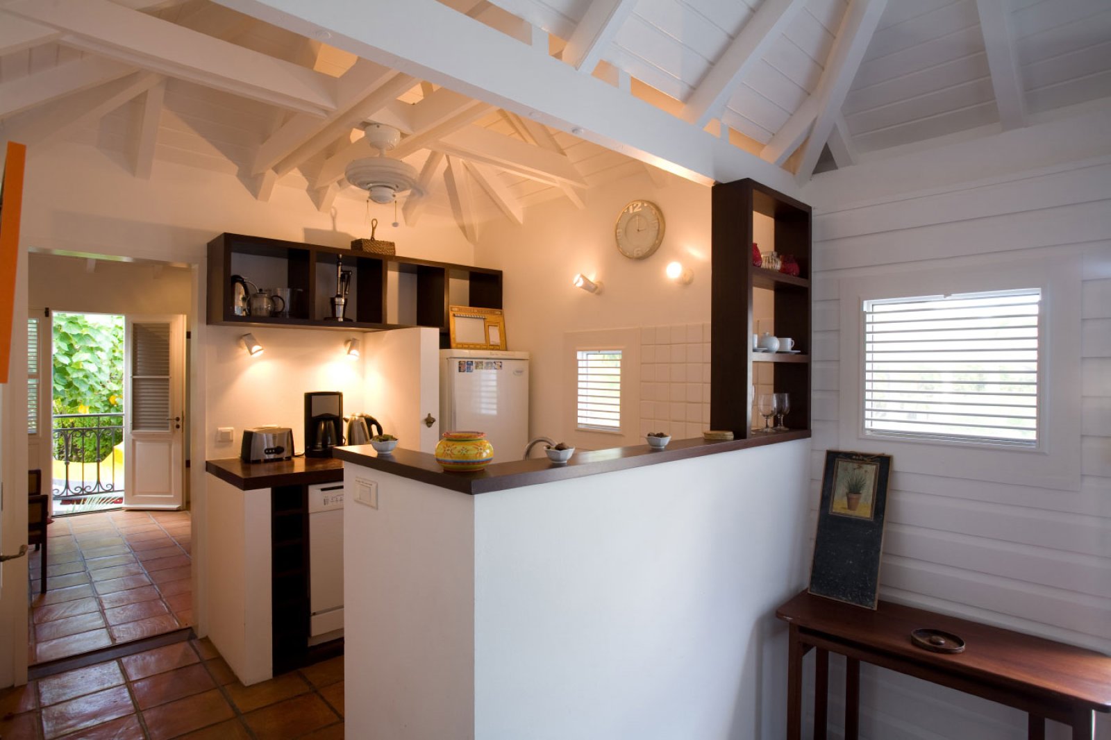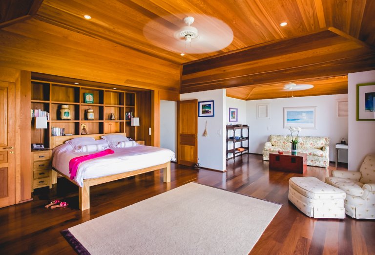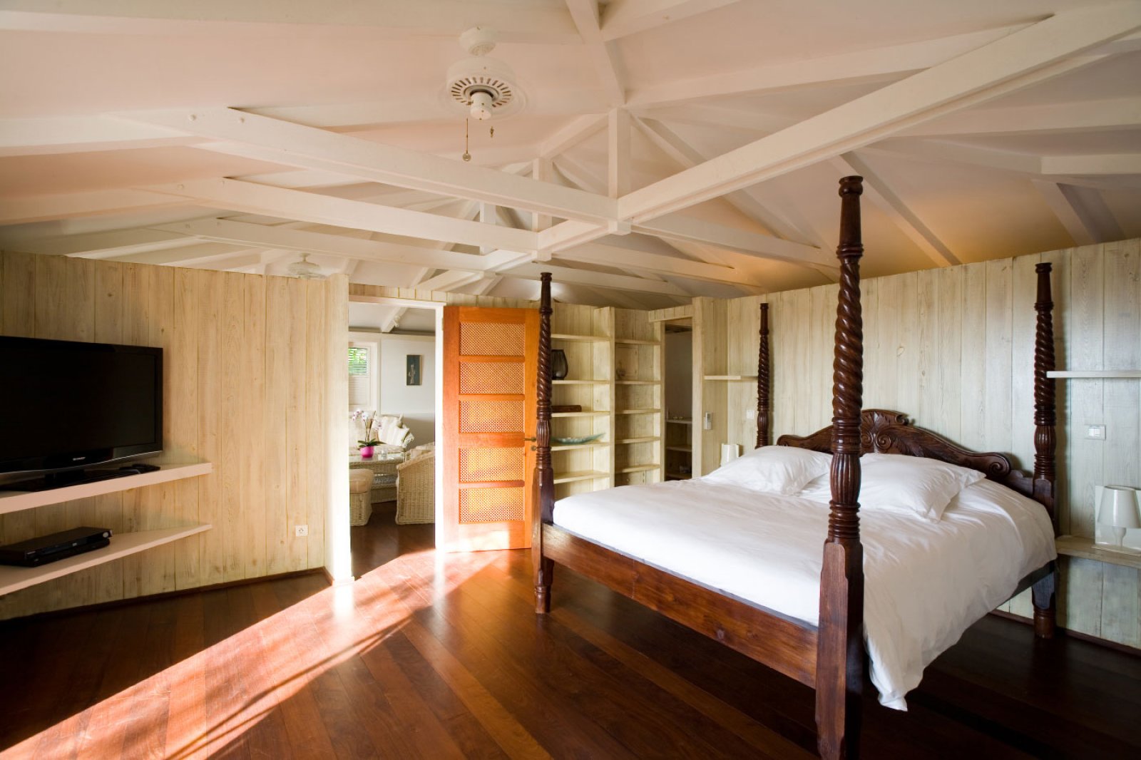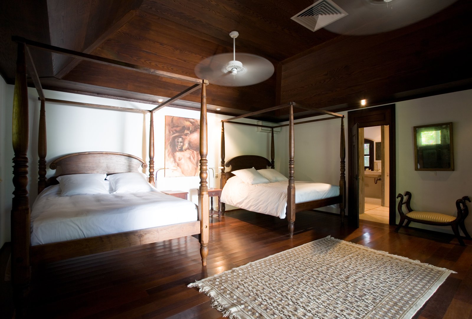 In true colonial style, Villa MDL's master bedroom suite occupies the second story of the main house, striking a balance that provides privacy without sacrificing convenience. The other three bedrooms are in independent bungalows opening onto the garden and lawn. The living and dining areas are centrally located on the first floor, and offer a mix of traditional style, such as beamed ceilings, and modern touches, such as a comfortable and chic Christian Liaigre sofa. The bedrooms are furnished with mahogany four-poster beds, old-fashioned writings desks, and Caribbean decorative accents like wood-louvered windows and doors. Each bedroom has a private ensuite bath and access to the terrace overlooking the gardens and the magnificent ocean view. A short distance across the gardens from the main house, guests will find a second terrace for sunning, swimming laps in the refreshing water of the pool, or relaxing with a book in the shade of the gazebo. A barbecue, refrigerator and ice machine make the gazebo perfect for any meal from a quiet, starlit dinner to a Sunday afternoon barbecue.