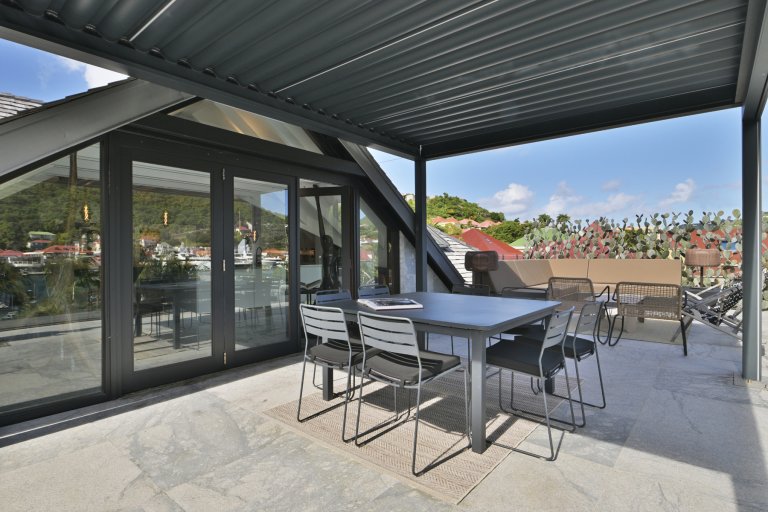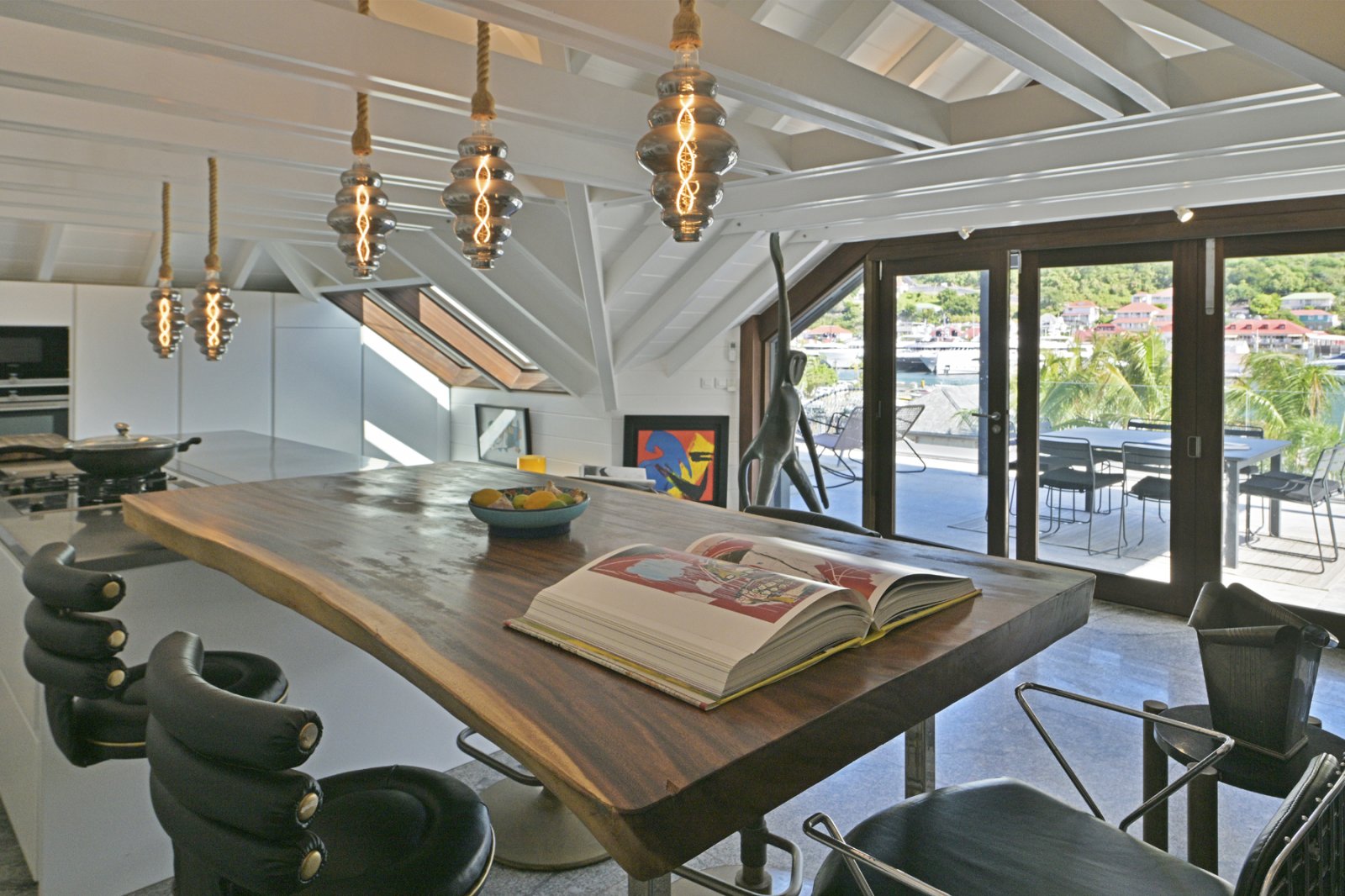 The open-plan living area features a fully equipped kitchen and large sliding doors that lead to a private terrace. Here, the jacuzzi offers a soothing urban pause while overlooking Gustavia's harbor. Natural light filters through, creating an atmosphere that is both warm and modern.