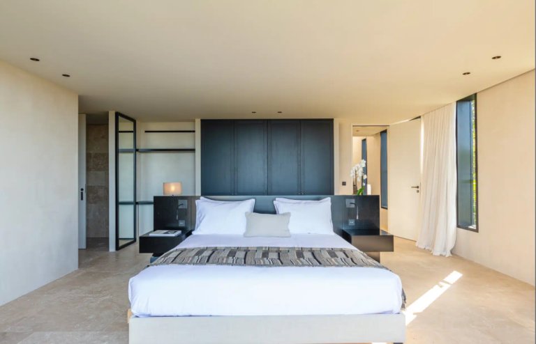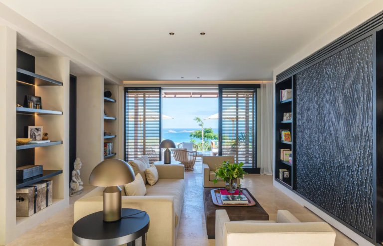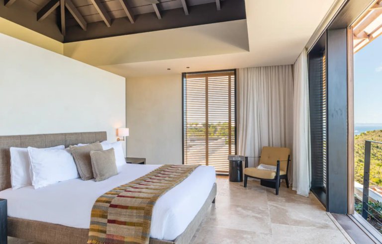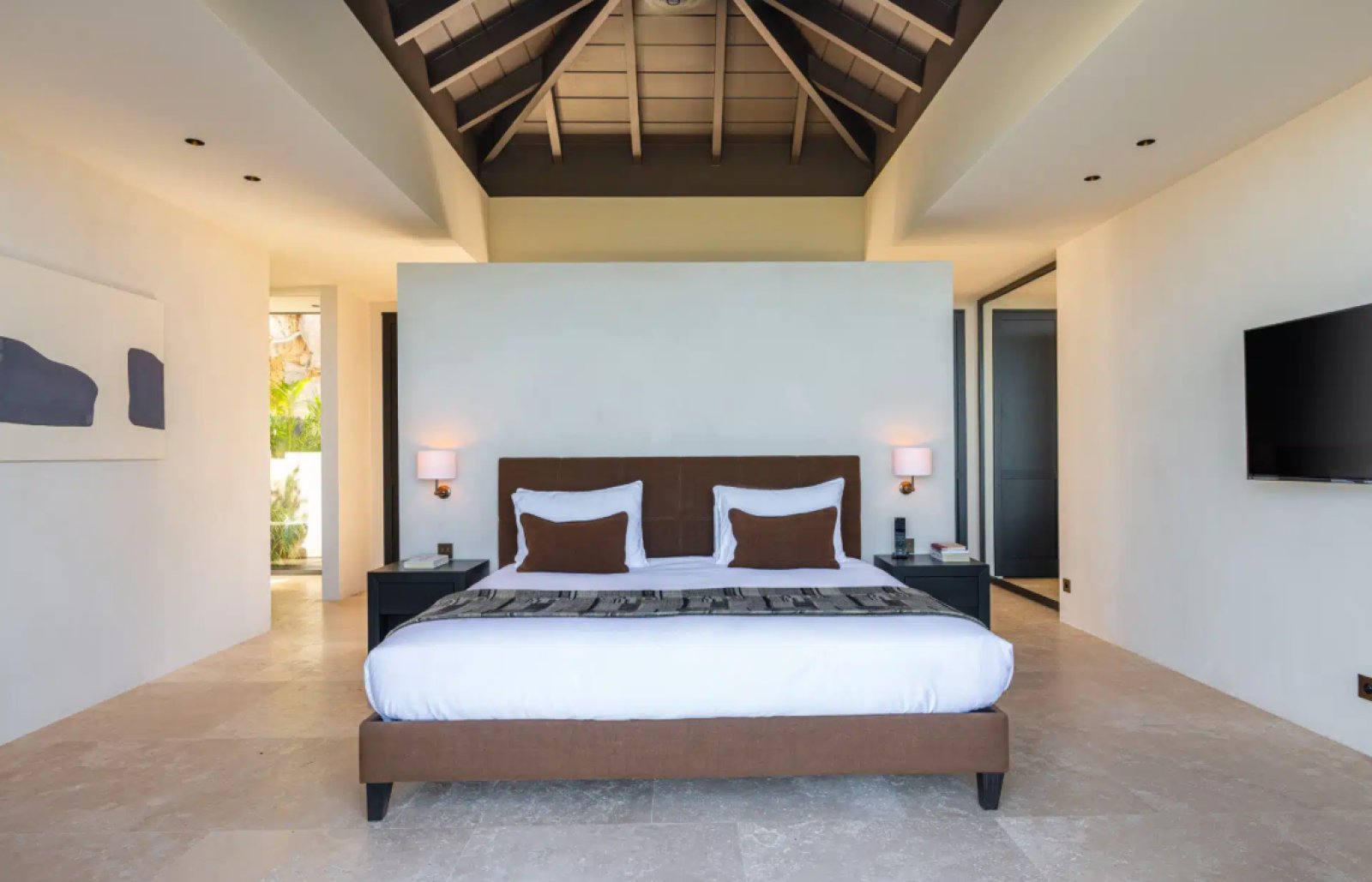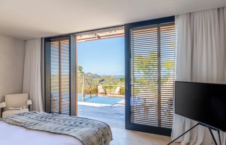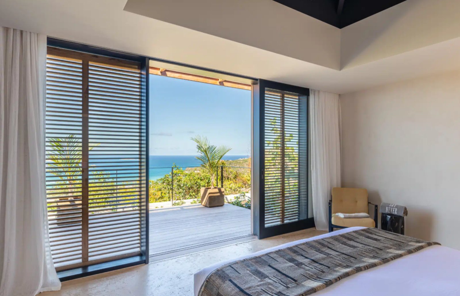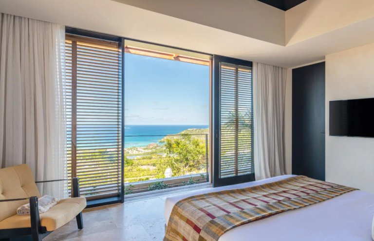 High-end design pieces and bespoke furniture make the newly built Villa Never Say Never (SAY) in Lurin a one-of-a-kind home in St. Barth. The luxury rental property has a sober, slightly masculine feeling, with black accents, louver doors, and travertine stone in the floors and bathrooms throughout. Its convenient location overlooks St. Jean Bay and the airport in the distance.