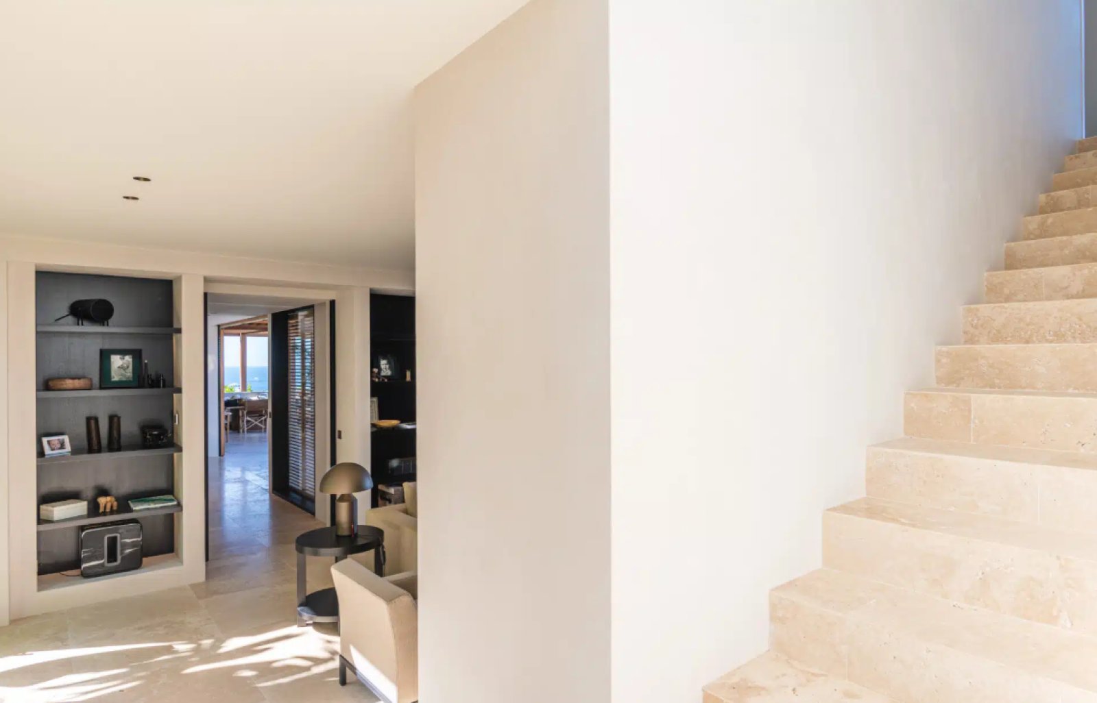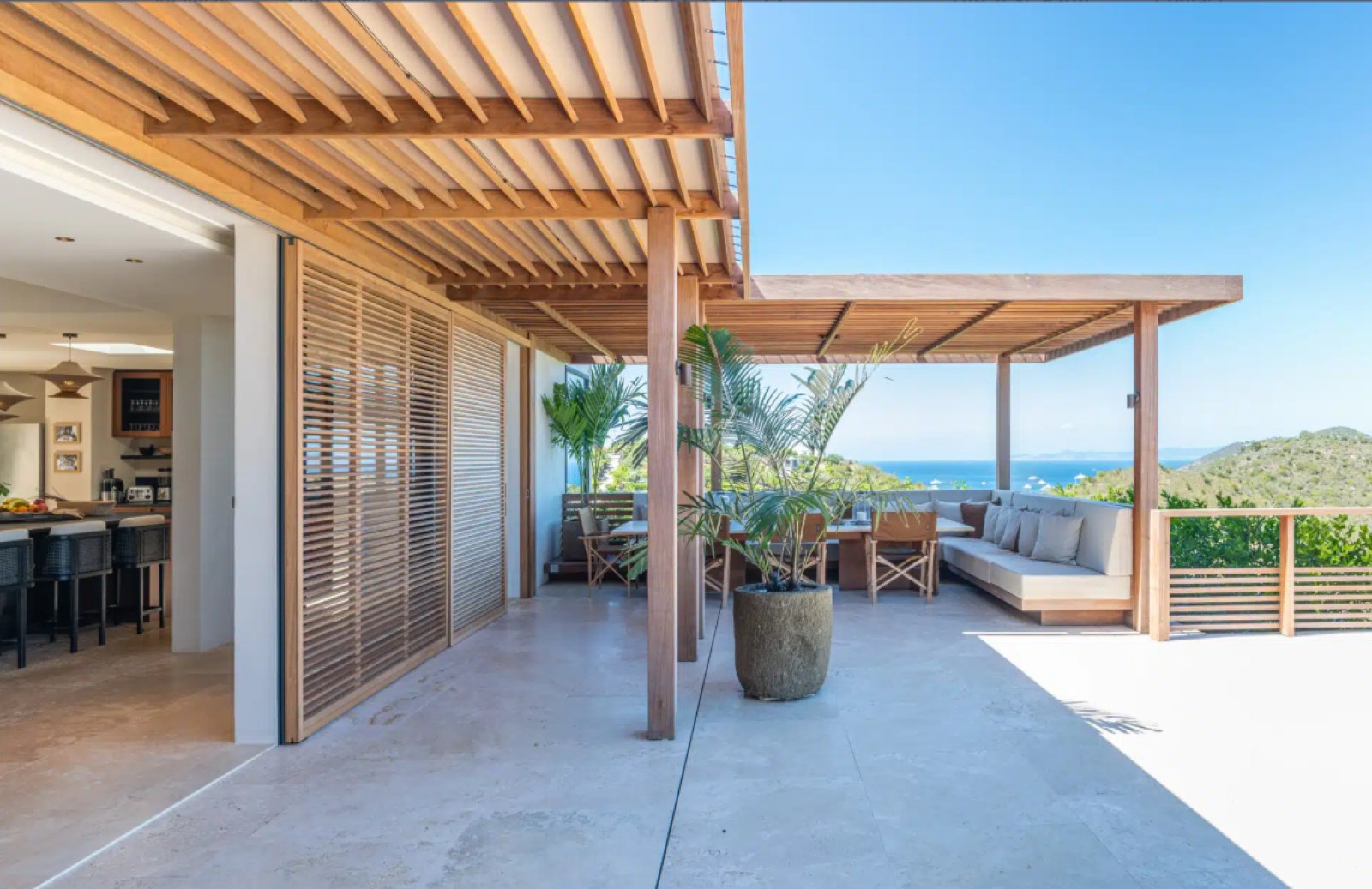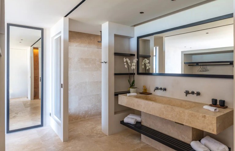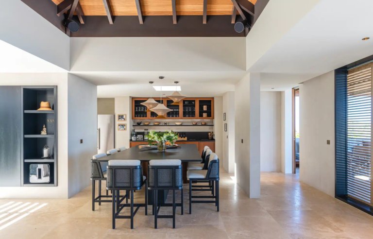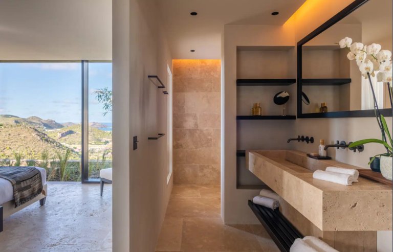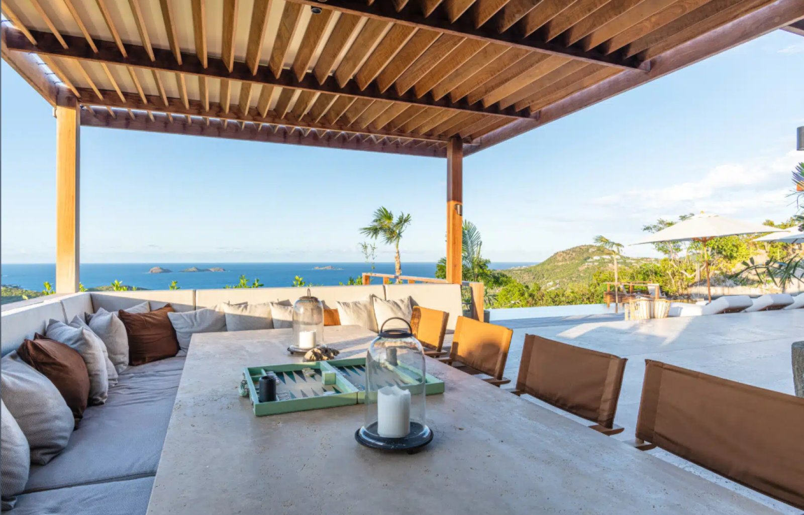 High-end design pieces and bespoke furniture make the newly built Villa Never Say Never (SAY) in Lurin a one-of-a-kind home in St. Barth. The luxury rental property has a sober, slightly masculine feeling, with black accents, louver doors, and travertine stone in the floors and bathrooms throughout. Its convenient location overlooks St. Jean Bay and the airport in the distance.