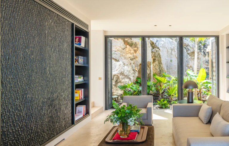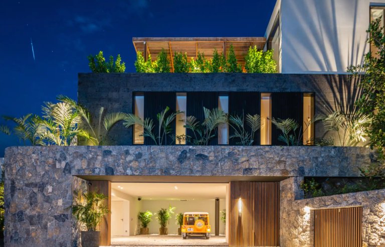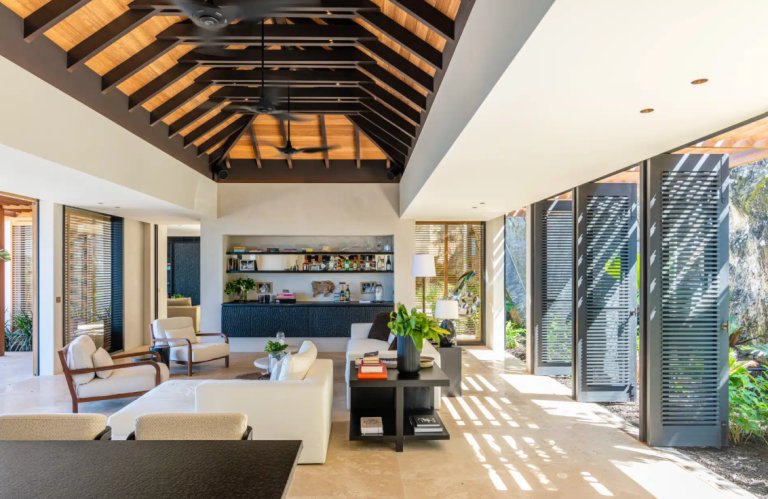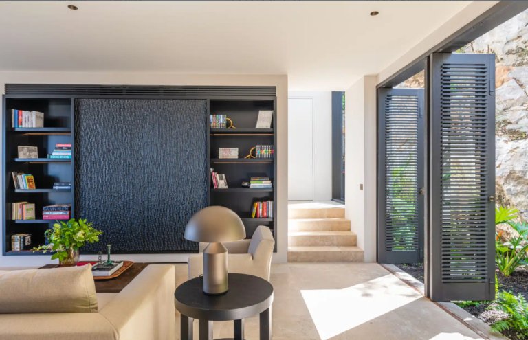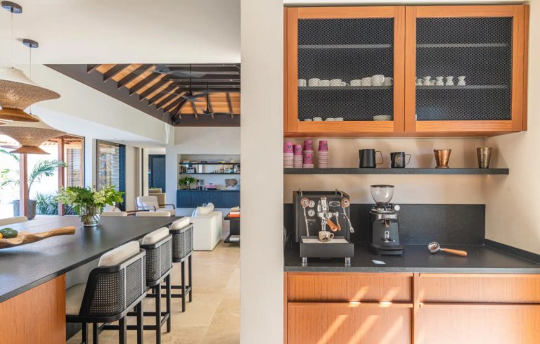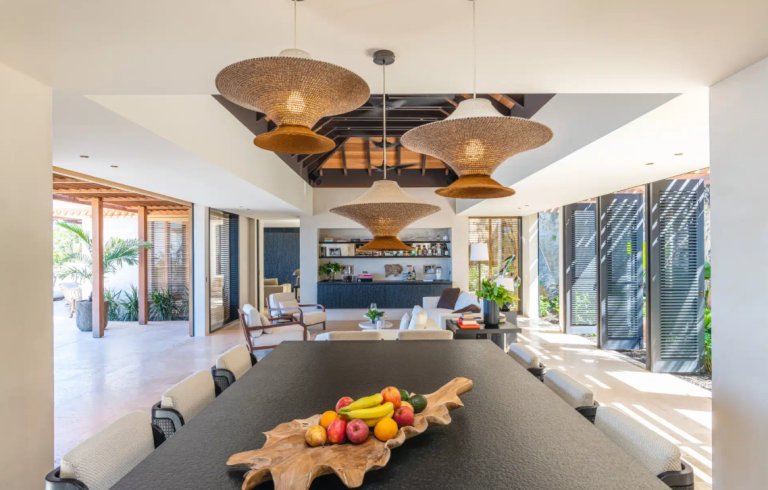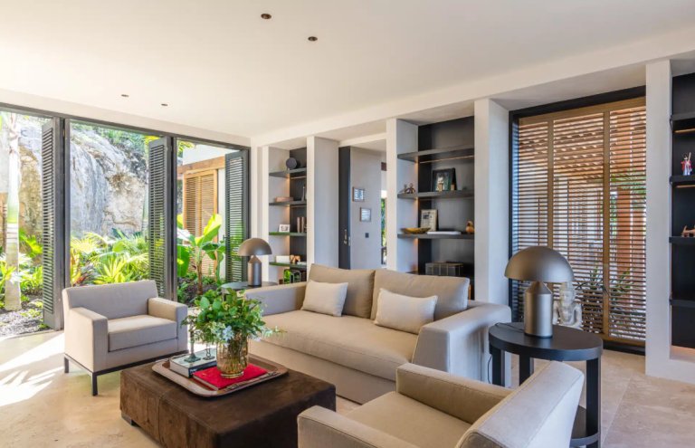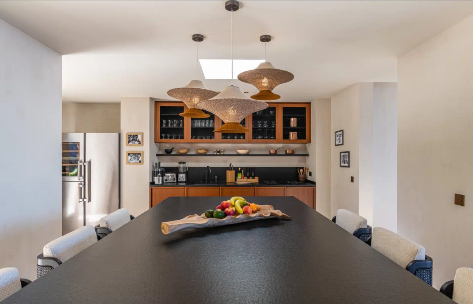 High-end design pieces and bespoke furniture make the newly built Villa Never Say Never (SAY) in Lurin a one-of-a-kind home in St. Barth. The luxury rental property has a sober, slightly masculine feeling, with black accents, louver doors, and travertine stone in the floors and bathrooms throughout. Its convenient location overlooks St. Jean Bay and the airport in the distance.