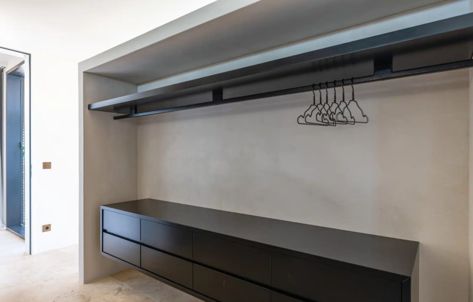 On the first level above the parking, there is bedroom 4. It has a private terrace, a work desk, an ensuite bathroom, and ample storage.