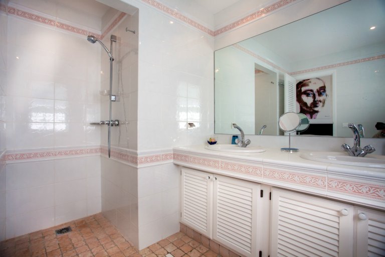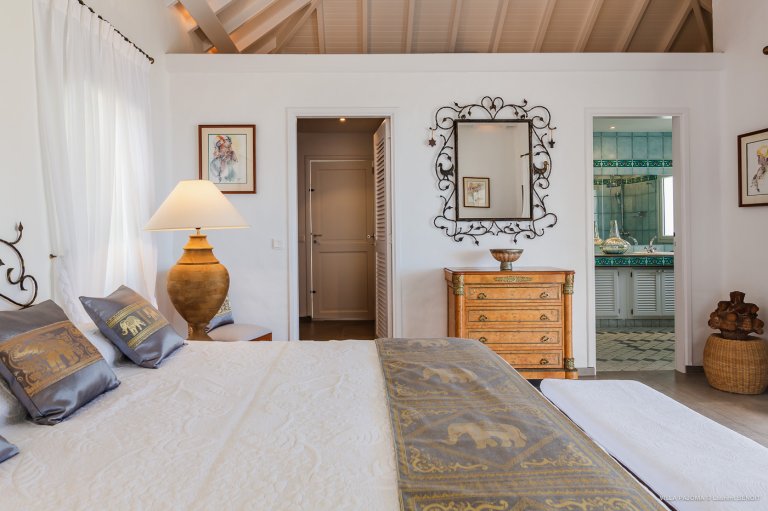 The indoor and outdoor living areas provide seating on large sofas and chairs with white cushions, as well as teak tables and lovely antiques. The two bedrooms are identical, with sliding doors opening to the deck. The bathrooms are decorated with white tiles and raw marble floors.