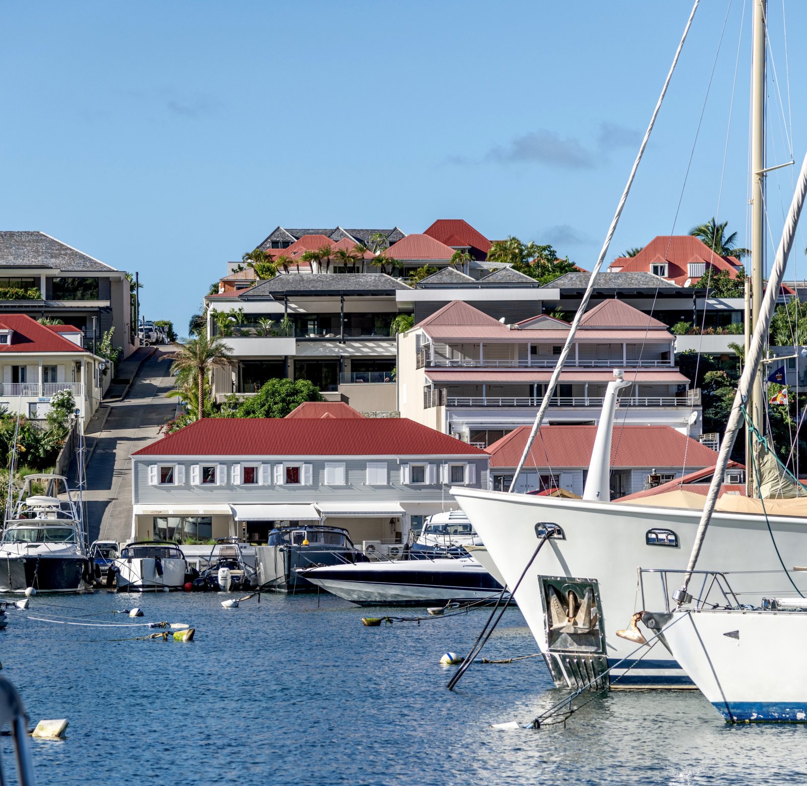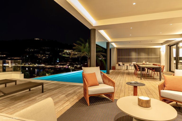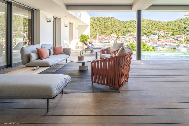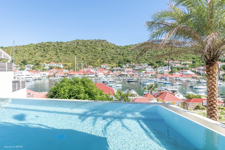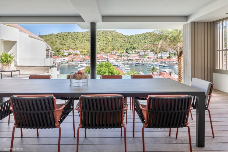 A comfortable base for a family vacation in, the apartment consists of a large living area and a well-equipped kitchen, which is situated so that you can take in the landscape as you prepare meals. (Or the concierge can arrange for a professional to take those duties off your hands.) The large, half-covered terrace has a swimming pool and various sitting areas to enjoy the views over the comings and goings of the boats in Gustavia harbor.
