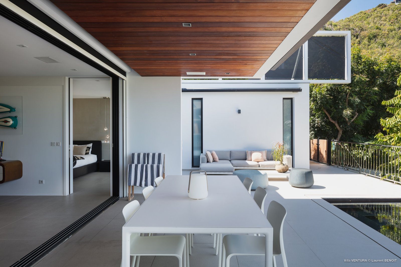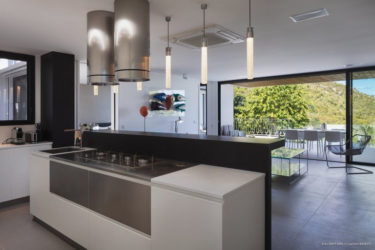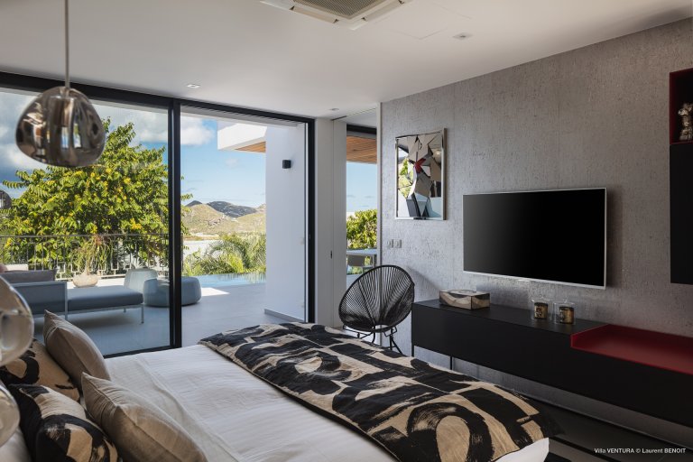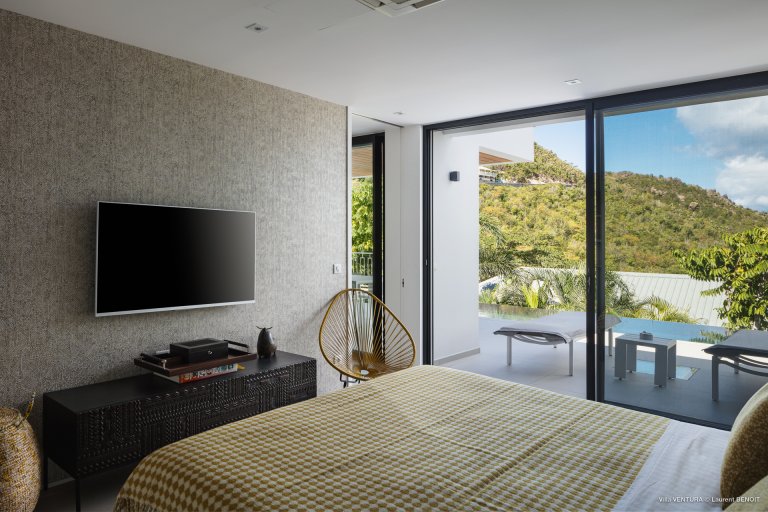 The newly built Villa Ventura (VEN) is a contemporary cocoon full of modern conveniences. The luxury rental property is very conveniently located in Lurin, near the crossroad between Saline and St. Jean, within easy striking distance of some of the island’s most beautiful places. Although its views are mostly of the green hills, you can perceive the sea in the distance.