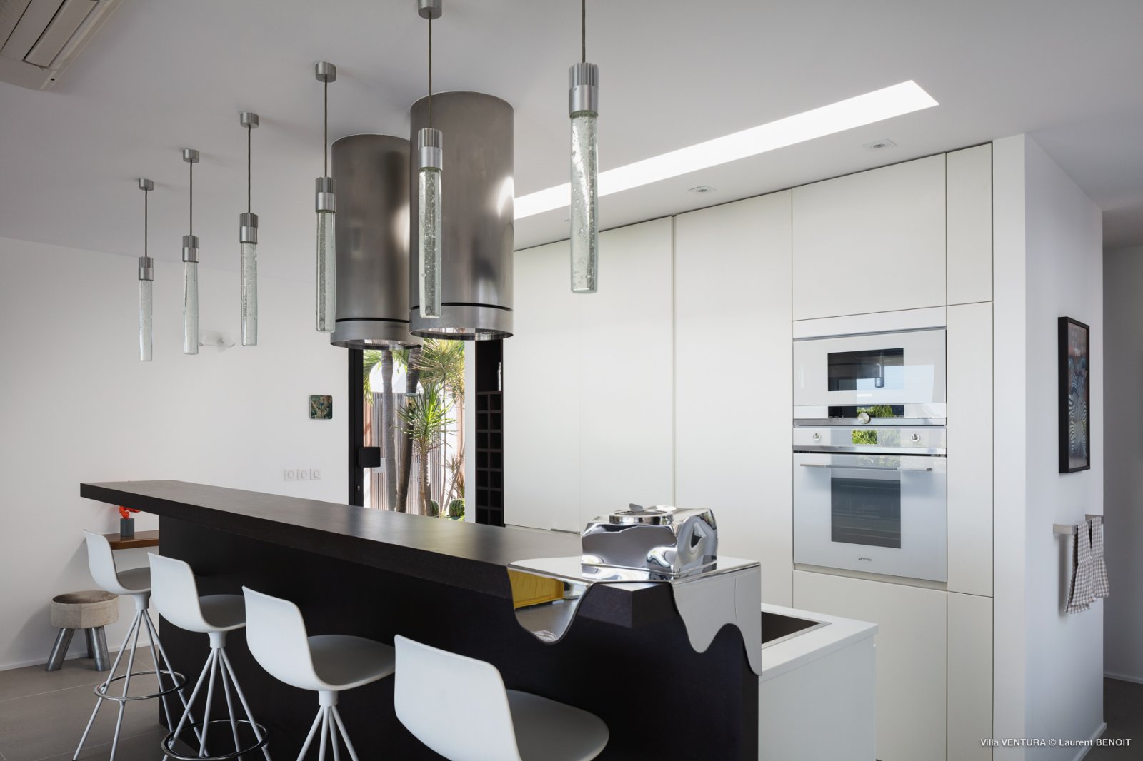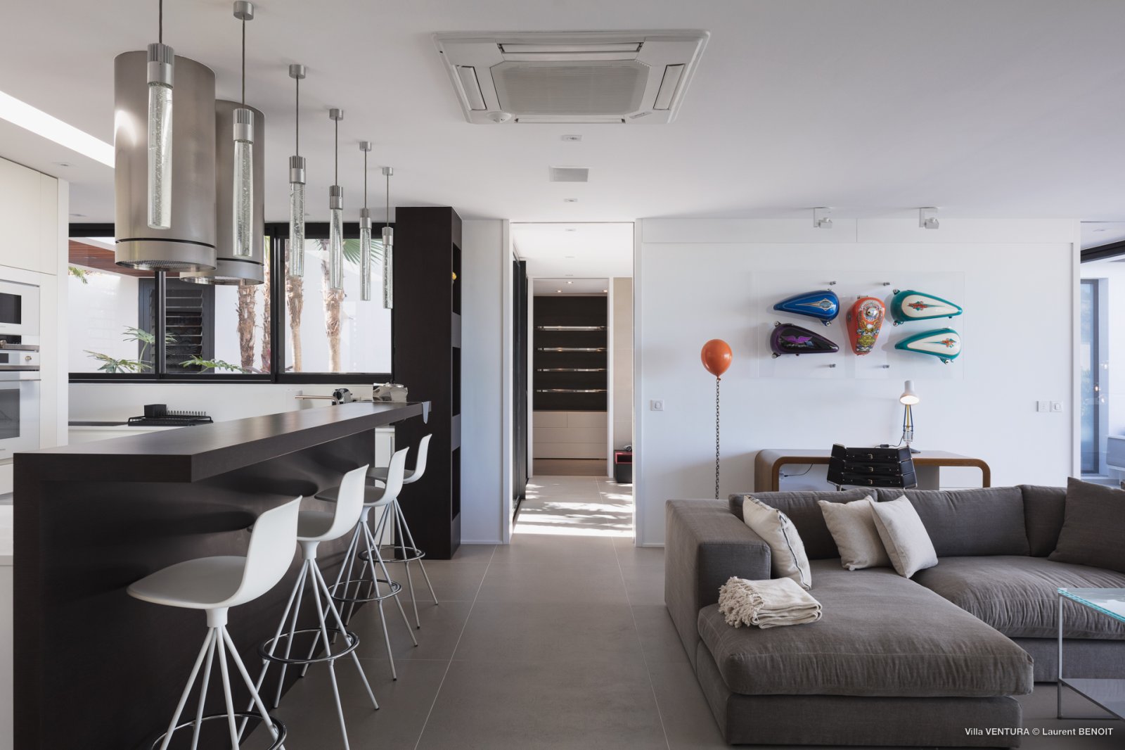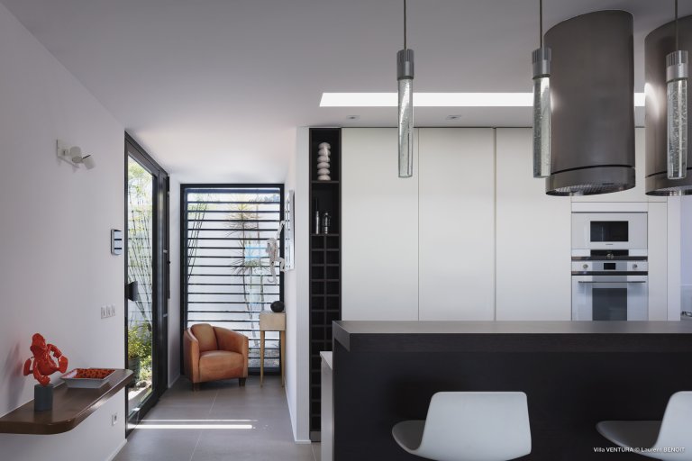 All of the house is laid out on one level. In the center are a spacious living room room and a kitchen with an island that can also serve as a breakfast bar. The main dining table is outdoors, under the shade of a covered section of the terrace.