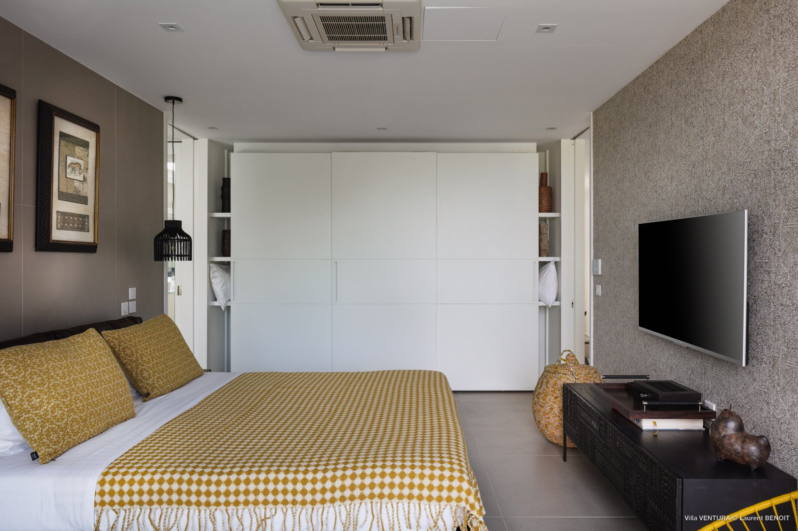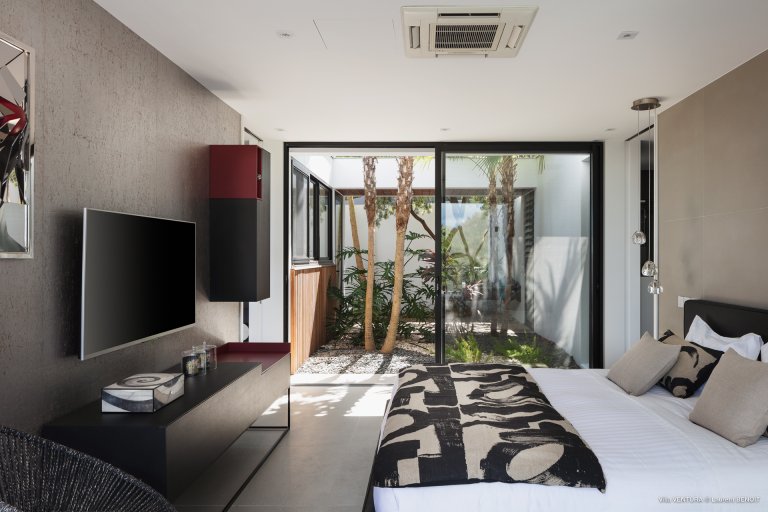 The two bedrooms are on opposite sides of the living room, which enhances their privacy. Each one has an ensuite bathroom and television, and one of them opens to an internal courtyard that brings in more natural light and adds to the sense of connection with nature.