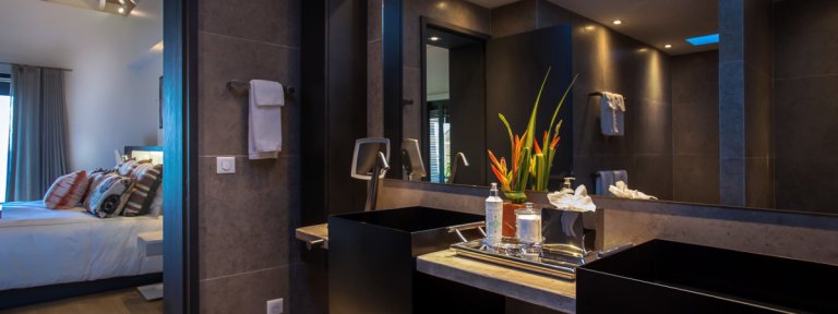 Bed: 2 Twin Beds w/Option as King Bed • En-Suite Bath with Dual Vanity • Flat-Screen TV • Direct Access to Terrace