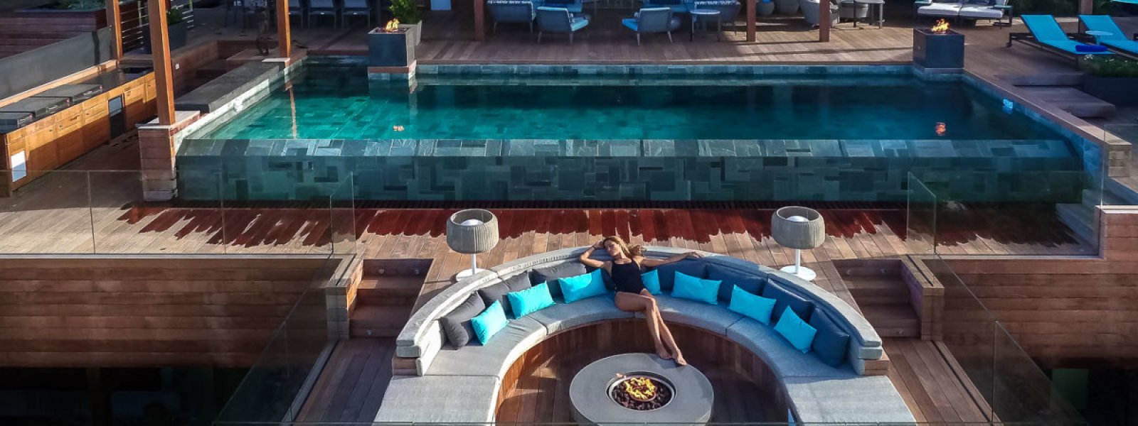 Fully Furnished Terrace • Multiple Seating Areas • Infinity Pool • Chaise Lounges • Outdoor Kitchen • Built-In BBQ • Outdoor Dining Table - Seats 10 • Fire Pit • Bar Seating • Pizza Oven
