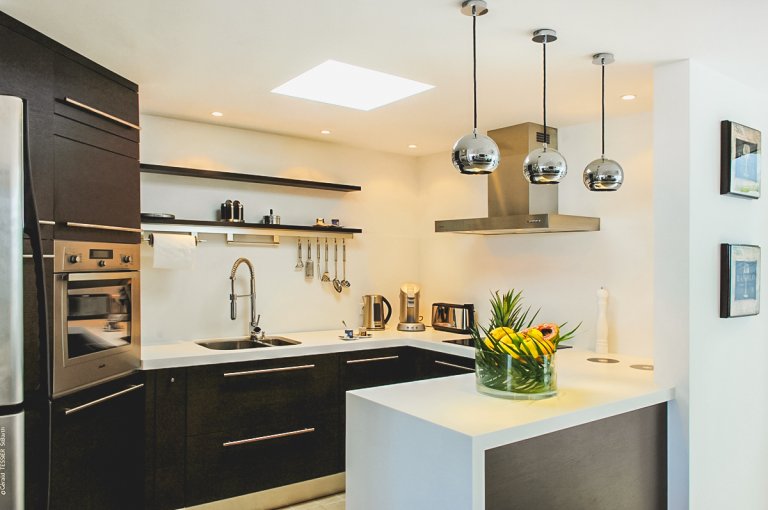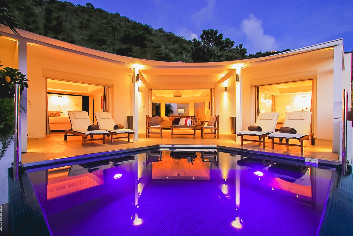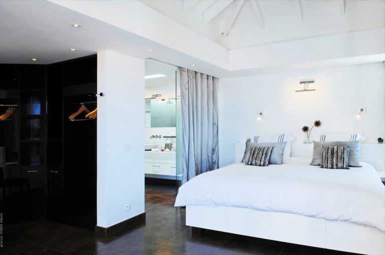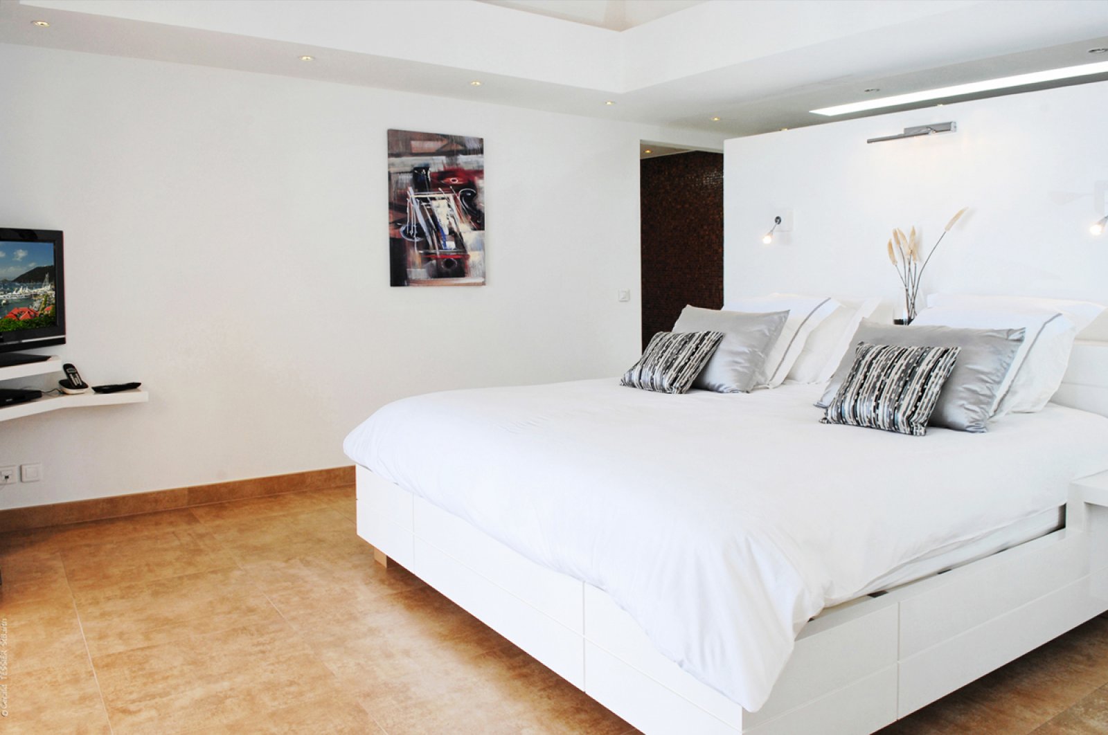The living room, well-equipped kitchen and dining room share the same room and open onto the terrace, pool and view. Located in each side of the living room, the two bedrooms with king beds and ensuite bathrooms also connect directly to the terrace and pool. Both are spacious and decorated in a contemporary style with modern amenities.