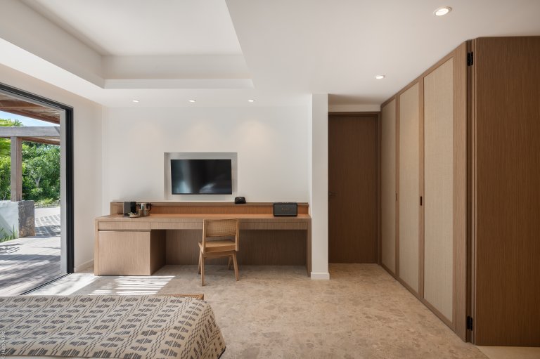 The villa comprises a large open-air living area with a dining section and a table that seats ten people. Behind this central gathering space there is is an air-conditioned kitchen with a breakfast bar and a smaller, round dining table. This kitchen is fully equipped and filled with natural light, making it an appealing place for those who love cooking and spending time with their loved ones. (Of course, for those who don’t enjoy cooking, the St. Barth concierge can organize a private chef, among other services.) The kitchen connects to a cozy TV room.