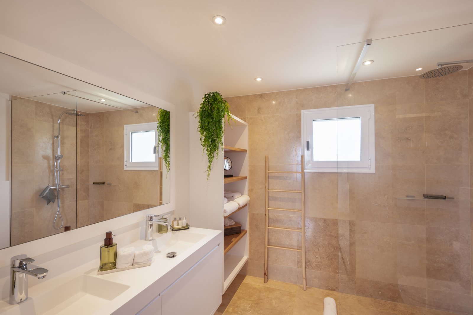 Likewise, the bedroom is elegant in its simplicity, and it has a euro king-size bed and an ensuite bathroom with a rain shower. Both the bedroom and kitchen are air-conditioned. The villa has ample parking and easy accessibility, as it is all designed over one level.