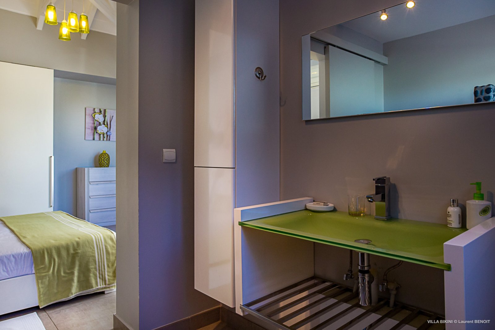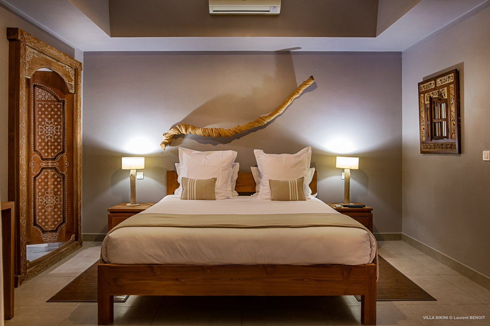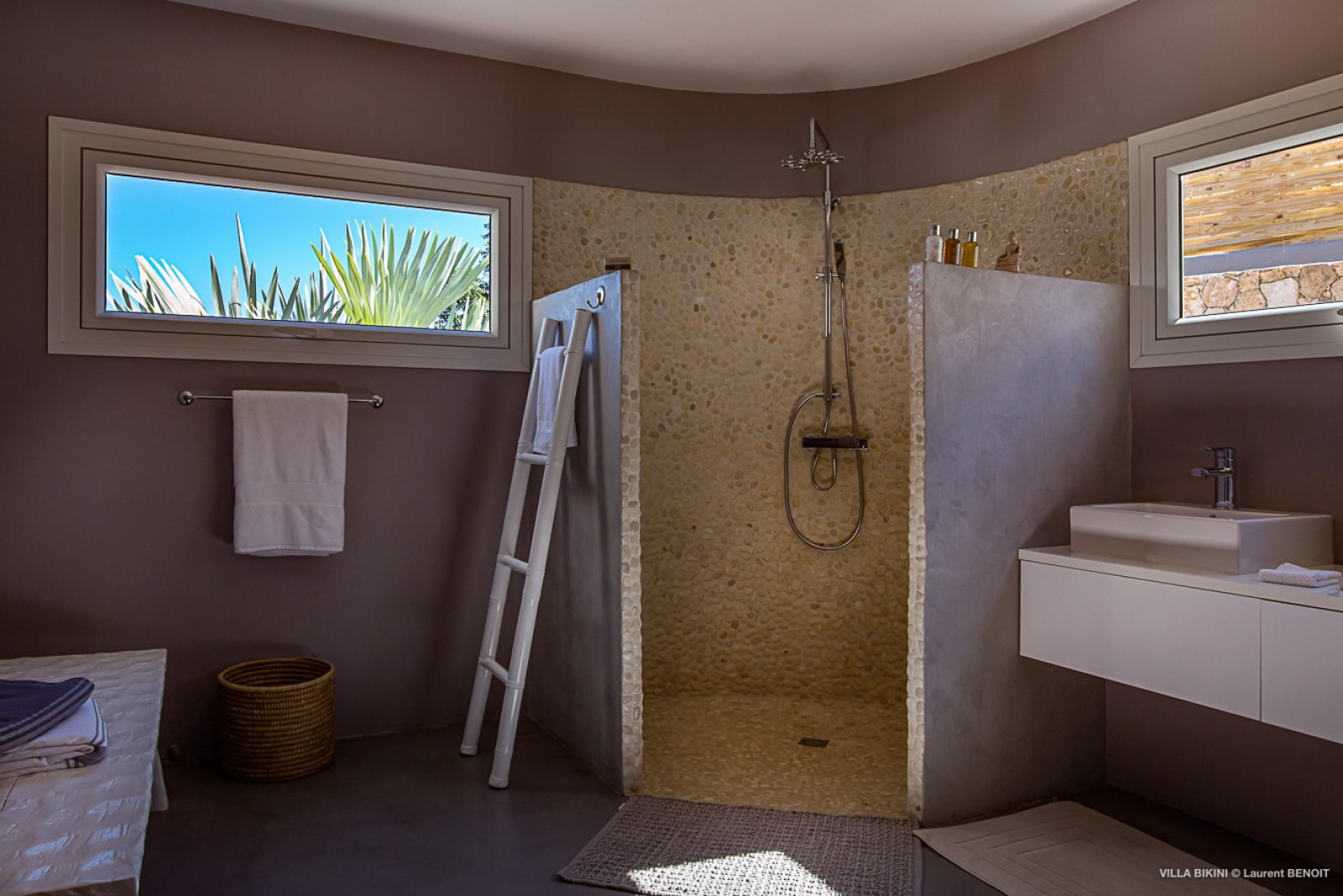 Two of the bedrooms are on the pool level, and these are connected by a corridor. They both have aesthetically pleasing details, ensuite bathrooms, and access to the terrace. One has a stunning view over the pool and the bay below. A few steps down from the pool deck, the third ensuite bedroom occupies a separate bungalow and has its own private entrance.