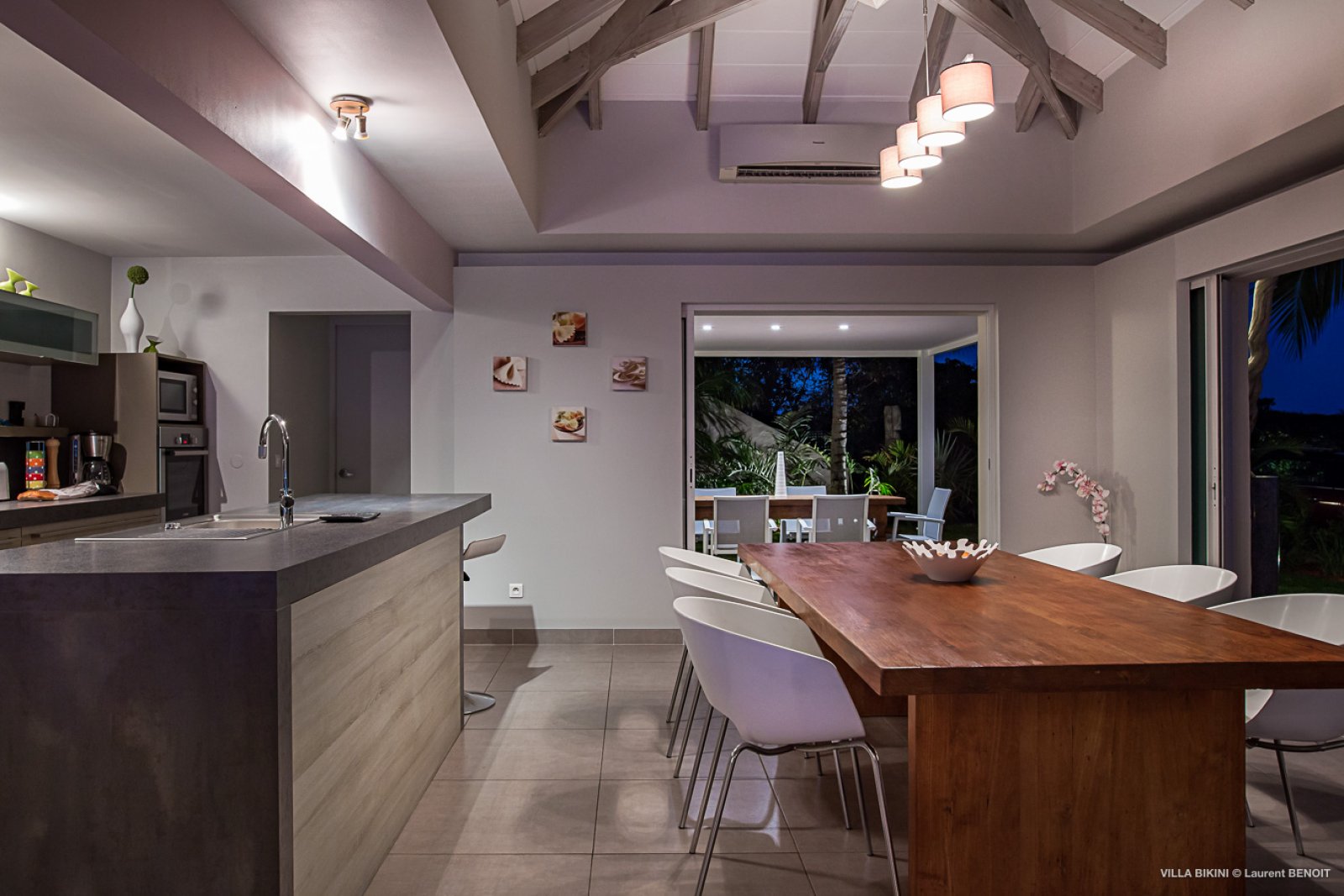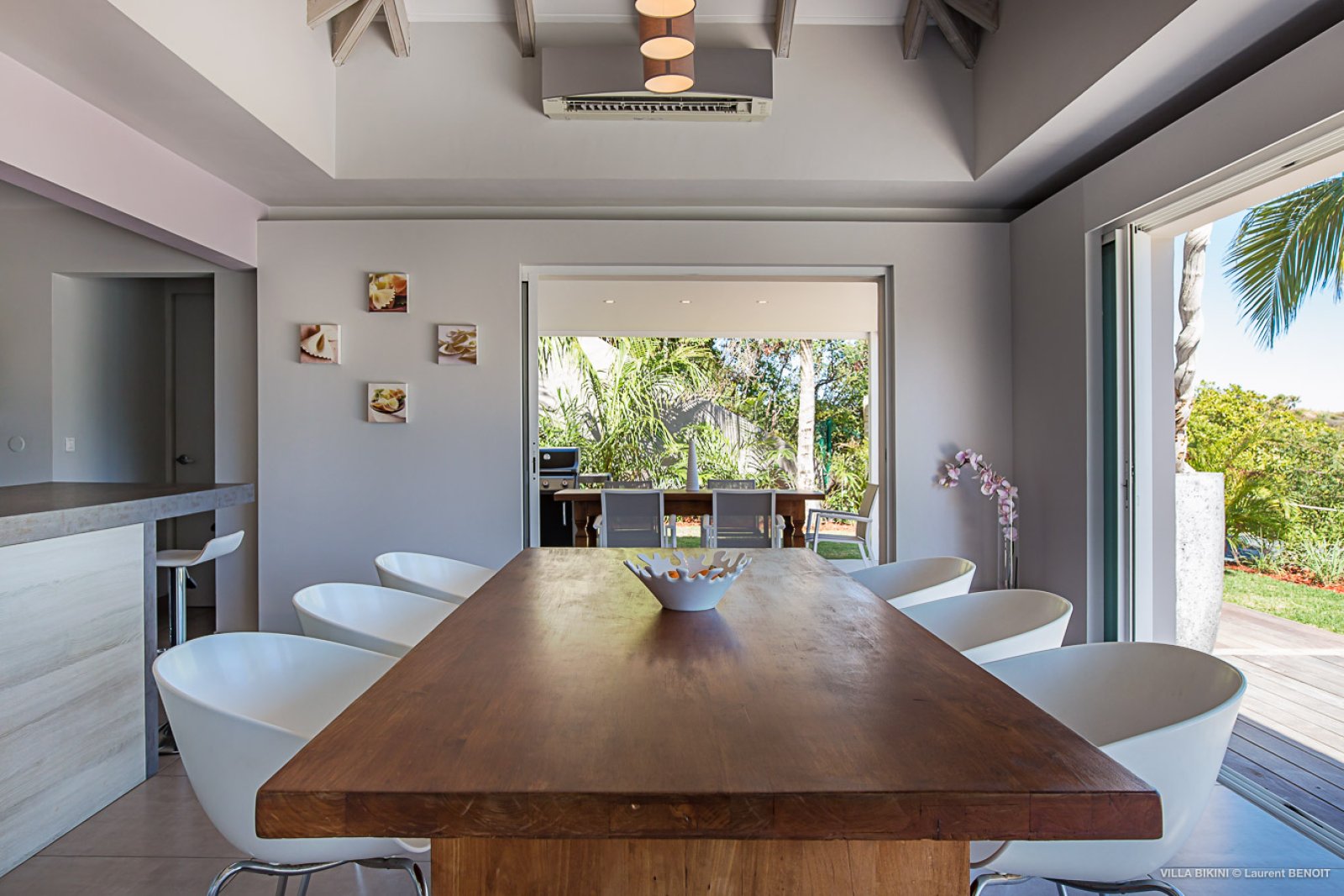 The open-plan layout makes for easy living. The comfortable living area and efficient kitchen are delineated by a stand of twisting, whitewashed branches, but the conversation flows easily throughout the shared living space. This main area is air-conditioned but can be opened up to let in the Caribbean breezes. Along with the indoor dining table, there is a second table outside, along with a grill.