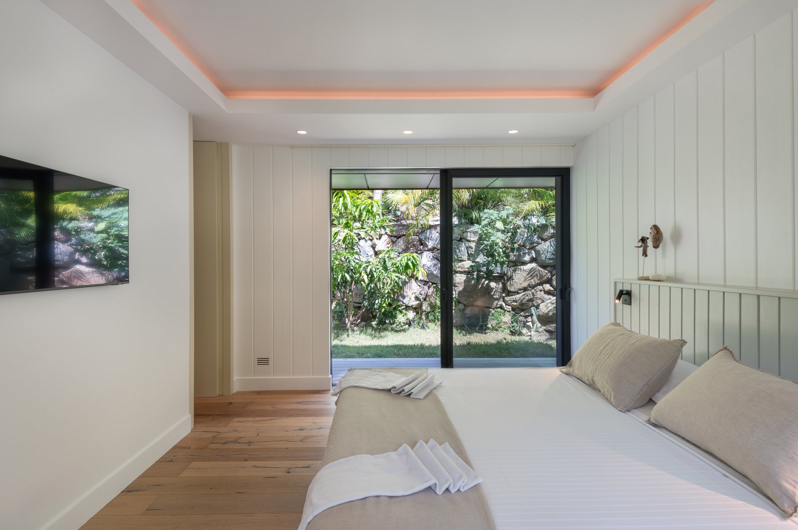Bedroom 1 faces the pool, while Bedroom 2 is set just behind it. Both are fully air-conditioned and designed in a clean, contemporary style that blends comfort with understated elegance.