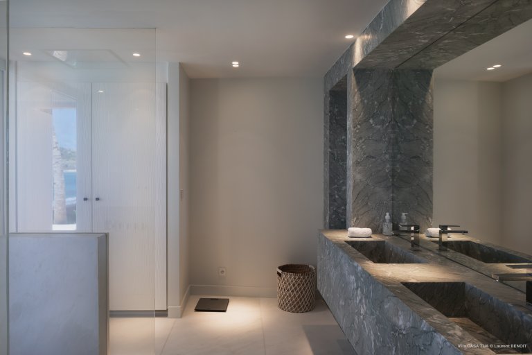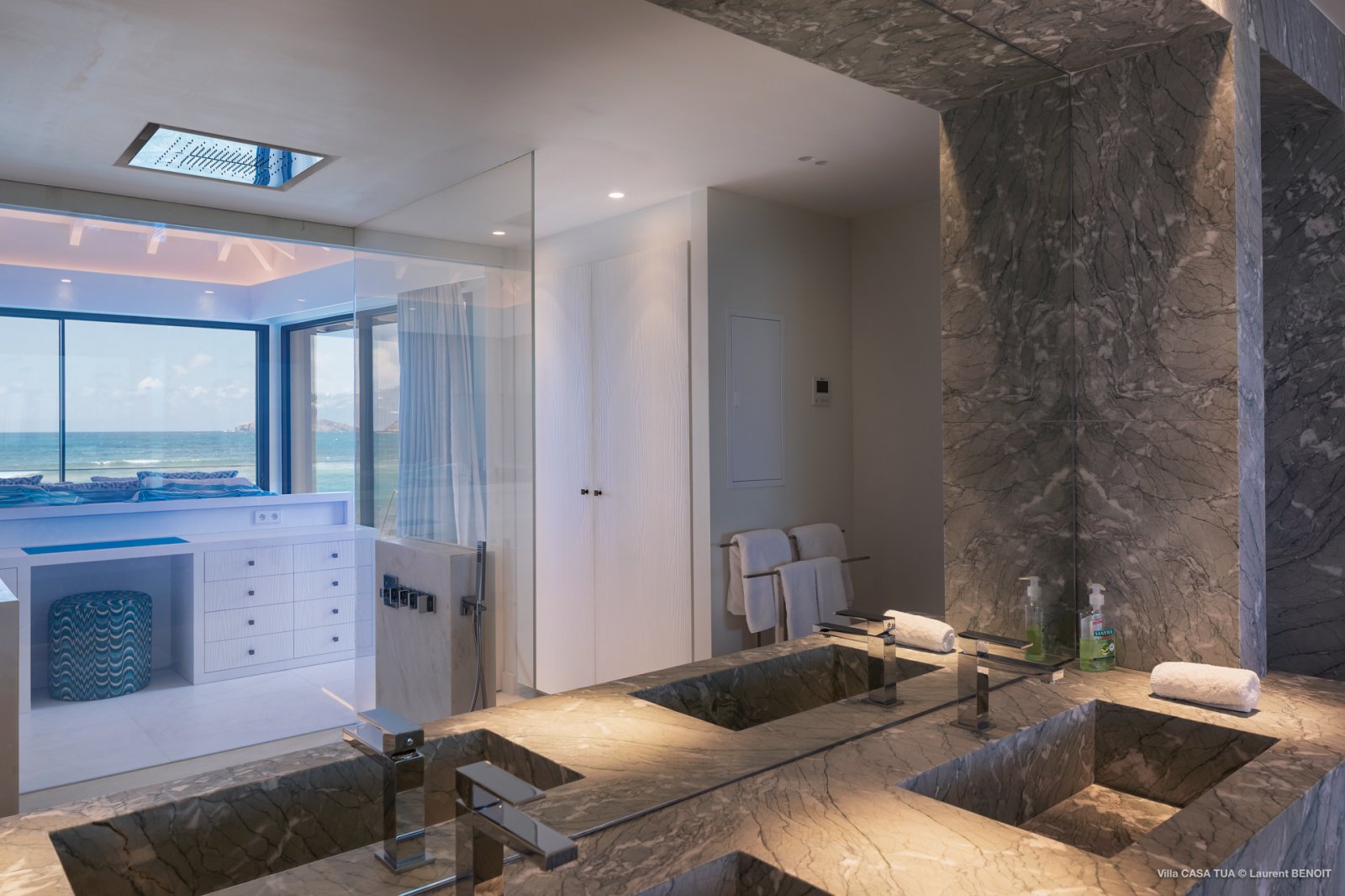 Two of the four bedrooms face the ocean and have unobstructed views of the beach from their floor-to-ceiling windows. You can fall asleep to the sound of the waves. In the morning, you can wake up with a dip in the turquoise sea.