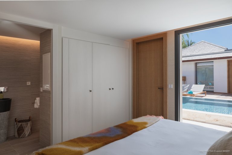 The remaining two bedrooms are in the back of the villa and have access to the pool area. Their layout and design are more cozy and have a private, cocoon-like feeling. Each bedroom has an ensuite bathroom and television.