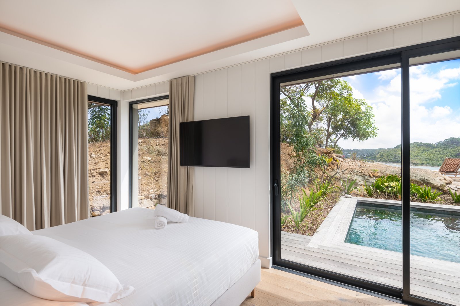 Bed: King Bed • En-Suite Bath with Rainfall Shower • TV • Air Conditioning • Direct Access to Deck and Pool • Ocean View