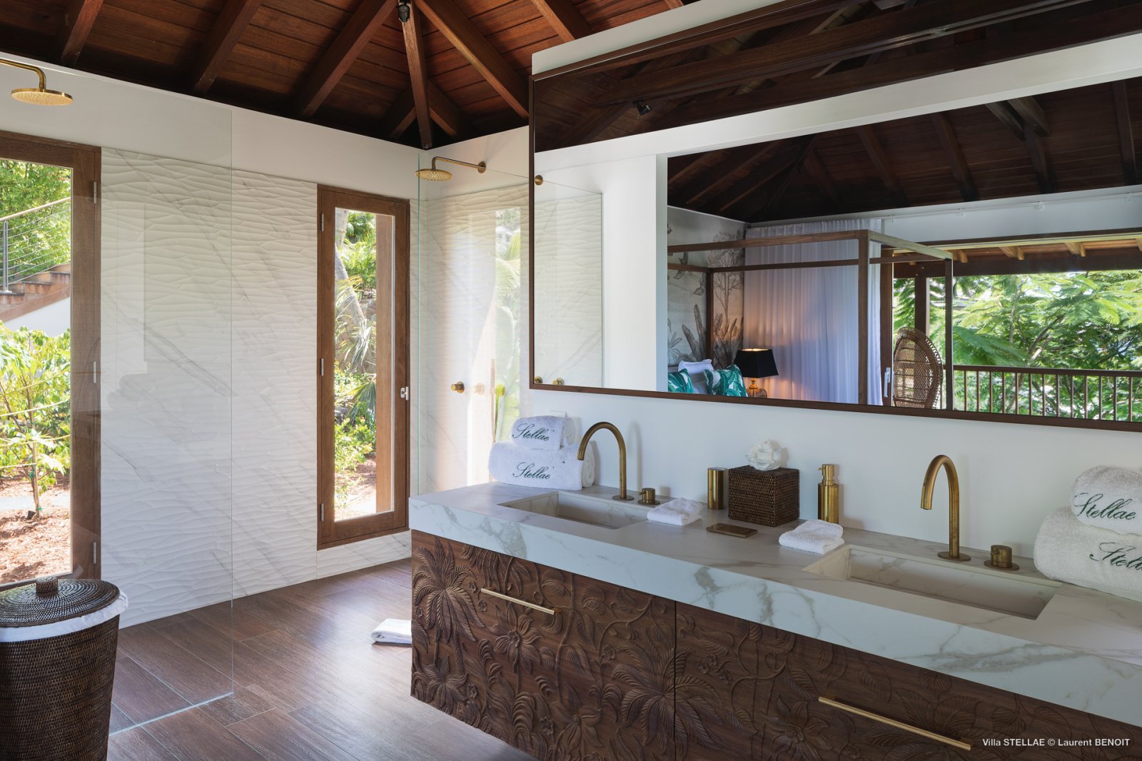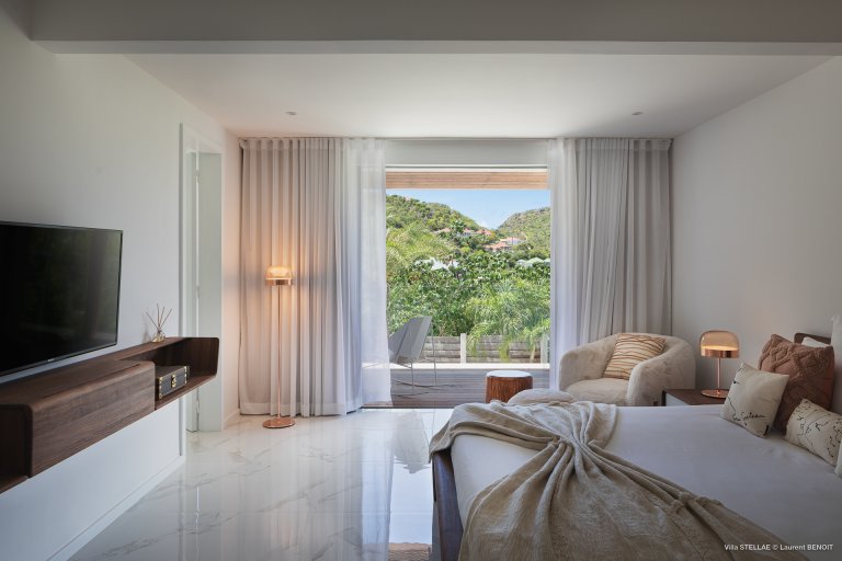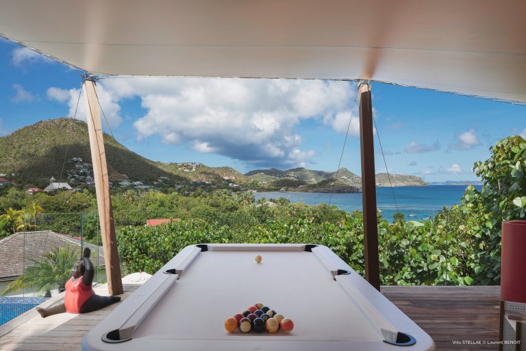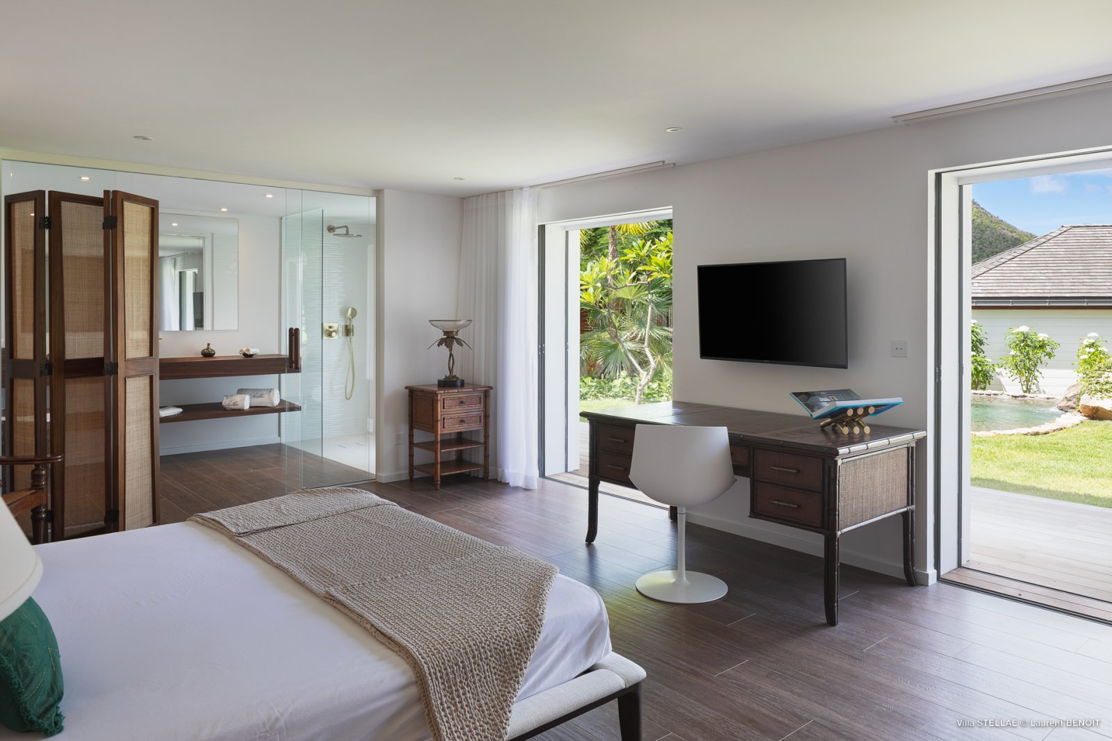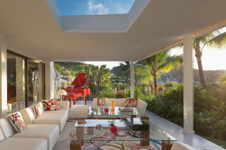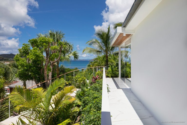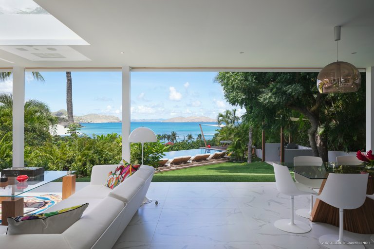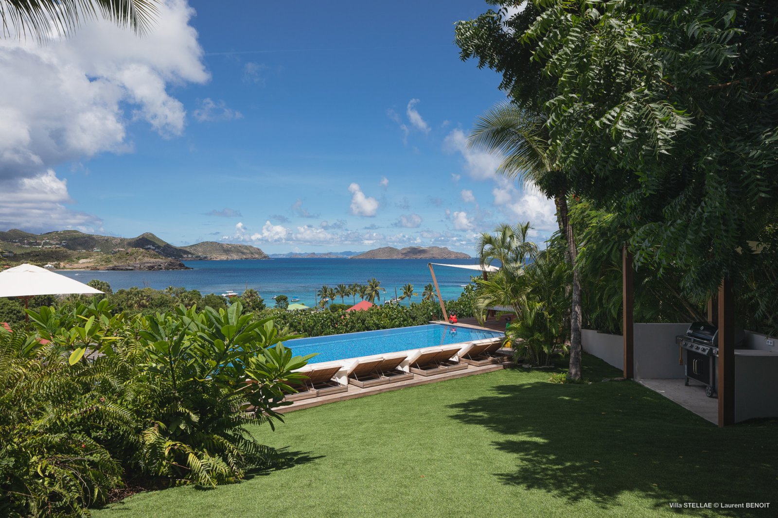 Ideally located on the western Camaruche hillside over Lorient Bay, Villa Stellae (CML) stands out as one of the most remarkable new properties on the island, combining high-quality craftsmanship and contemporary design with numerous features and conveniences. The spacious and comfortable living room is fully air conditioned and looks out through sliding glass doors at the expansive tropical gardens and spectacular ocean view. The chef's kitchen adjoins the living and indoor dining areas, and provides the latest in technology and efficiency.
