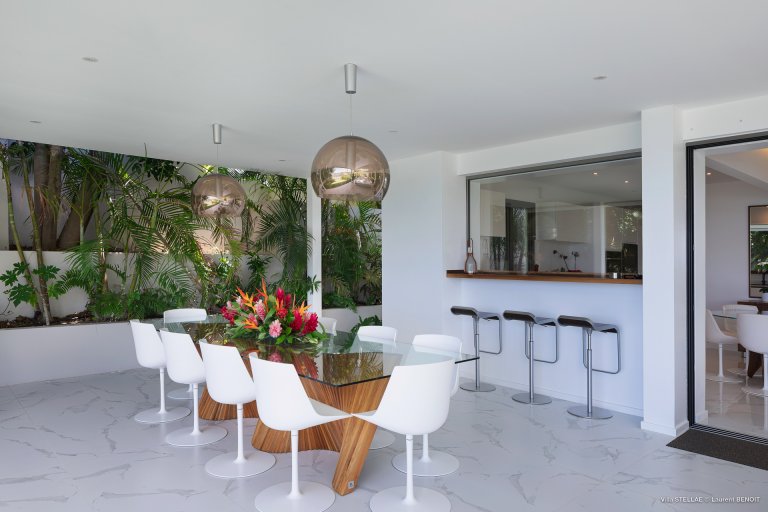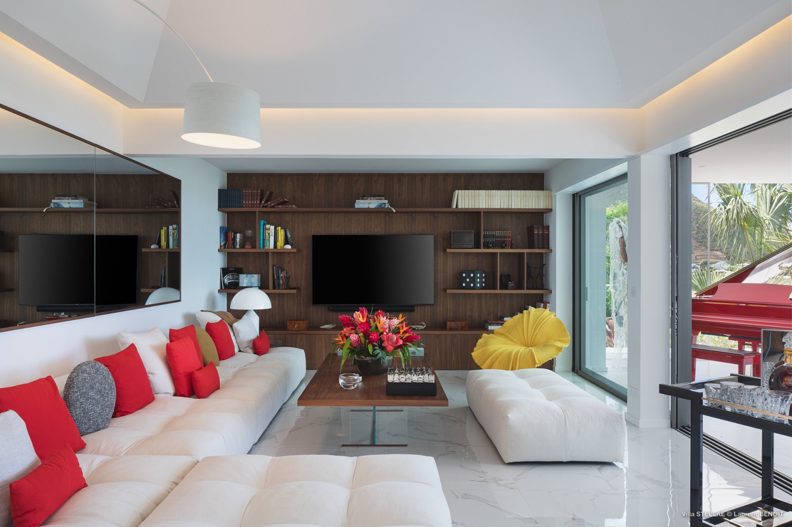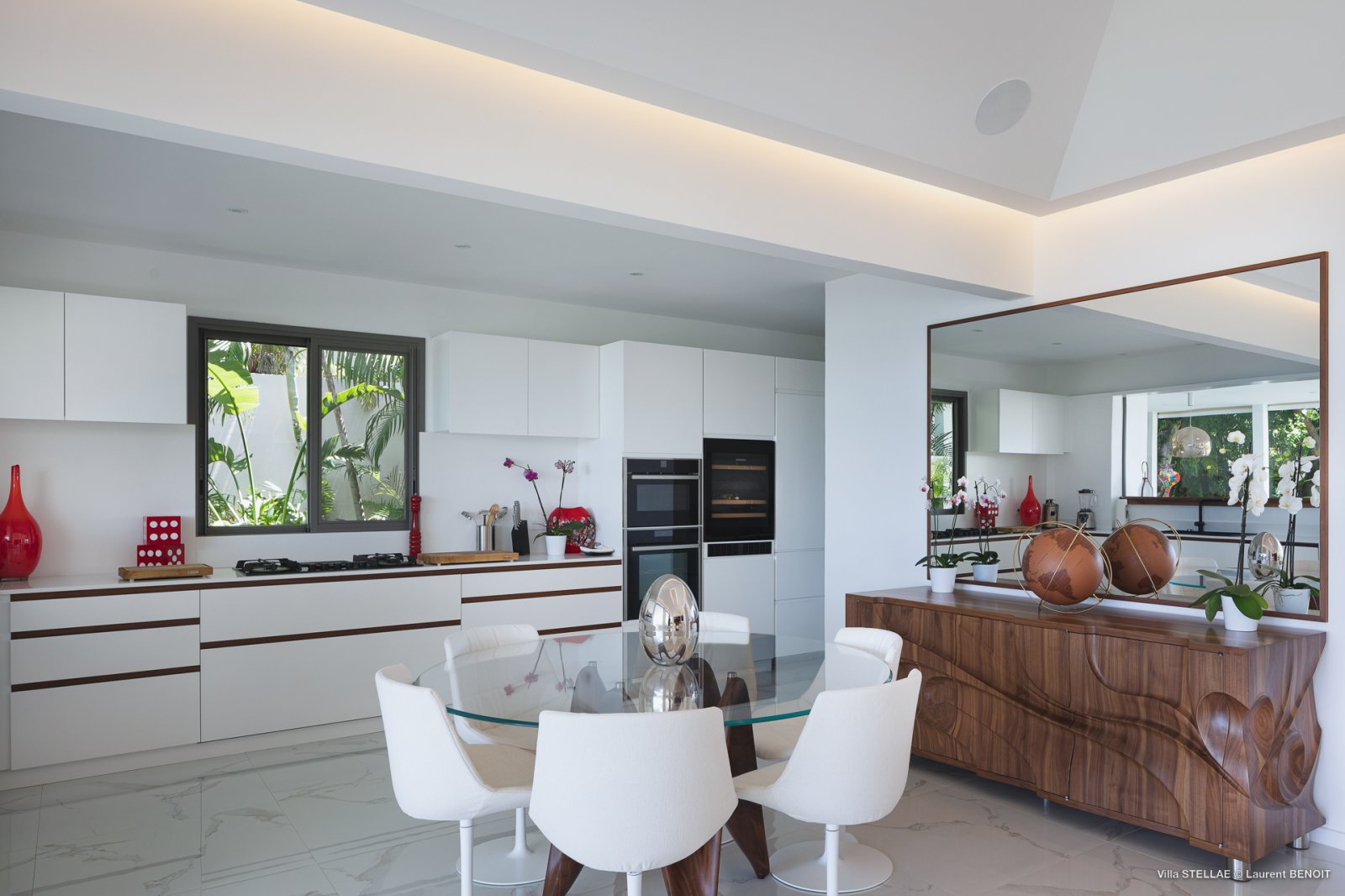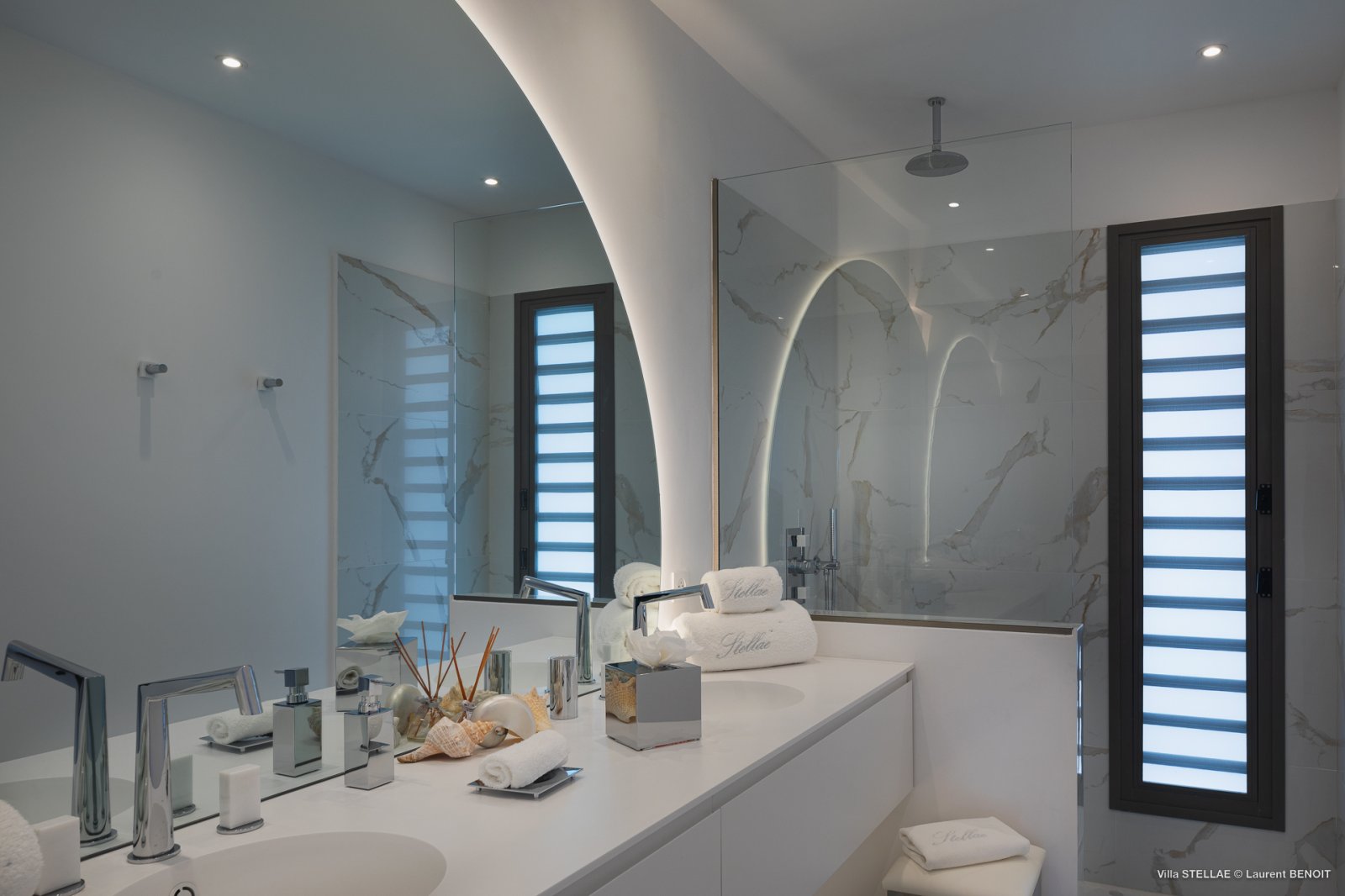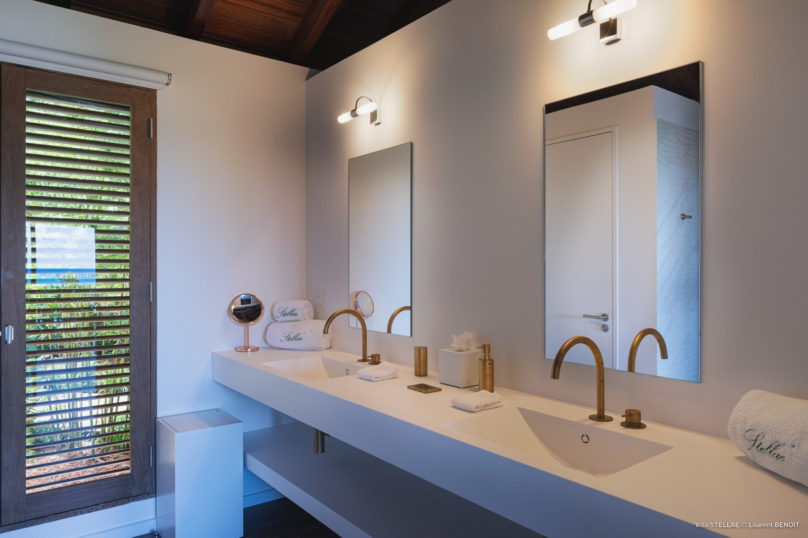 Ideally located on the western Camaruche hillside over Lorient Bay, Villa Stellae (CML) stands out as one of the most remarkable new properties on the island, combining high-quality craftsmanship and contemporary design with numerous features and conveniences. The spacious and comfortable living room is fully air conditioned and looks out through sliding glass doors at the expansive tropical gardens and spectacular ocean view. The chef's kitchen adjoins the living and indoor dining areas, and provides the latest in technology and efficiency.