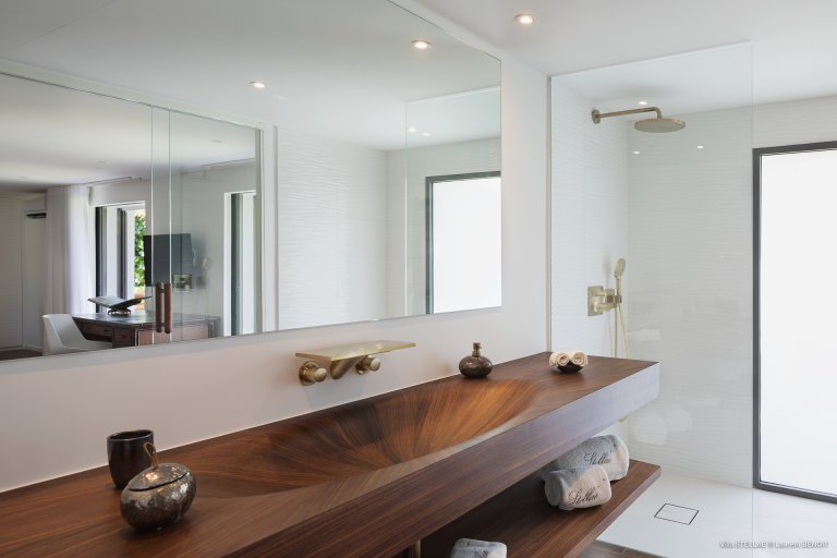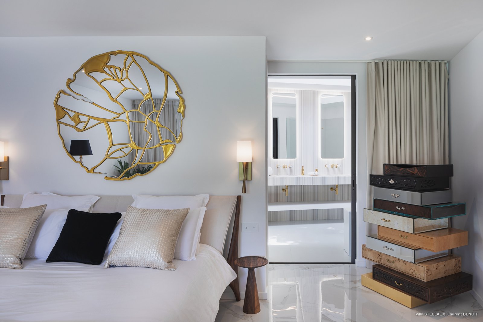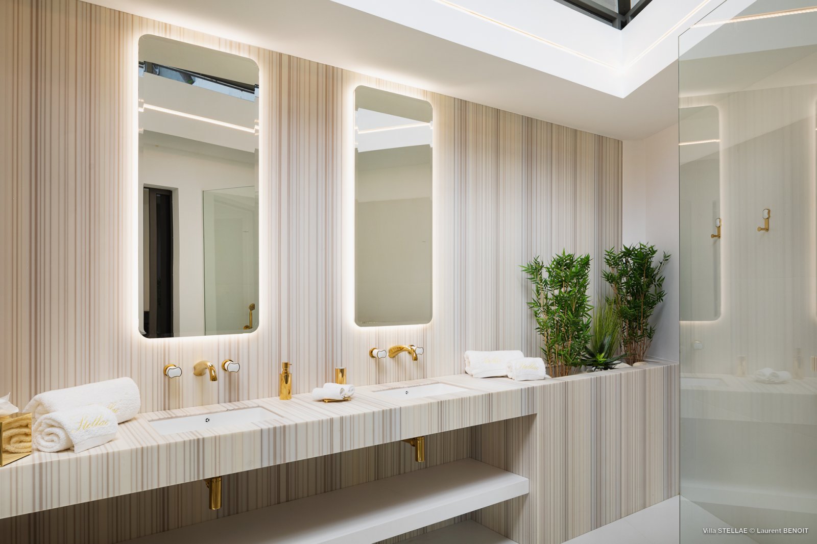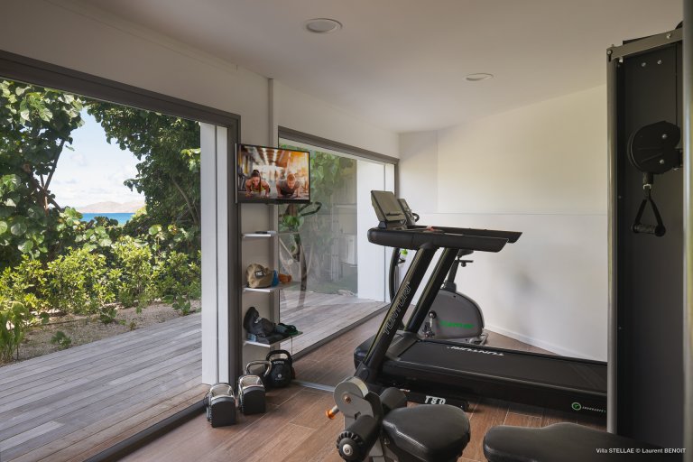 The four bedrooms on Villa Stellae' upper level are equal in size and luxuriously furnished, giving their guests the comforts of sumptuous king beds, rain-head showers, pleasant views and privacy. At the level of Villa Stellae' lower garden, the fifth bedroom is actually an inviting independent apartment with its own kitchenette and dining area, king bed, leather sofas and ensuite bath. The nearby air-conditioned fitness room offers a full range of professional equipment as well as an HDTV and a view of the garden and sea.