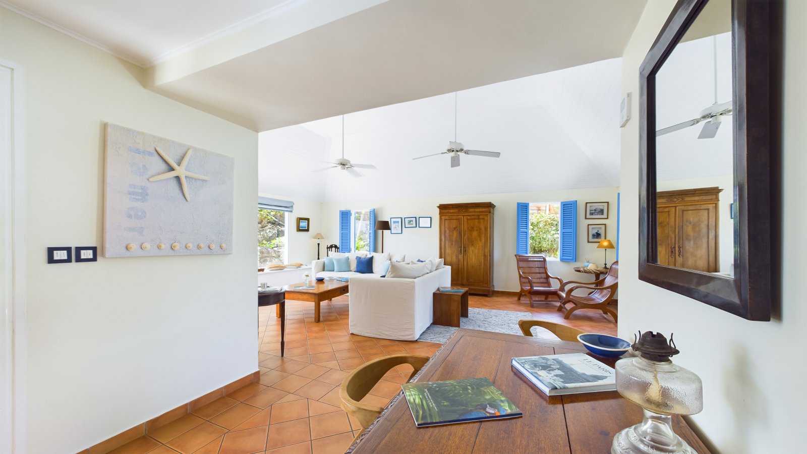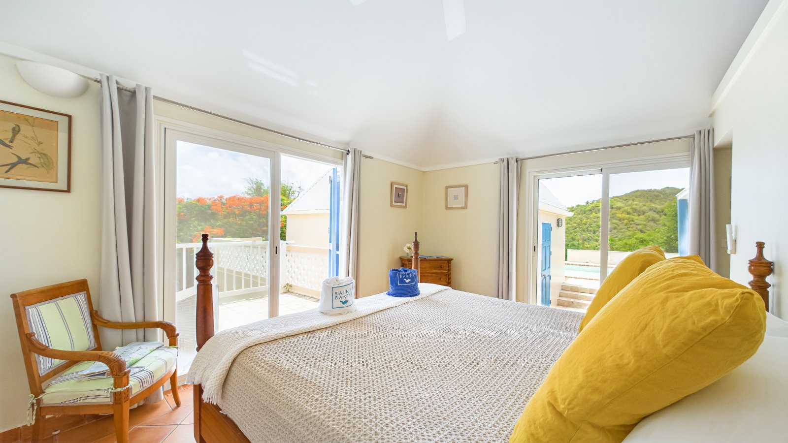Surrounded by flowering purple bougainvillea and yellow frangipani, Villa Boa answers this tropical profusion of colors with bursts of blue: turquoise, azure, powder, and sky. With a view over St. Barth's green hillsides and the Atlantic in the distance, this relaxed and comfortable home will put you in a state of vacation bliss.