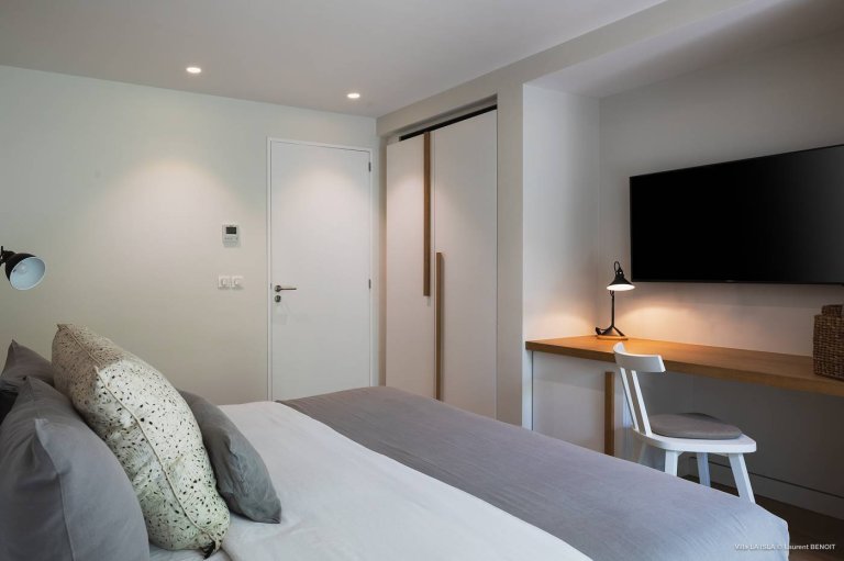 On the opposite side of this upper level, the master bedroom has a large dressing room and ensuite bathroom. Both the bedroom and the shared living areas open onto the sundeck, shaded terrace, and heated swimming pool.