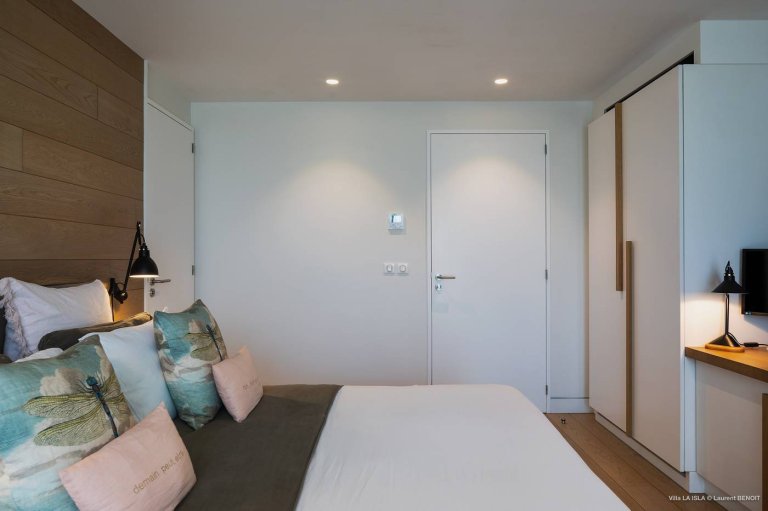 Inside, a modern grand staircase leads down to the residential level, where four additional bedrooms are arrayed. Each one has its own ensuite bathroom and direct access to small patios outside. All five of the bedrooms have European king-size beds, air-conditioning, and a full array of entertainment options.