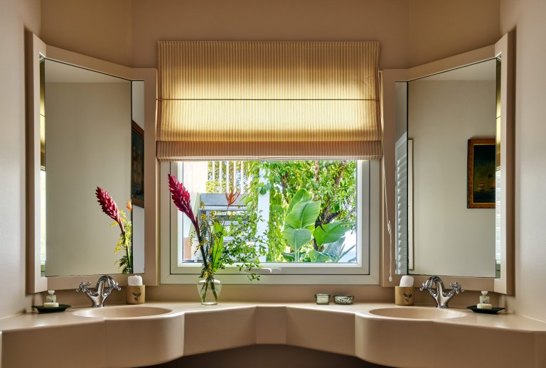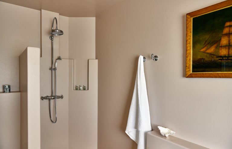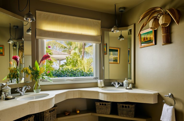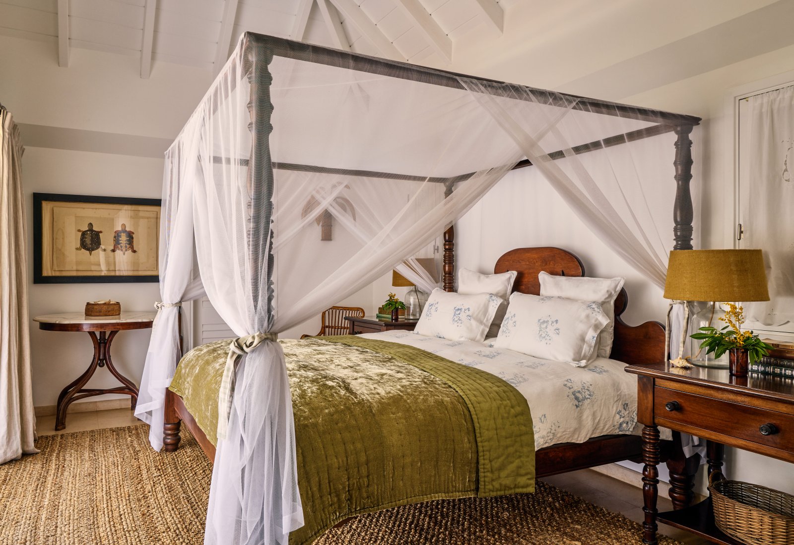 The three bedrooms are equal in size and have ensuite bathrooms. Two of them are on opposite sides of the living quarters, and the third is downstairs and has a separate entrance from outside. The upstairs rooms have king-size four-poster beds with nets for a truly Caribbean feeling, and the downstairs room has a European king-size bed. All of the bedrooms and even their bathrooms have sea views, as well as air-conditioning and screened windows for those who prefer to sleep in the fresh air.