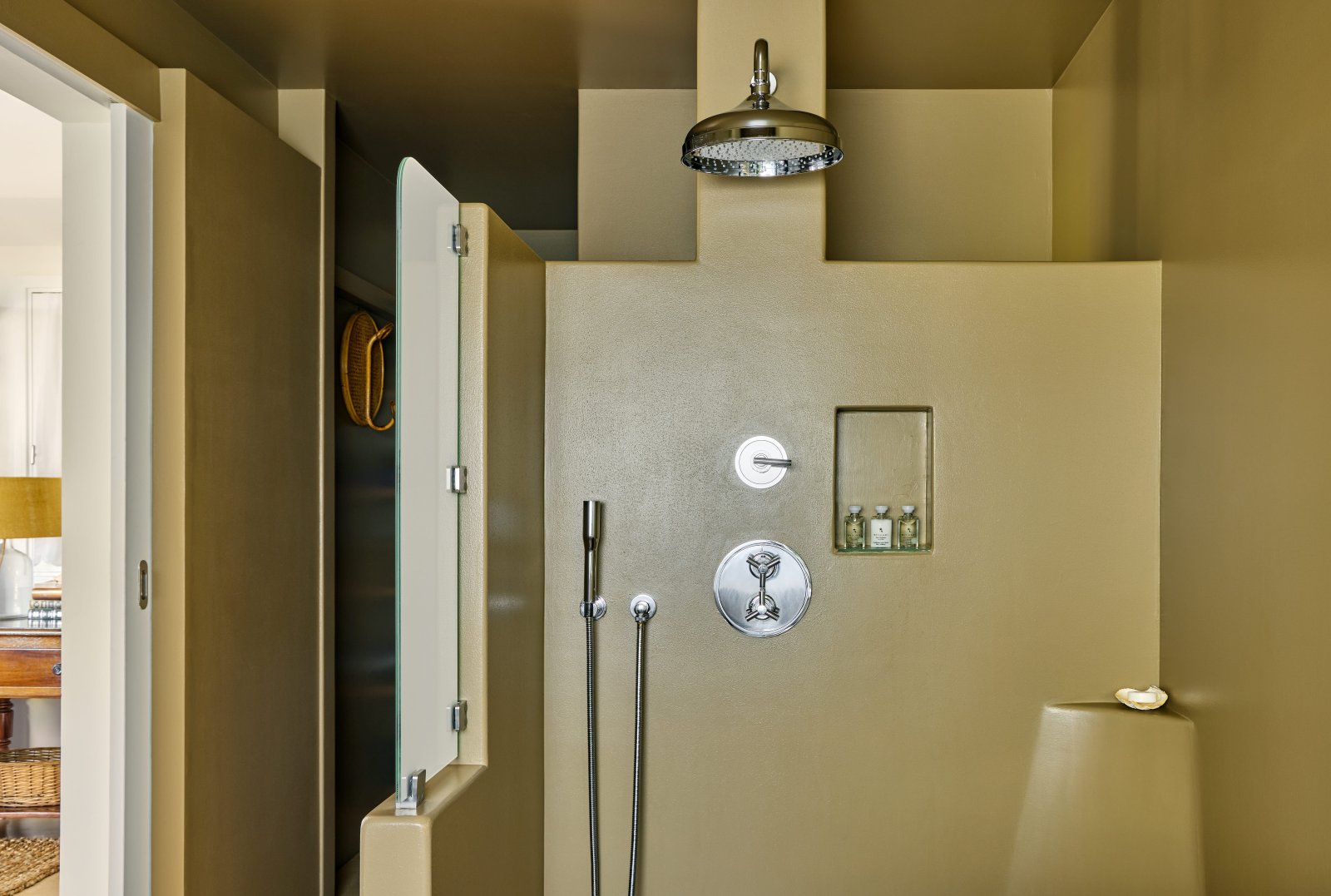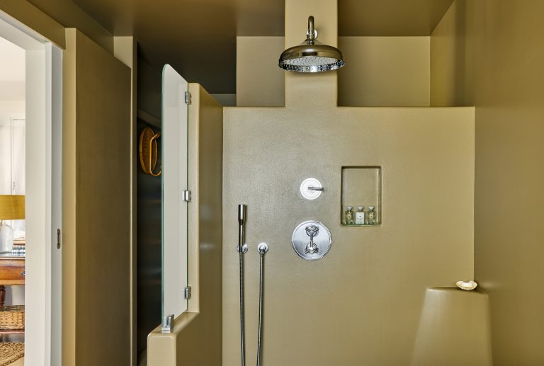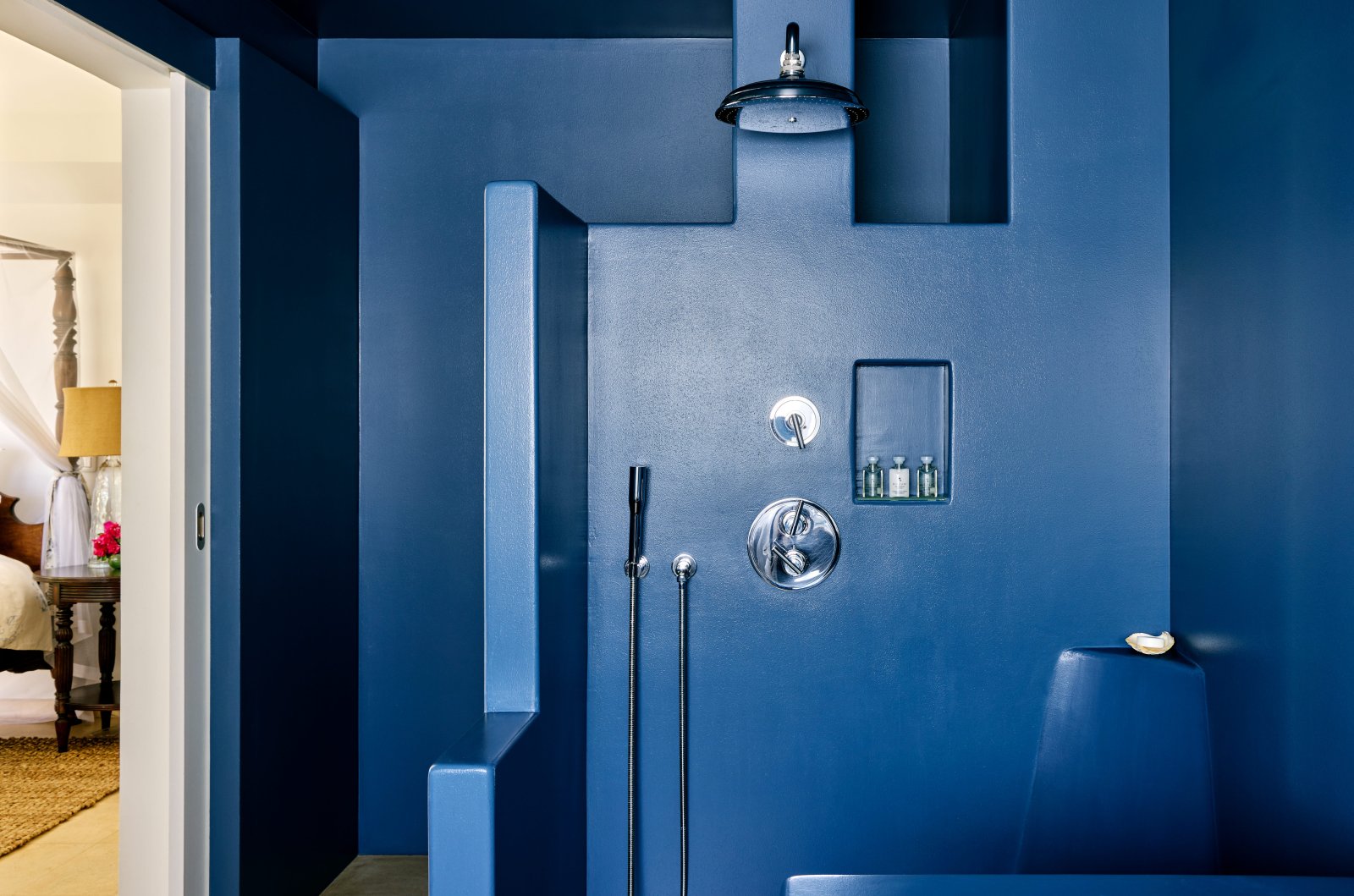 The villa has a contemporary, open-plan living area and kitchen. This has comfortable sofas, a Frame TV and Sonos sound system, and a fully equipped traditional kitchen. A highlight in the kitchen is the reverse-osmosis water filtering system, which eliminates the need for plastic bottles. The space can be either fully air-conditioned or opened on two sides, allowing for island breezes and a closer connection with the greenery in the back and the views in the front.